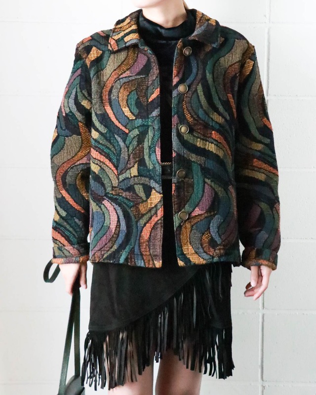 BRAND【ー】 SIZE 【ー】肩幅:約47cm /袖丈:約62cm/身幅 : 約53cm / 着丈 : 約63cm 付属品 【ー】 素材 【アクリル40%、ポリエステル36%、他24%】 状態 【USED】 MEMO そこそこ厚手ゴブラン織のジャケットが入荷。 ブラックベースにマルチカラーの模様があそび心とシックな雰囲気をうまくミックスした、まさにヴィンテージならではの個性ある一着。オーバーサイズのシルエットはインナーも合わせやすく、これからの季節に大活躍します。 Made in USA 着用スタッフ身長163cm ▲Shipping International is AVAILABLE ▲こちらの商品は店頭商品として同時販売しております。 ご注文頂いた時点で商品が欠品している可能性もございます。 自動で送信されるご注文メールの後に、再度在庫を確認後、 商品が欠品していた場合は[email protected]より 『商品欠品メール』をお送り致します。 その場合いただいたご注文はキャンセルになりますのであらかじめご了承のほどお願い致します。 ▲新品商品ではございません。 ▲寸法には、多少の誤差がある場合がございます。 特に伸縮性のある素材やデザインのものについては目安としてお考えください。 各商品のサイズや状態をもっと詳しくお知りになりたい場合は、お気軽にお問い合わせください。 ▲当店で扱う古着、古物につきまして、経年に伴う変色やキズ等は、返品の対象及び不良品となりません。一見して目立つものは説明文や写真で紹介していますが、当店で目立たないと判断したものは説明を省いています。 古着特有の雰囲気や魅力ををご理解いただいた上でご注文願います。 こちらの商品に関するお問い合わせは VINIVINI LUXE 03-6416-3822までお願い致します。