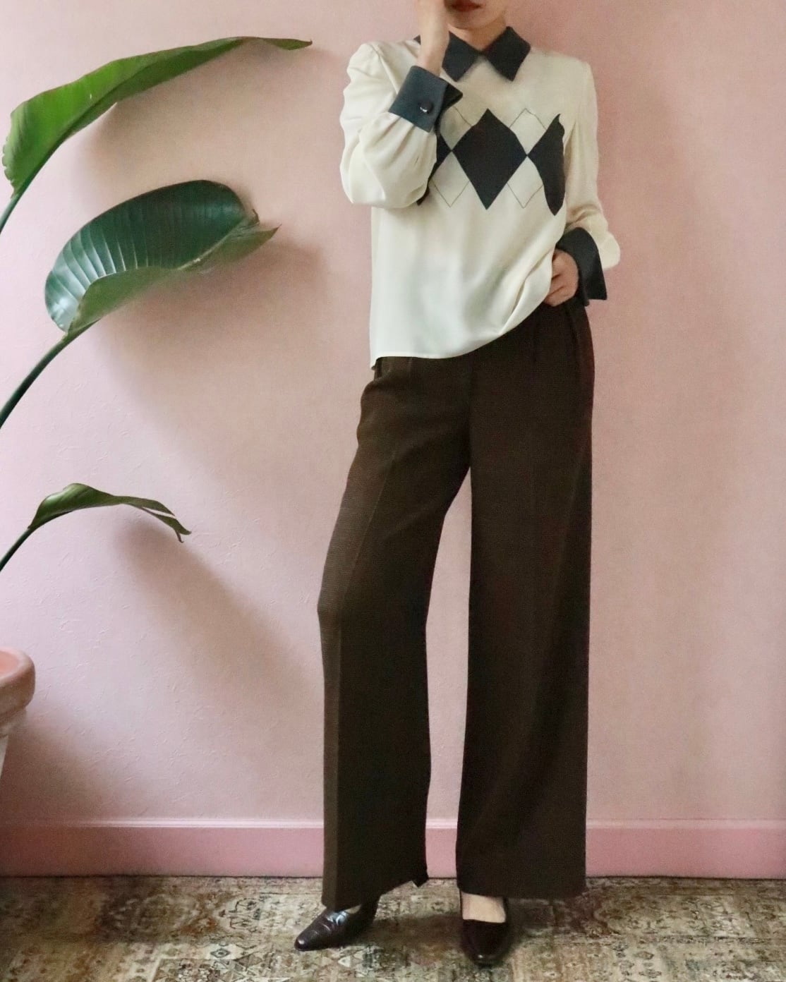 アーガイル、バックボタン、ブラックカラーとカフ、シャープさとフェミニンさを兼ね揃えたおとな可愛いデザイン。