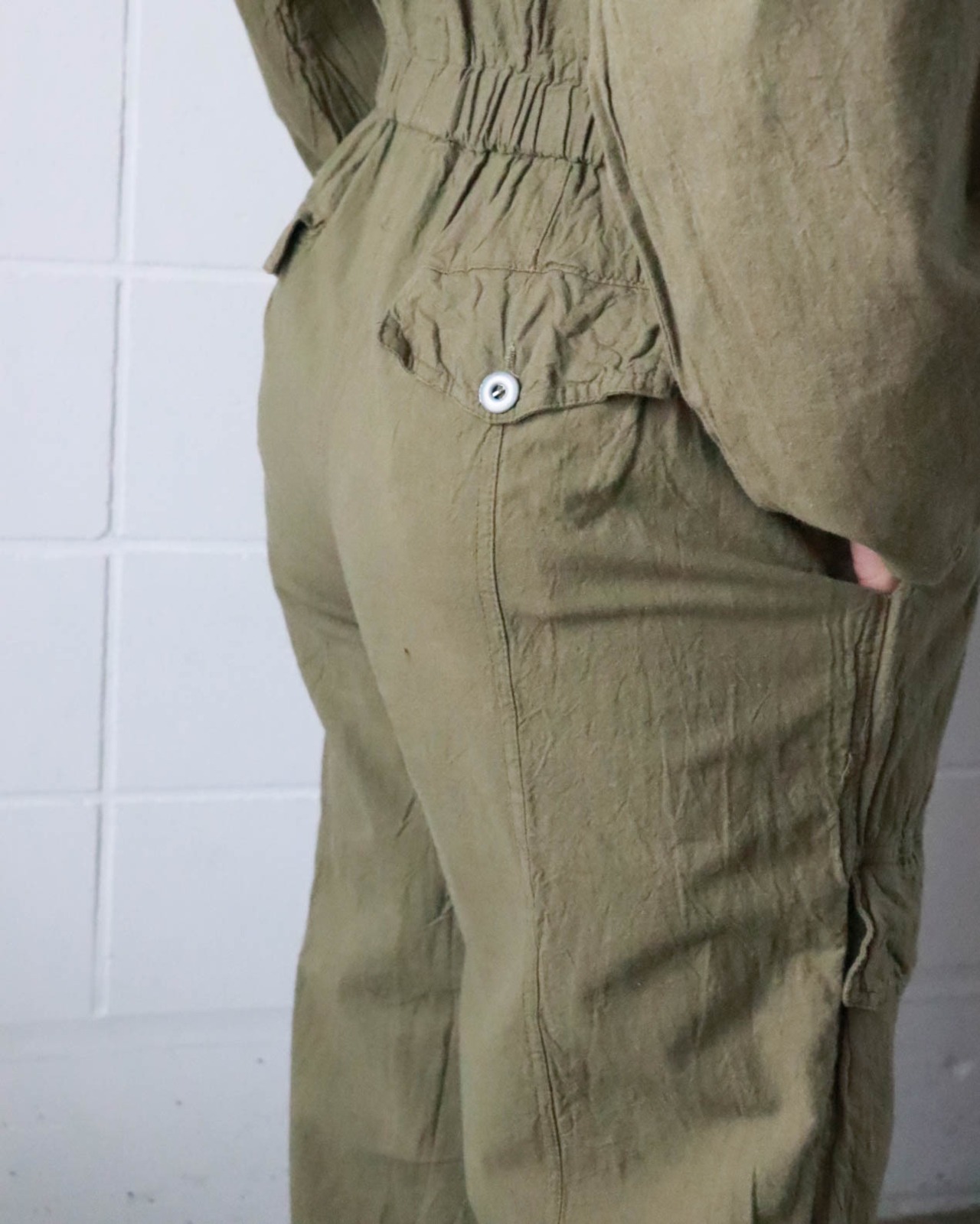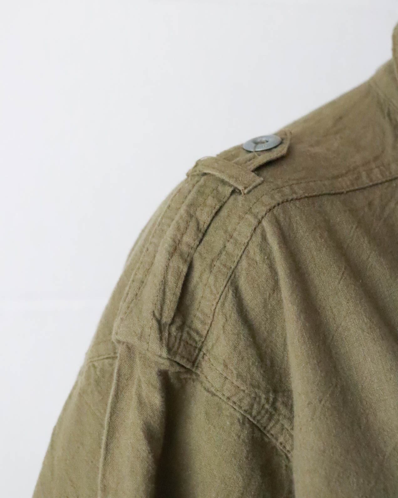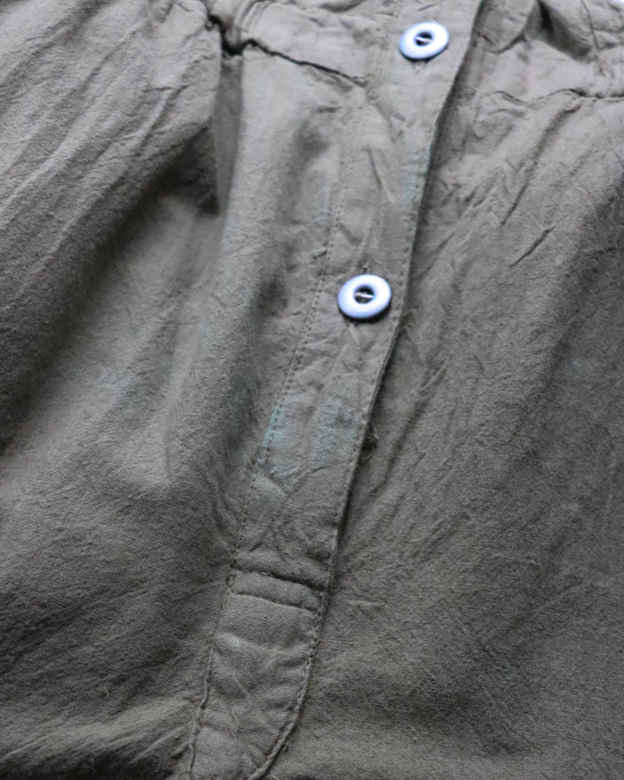 ミリタリーテイストのオリーブグリーンがクールで、ウエストのギャザーがシルエットに程よいメリハリをプラス。ヴィンテージならではの味わいを感じさせる風合いは唯一無二。