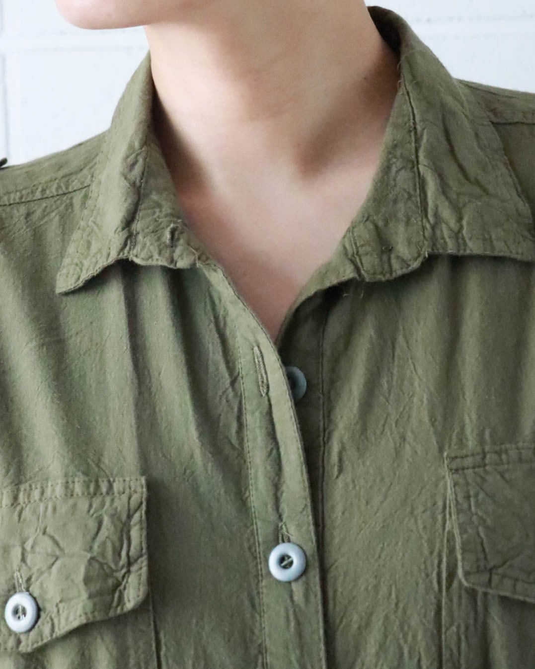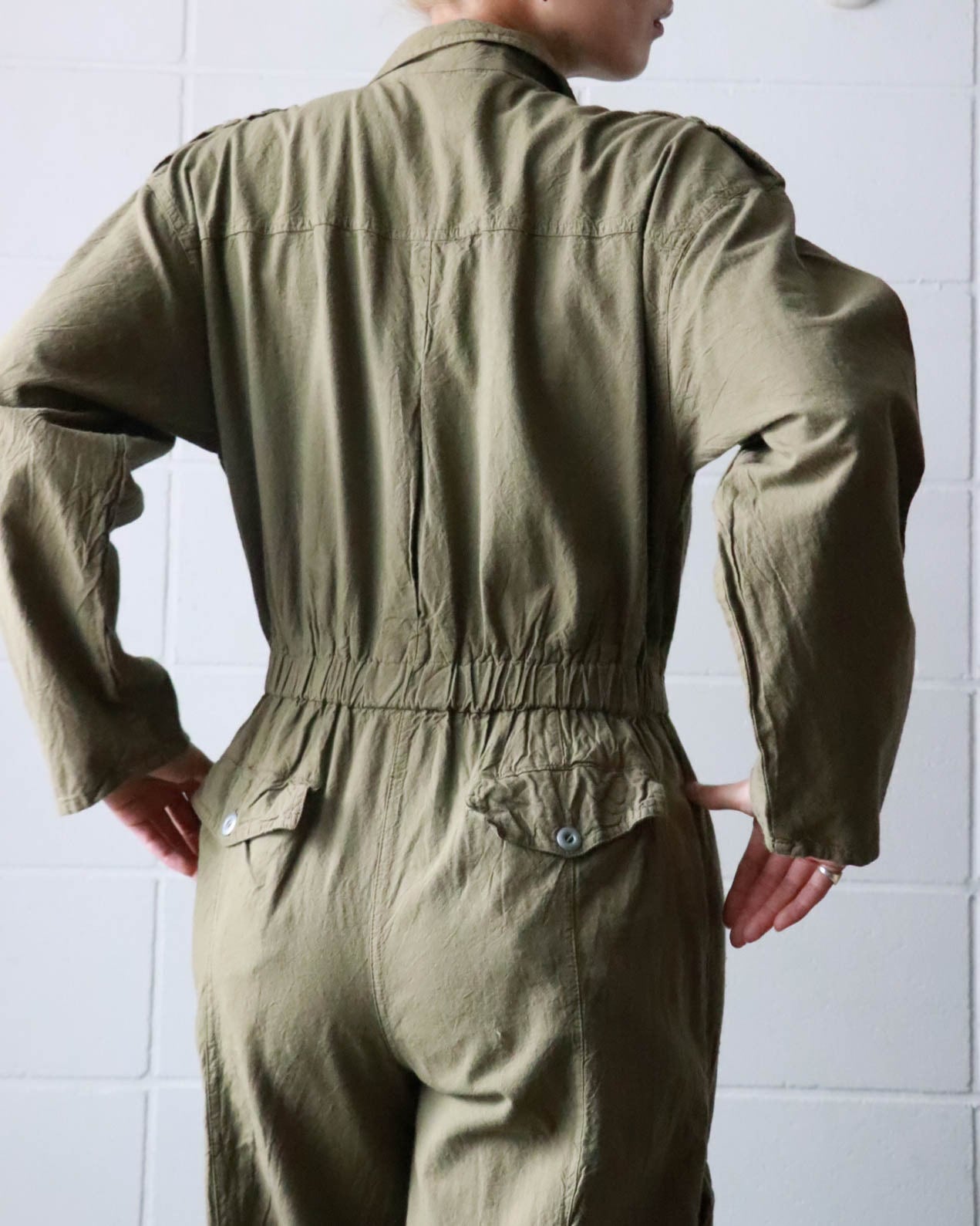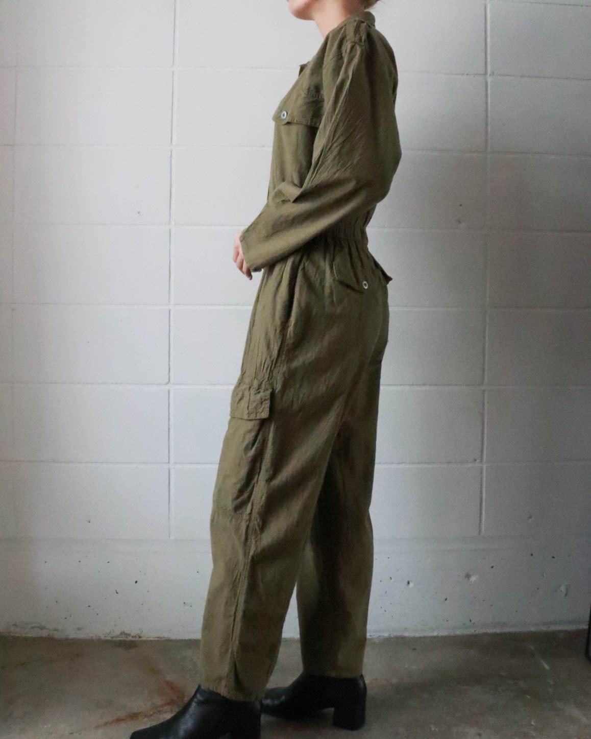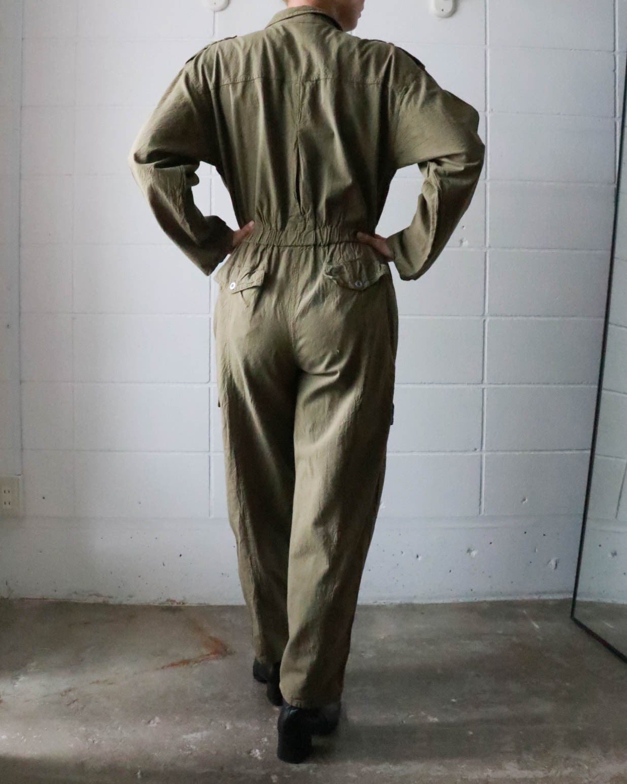 ミリタリーテイストのオリーブグリーンがクールで、ウエストのギャザーがシルエットに程よいメリハリをプラス。ヴィンテージならではの味わいを感じさせる風合いは唯一無二。