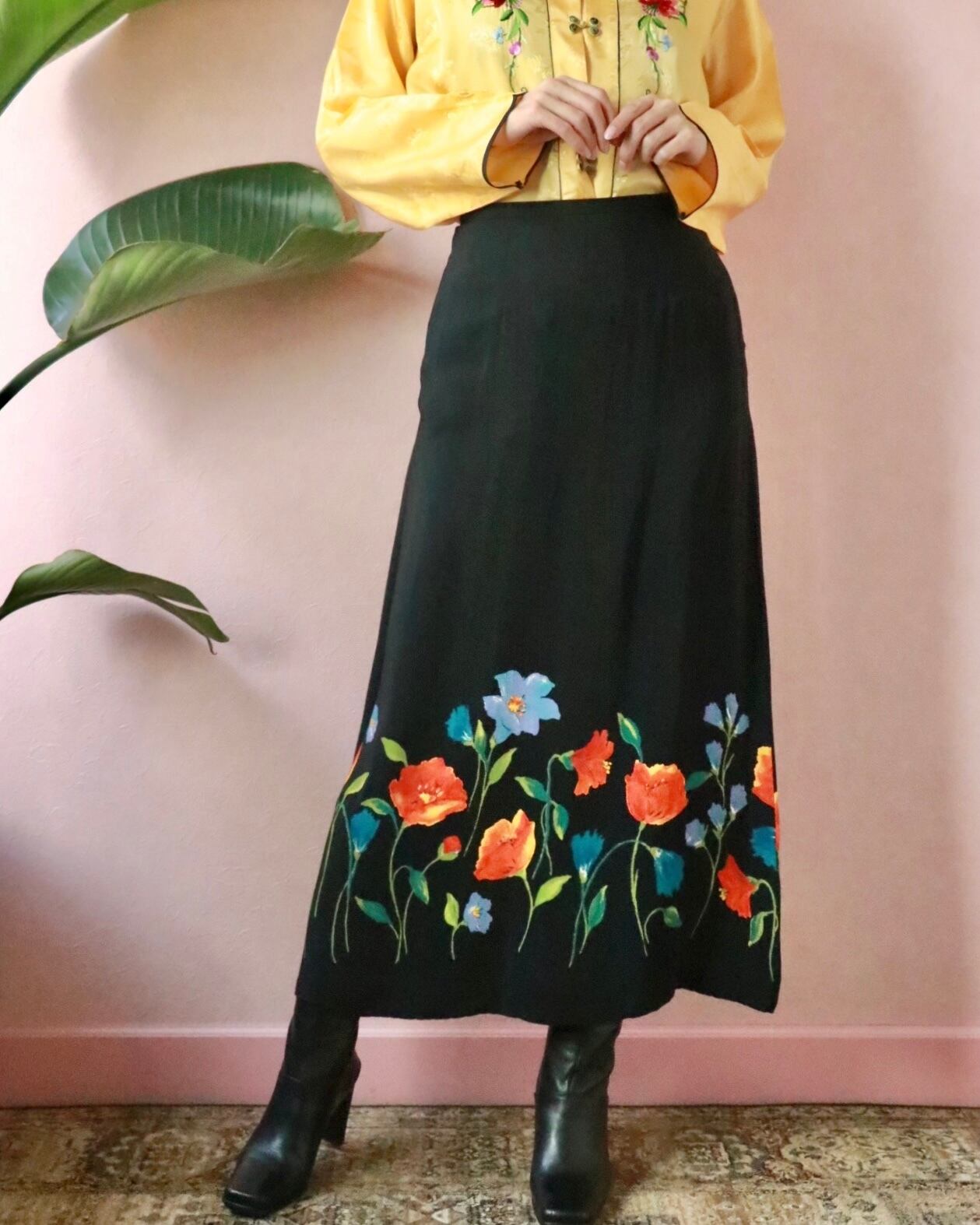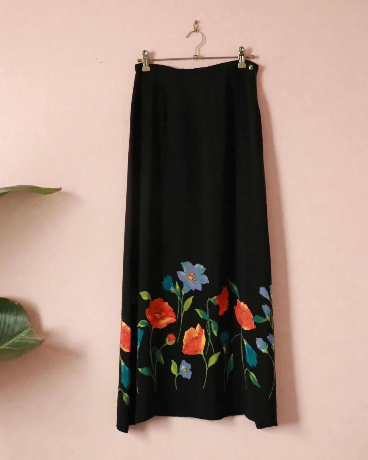 黒地に咲くカラフルな花々が目を引く、上品で華やかなデザイン。