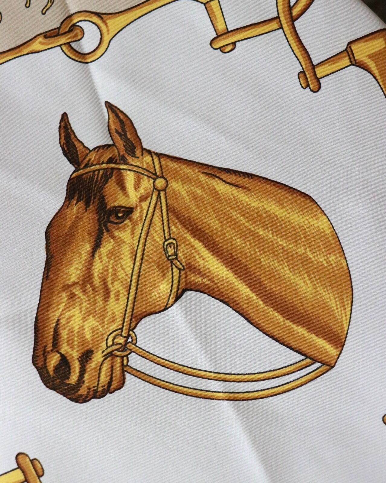 クラシカルな馬具モチーフが美しく、セリーヌらしい1枚。落ち着いたブラウンを基調に、優雅な馬の表情と繊細な蹄鉄模様が気品を添えてくれます。さらりと巻くだけで、コーディネートに個性をプラスしてくれます。