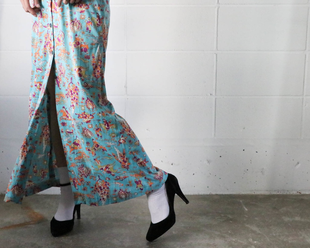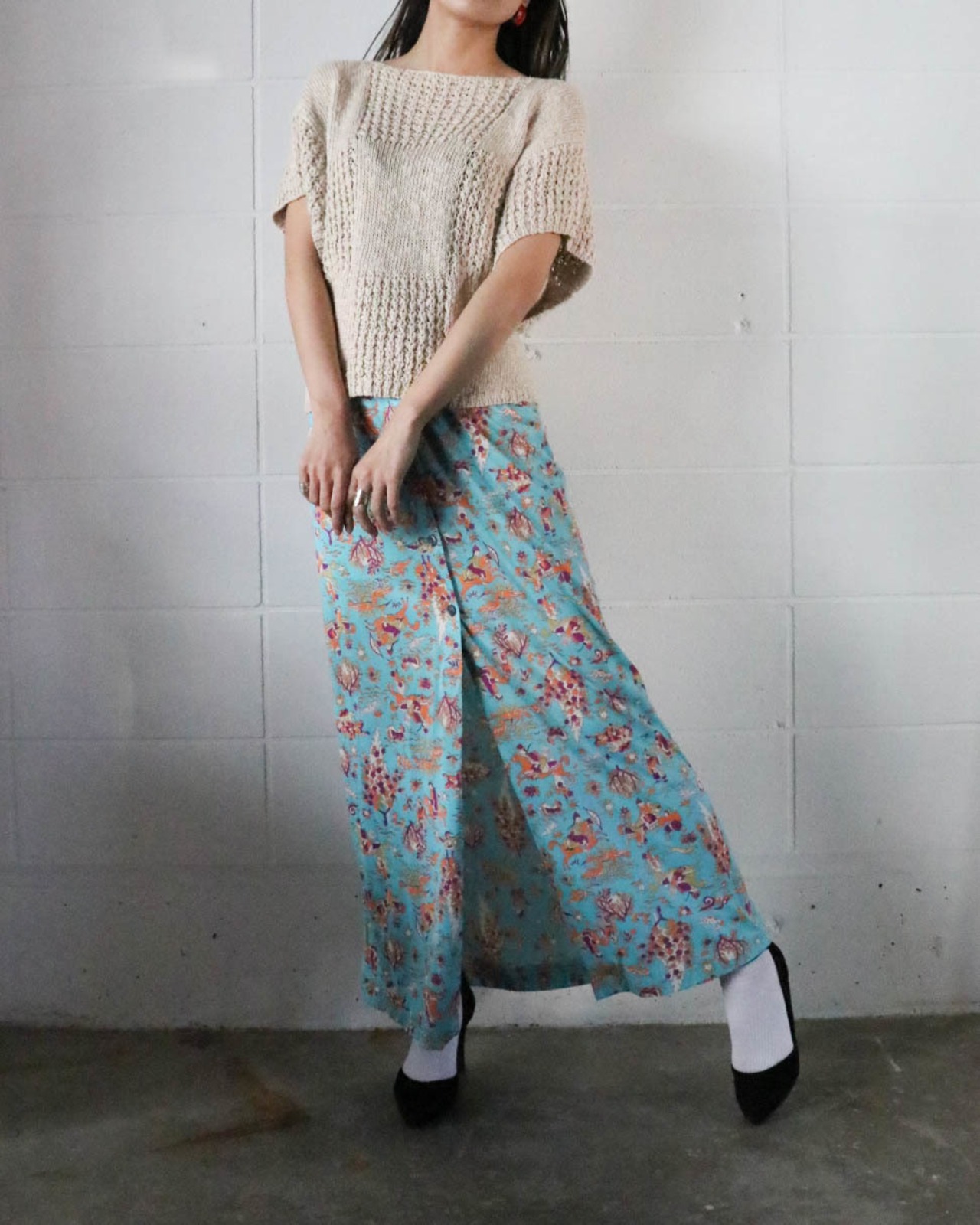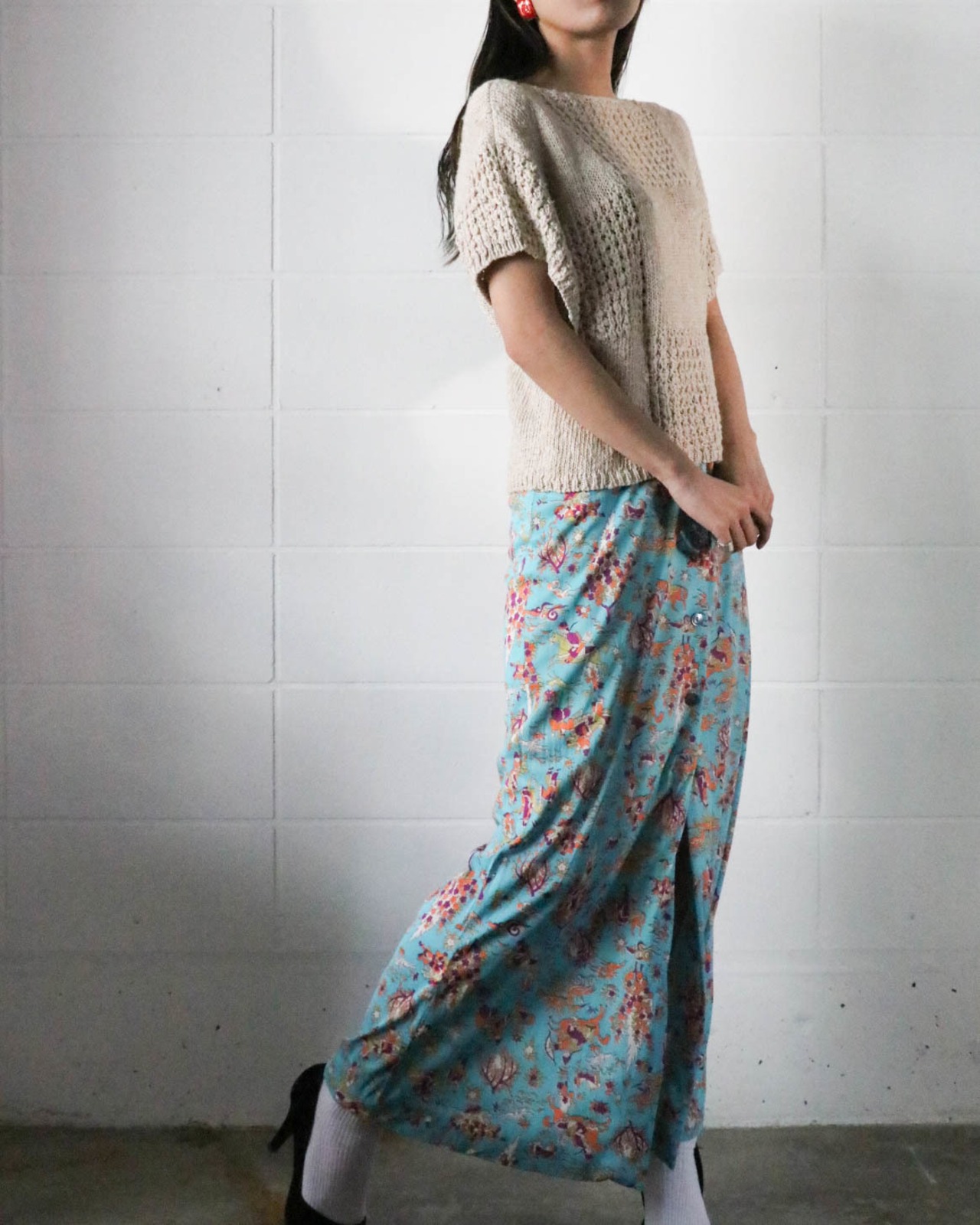 並外れな柄がインパクト大のこちらのスカートは1970年代のもの。チャイナヒストリーを想像させるようなイラストが、ポップに描かれており遊び心を感じます。肌触りよくゴムウエストなのも嬉しいポイント。また、同柄のショートパンツが付いているので、前ボタンを大胆にあけてセンシュアルに着こなしても素敵な一着です。