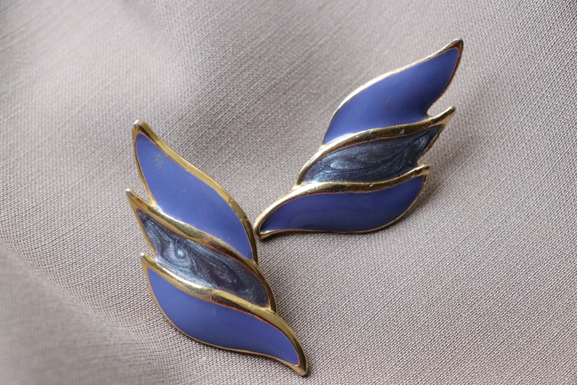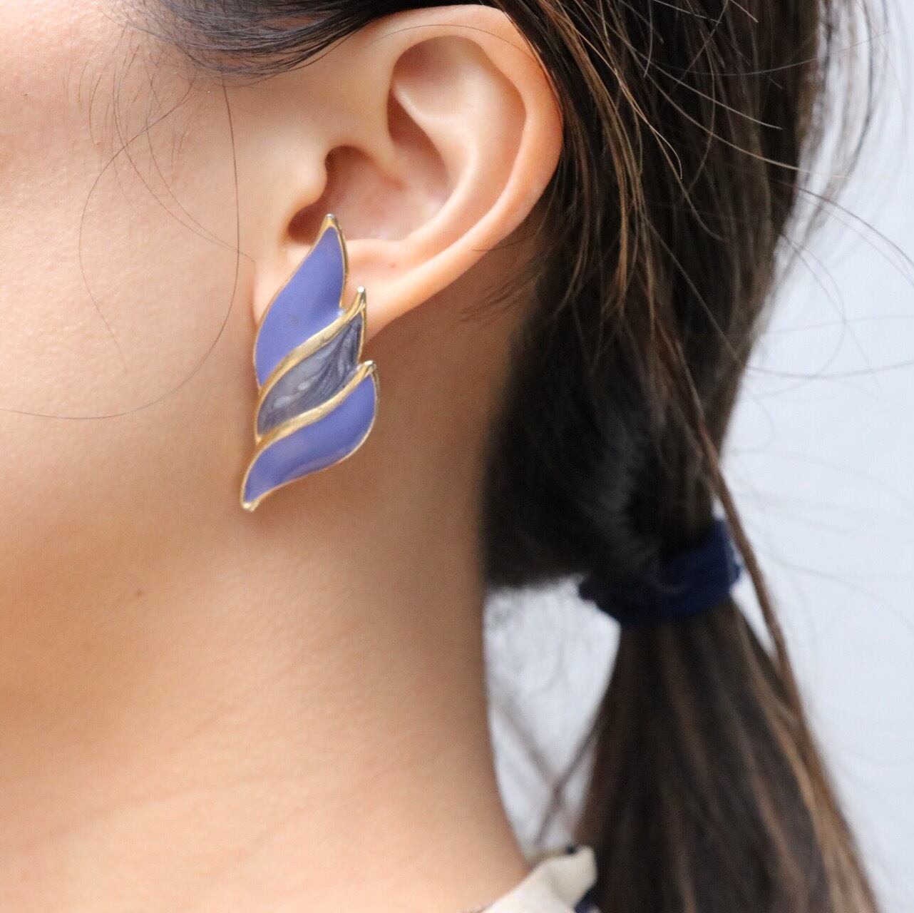 今期マストのラベンダーカラーが自慢のデッドストックピアスです。上品で魅惑的なラベンダーとフェザーをイメージしたようなデザインに思わず心惹かれてしまいます。存在感あるピアスで、普段のコーディネートにさりげなくトレンドカラーを取り入れてみてはいかがでしょうか。