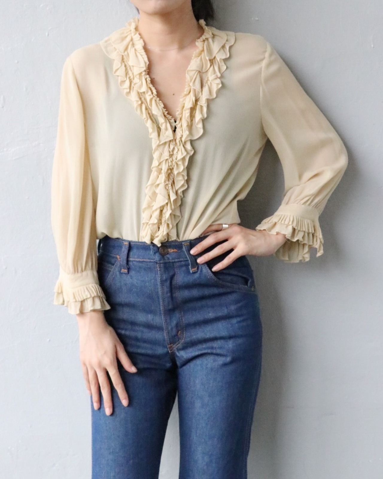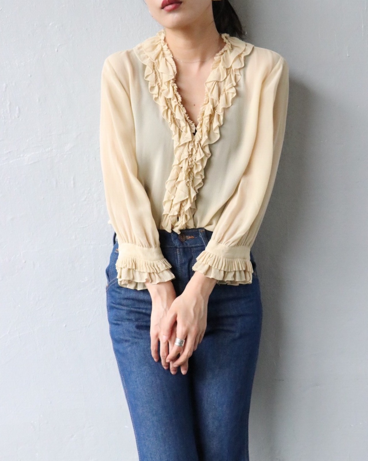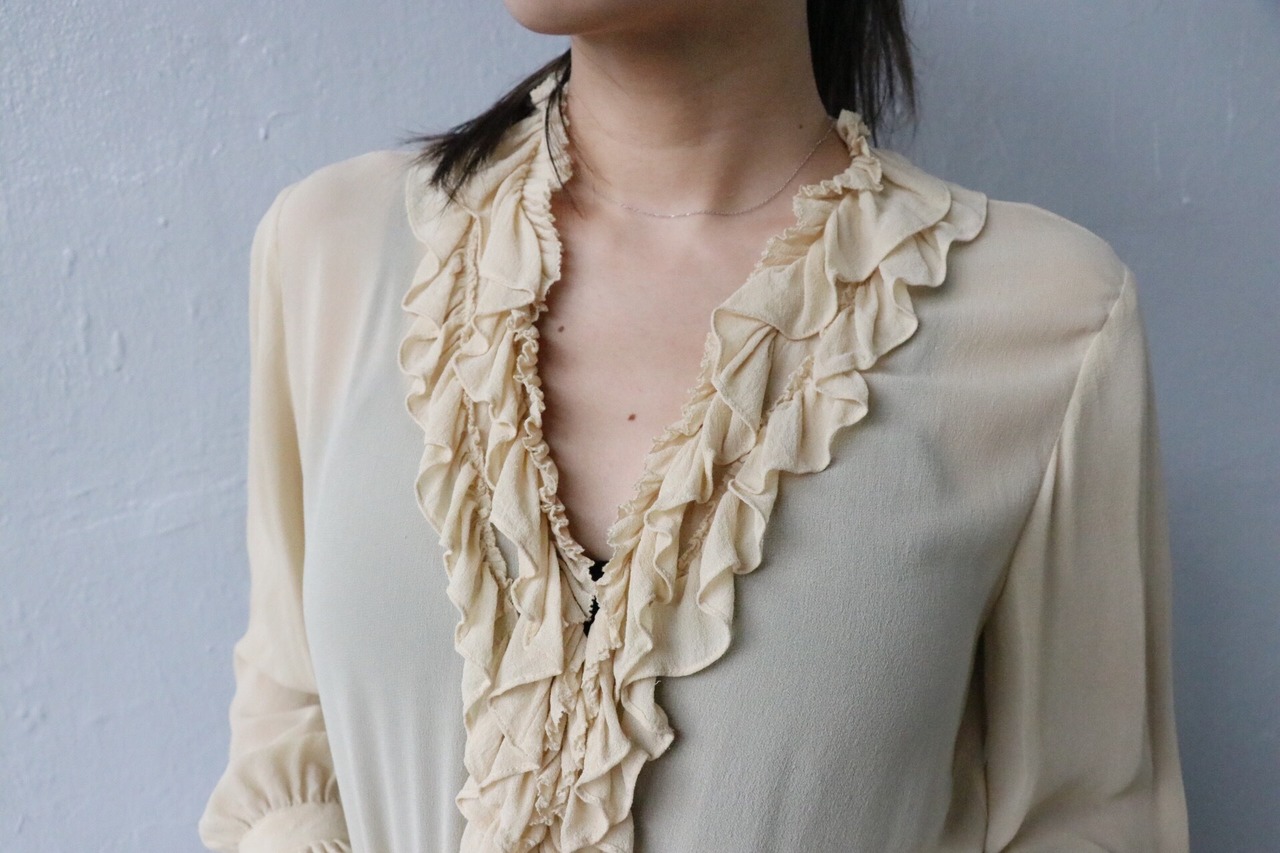 薄手で透け感あるシルク素材のフリルブラウス。