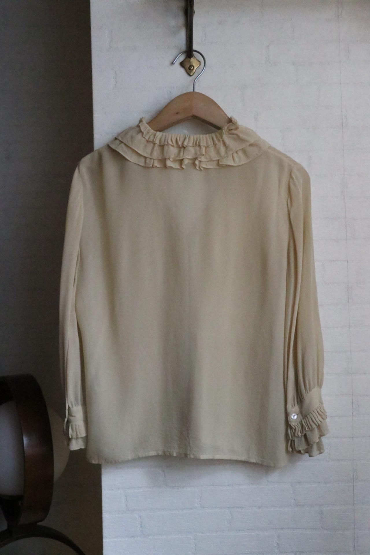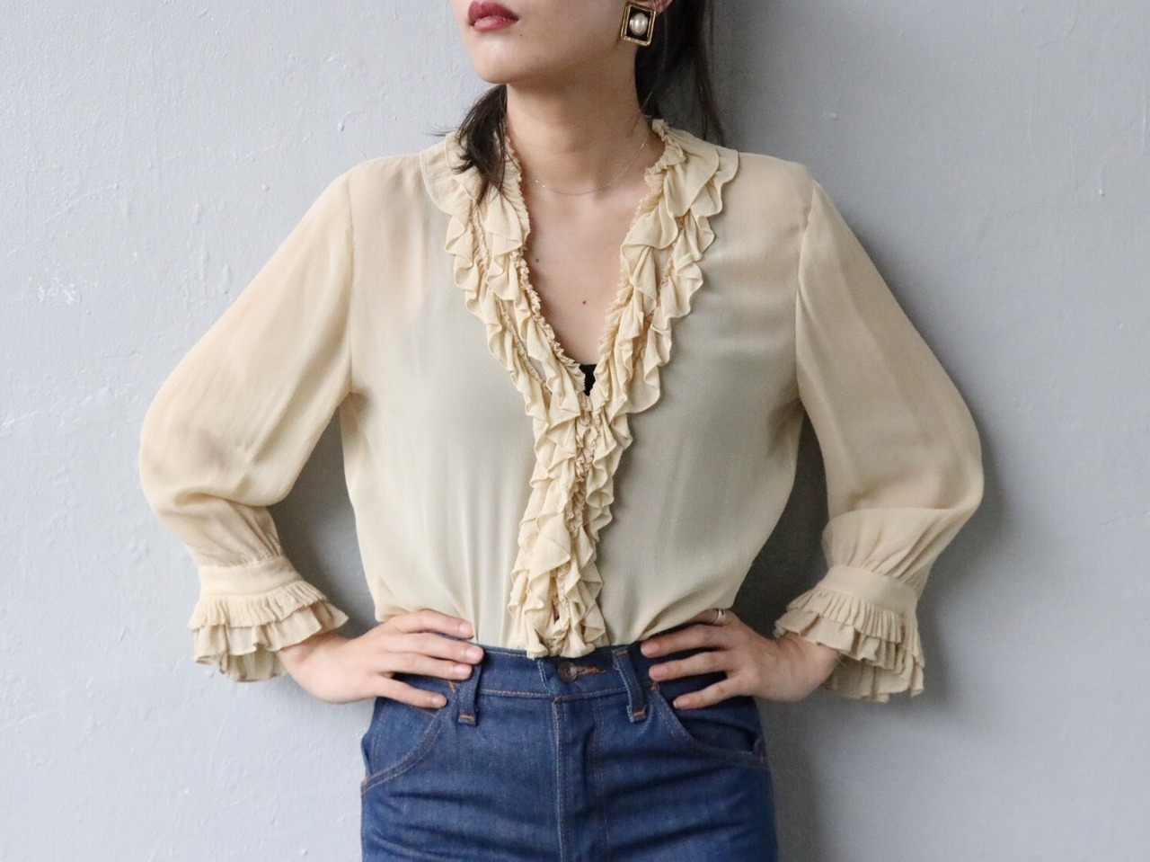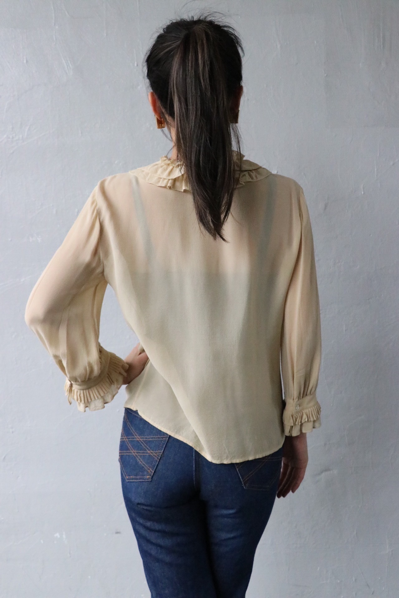 薄手で透け感あるシルク素材のフリルブラウス。