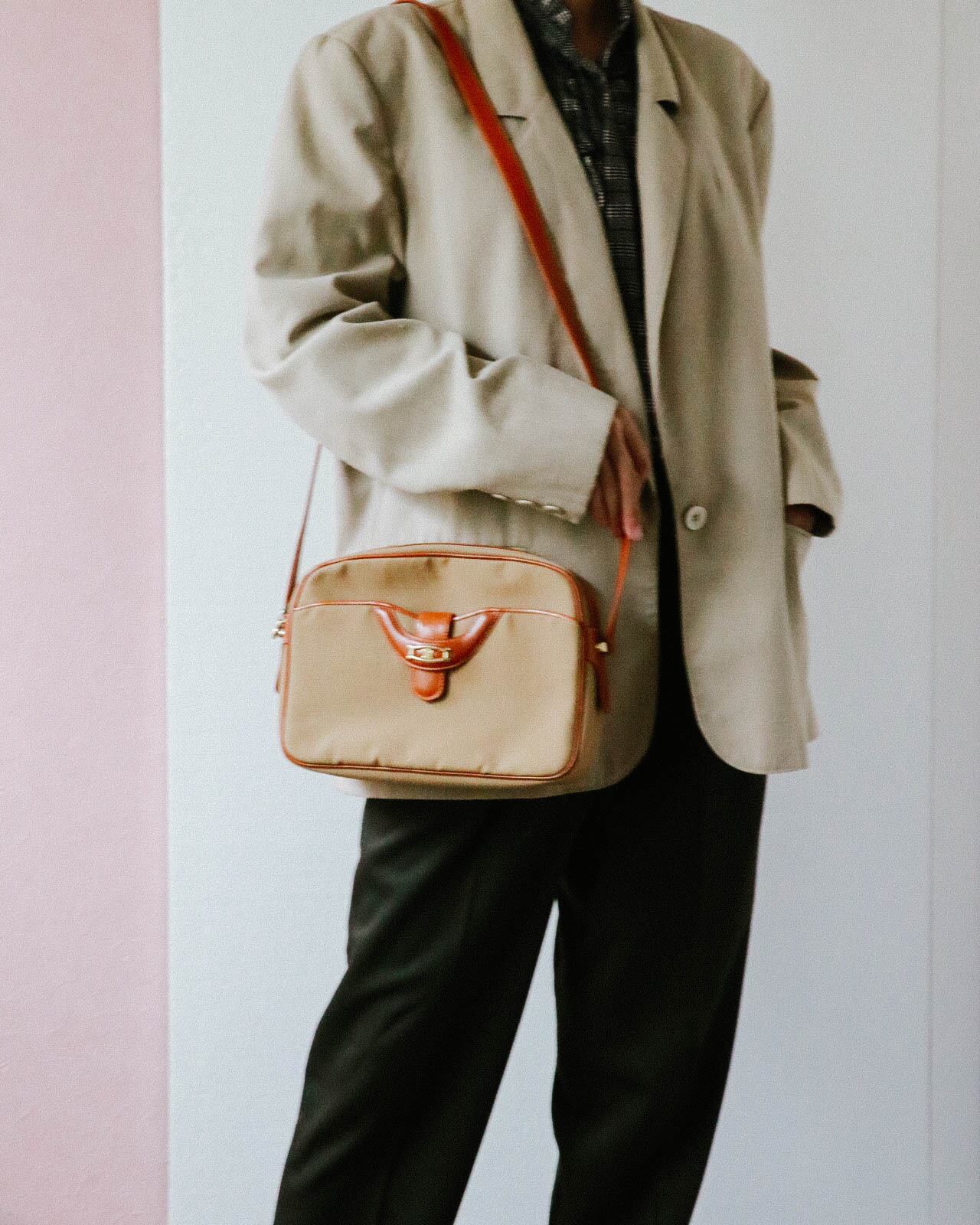 マカダム柄のpvc素材が定番のオールドセリーヌですが、こちらはポリエステル素材×レザーの組み合わせで、配色ともに珍しい一点。