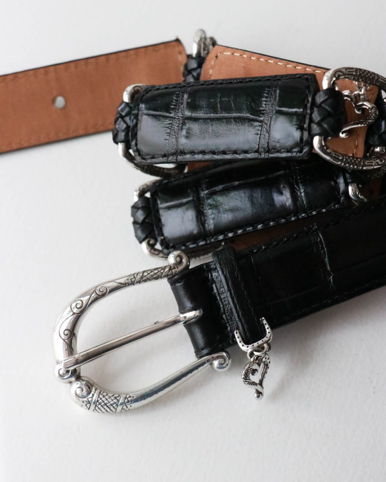 ブライトンのチャーミングなベルトが入荷。シルバーバックルの繊細なデザインと小さなハートのチャームが揺れてさりげない可愛らしさをプラス。ブラックレザーの艶感が、フェミニンな装いの引き締め役にもピッタリです。