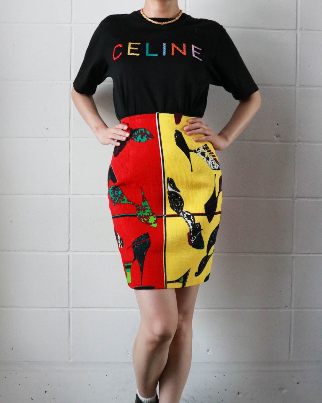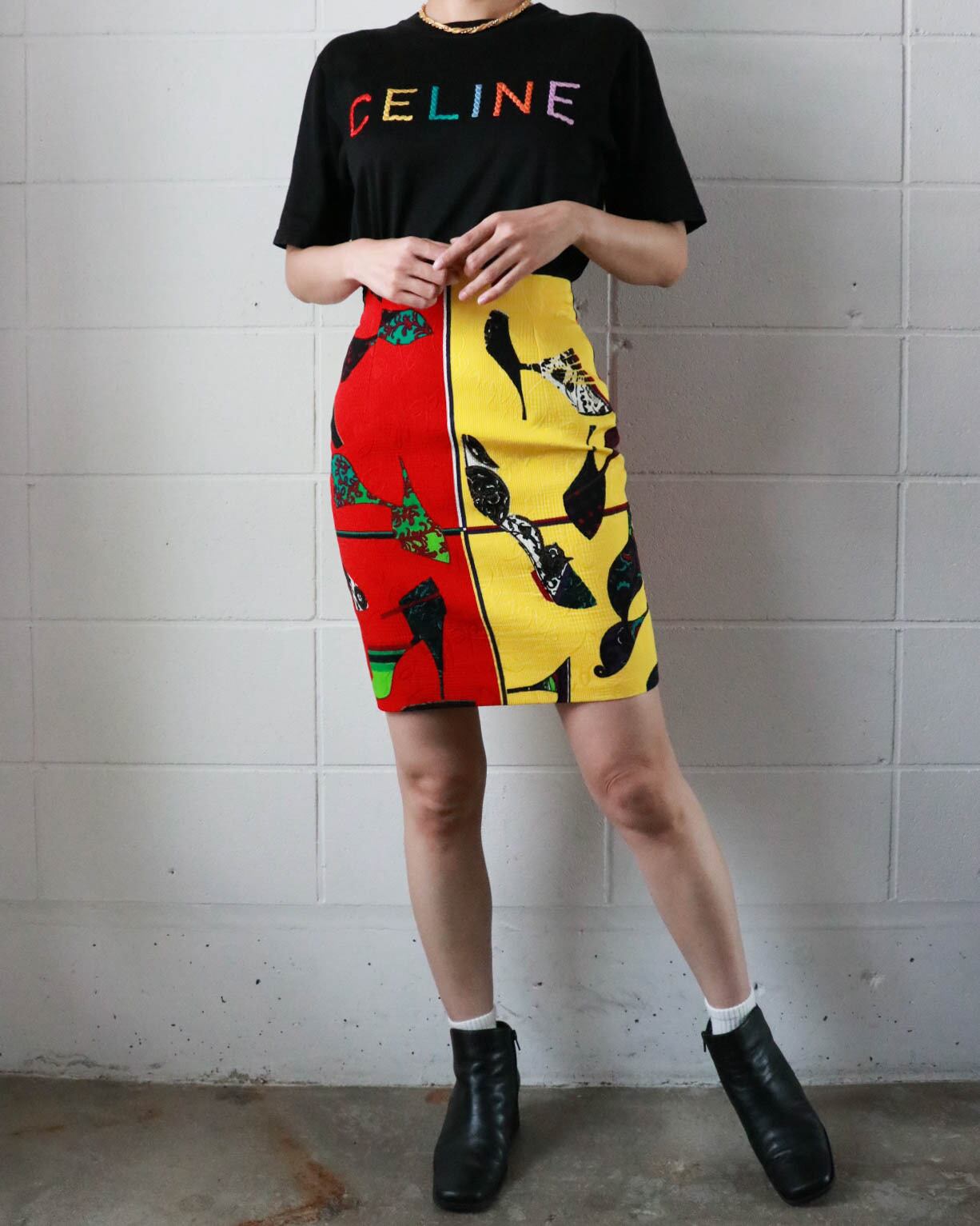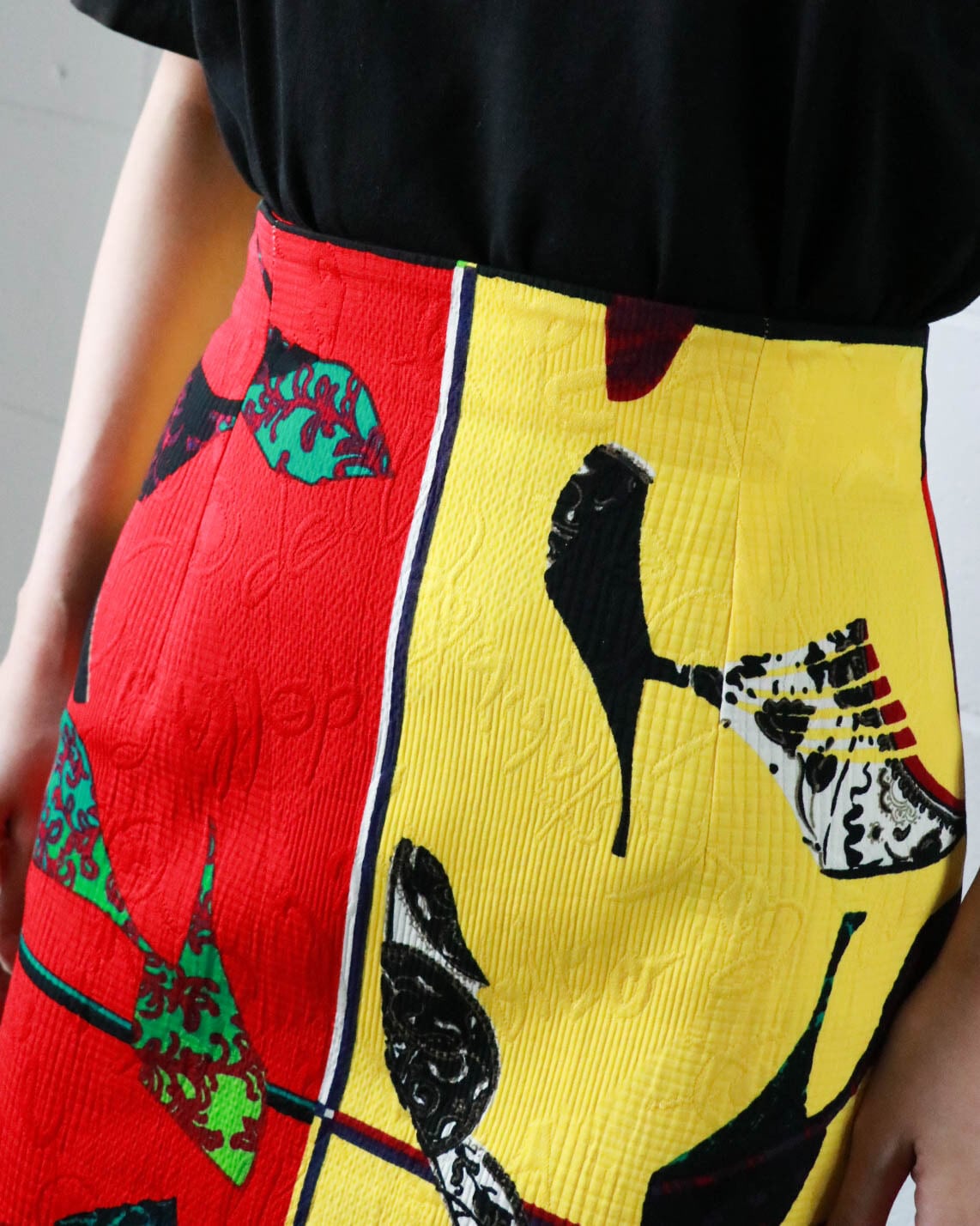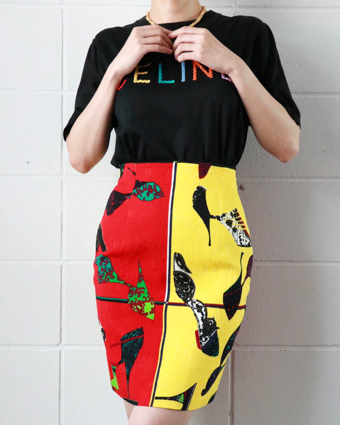 シンボリックなヒールシューズのプリントとタイトなペンシルラインのデザイン