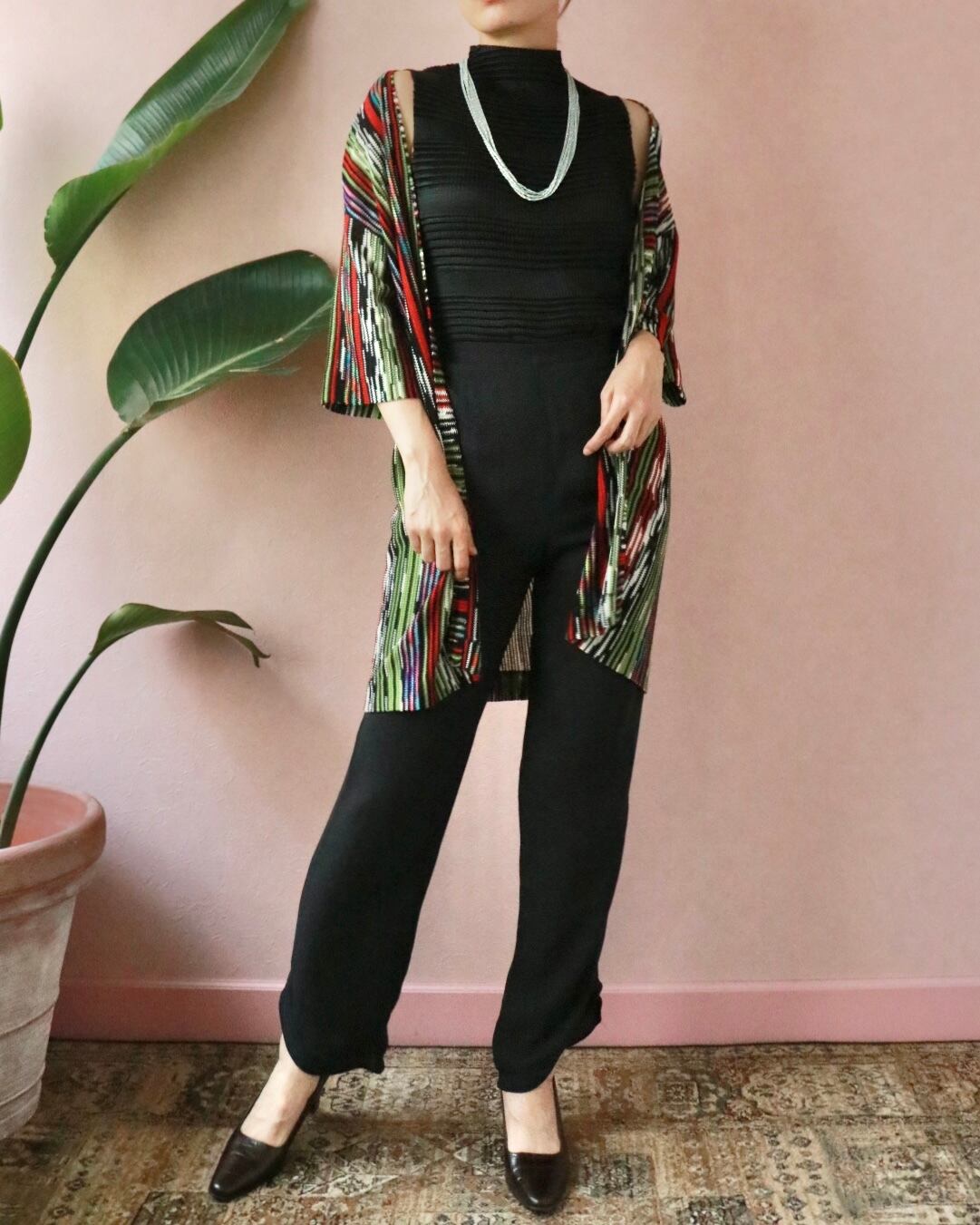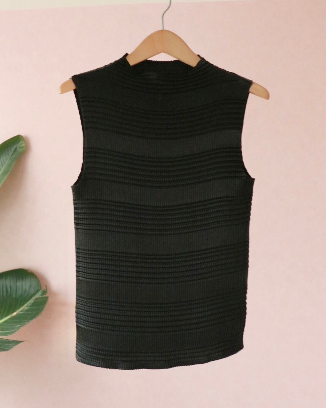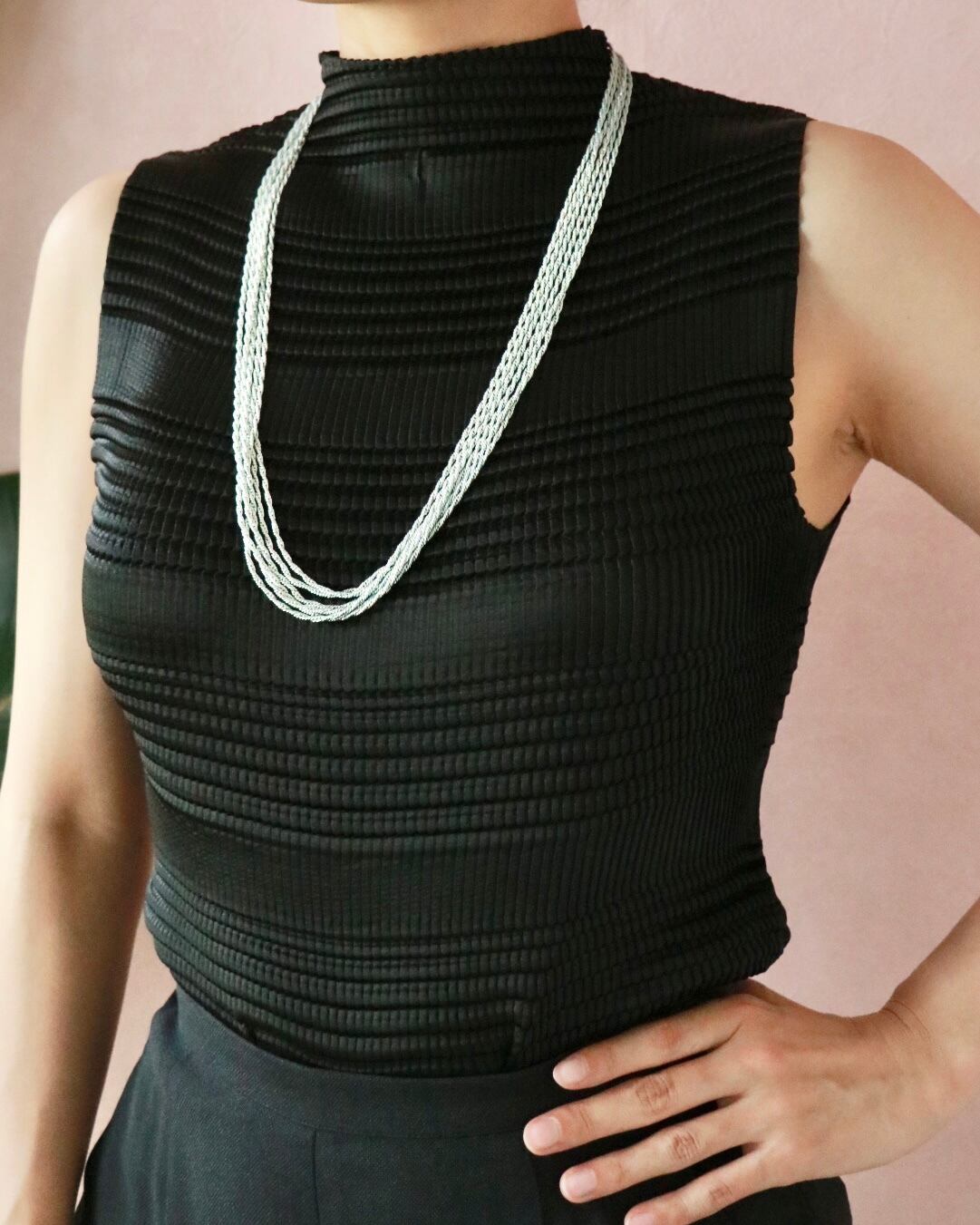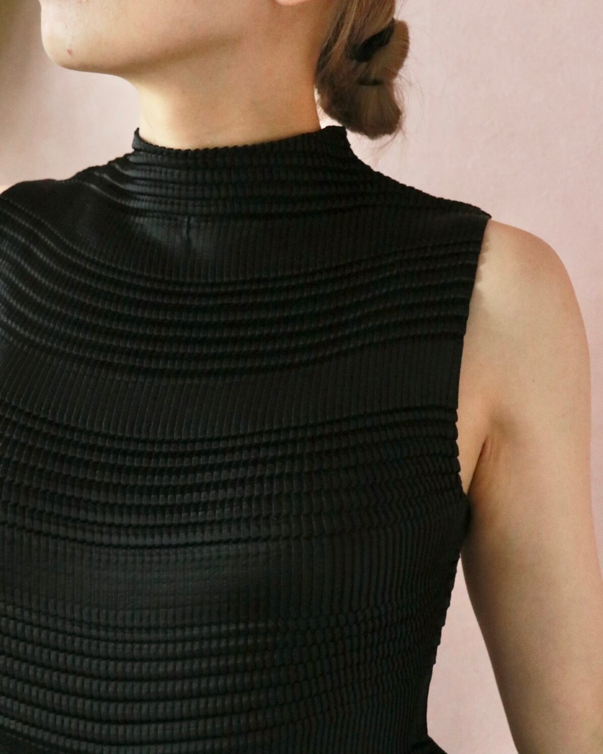 洗練されたブラックトップス。機械的に入ったプリーツに反射した光沢がなんともいえない妖艶さを醸し出します。単一になりがちな黒を取り入れたコーディネートにメリハリを与えます。