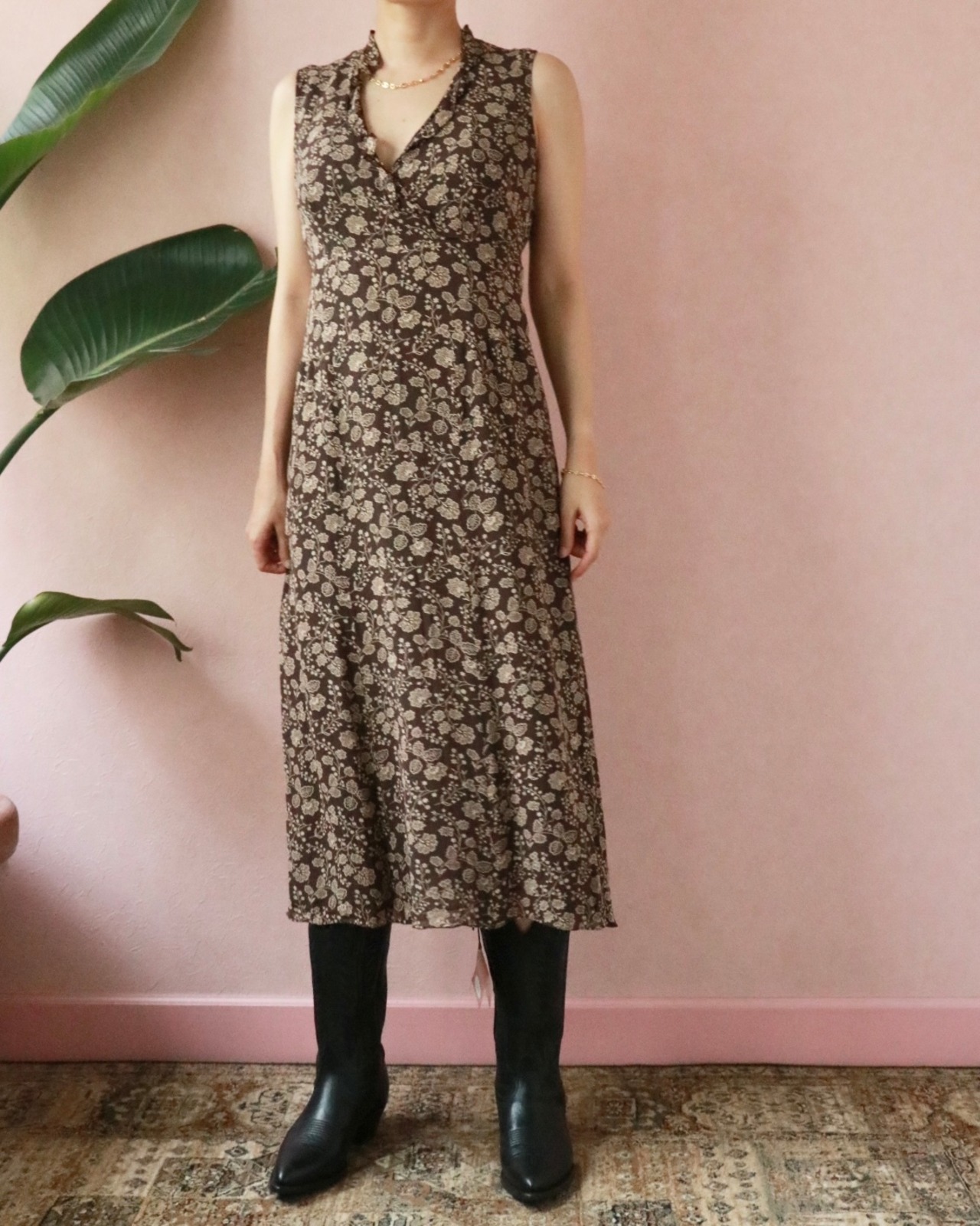 ダナキャランニューヨークのヴィンテージロングワンピース。レーヨン 100%のさらっとした肌触りがこの季節にぴったり。上品なブラウンカラーで、首回りから胸元まではフリルが付いたカシュクールデザイン。全体的に裏地が付いて気軽に一前で着れます。秋口はインナーにTシャツやブラウス重ねてもコーディネートのバリエーション楽しめます。