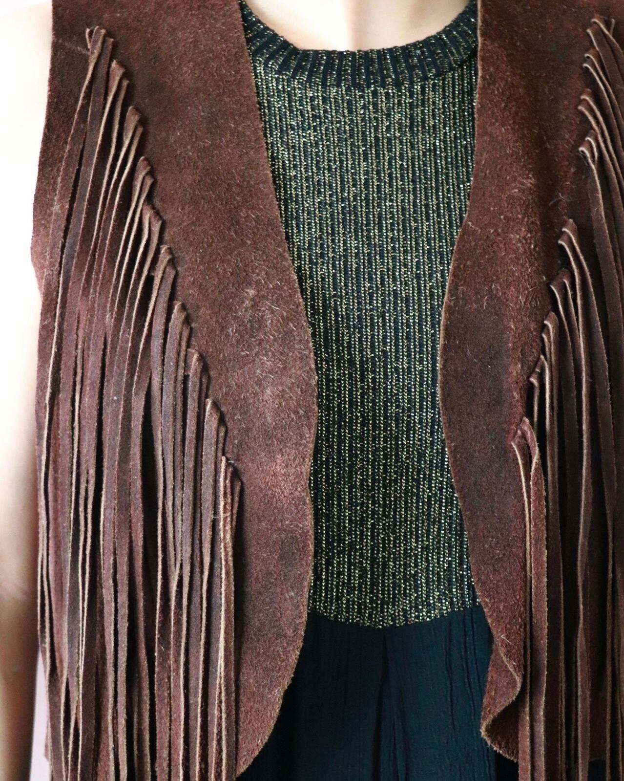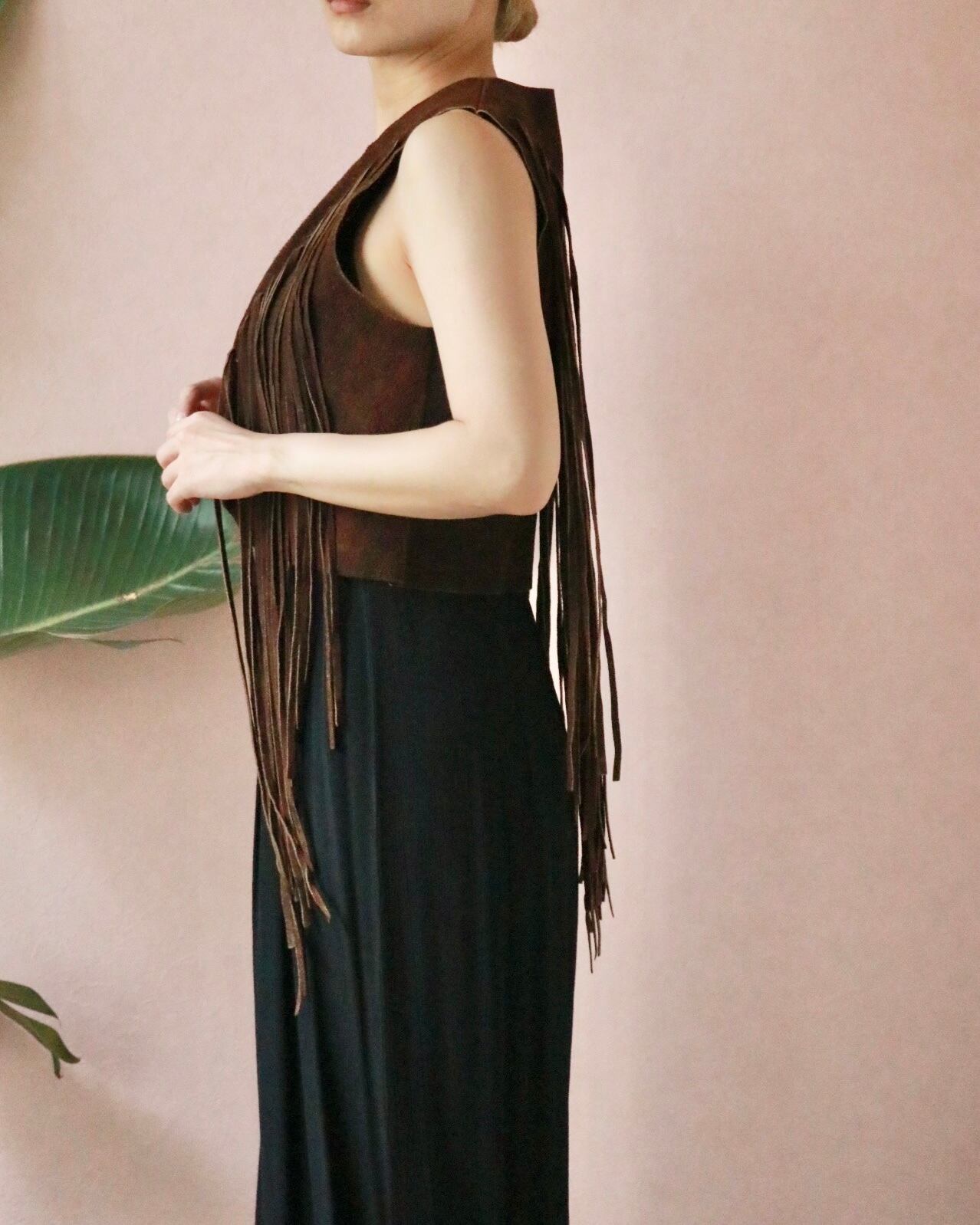 70年代のフリンジベストが入荷。スエードの風合いとロングフリンジが動くたびに揺れ、スタイリングにリズム感をプラスしてくれます。シンプルな装いに羽織るだけで一気にヴィンテージムードを漂うコーディネートに。デニムやワンピースなど、幅広いアイテムと相性抜群の1着です。