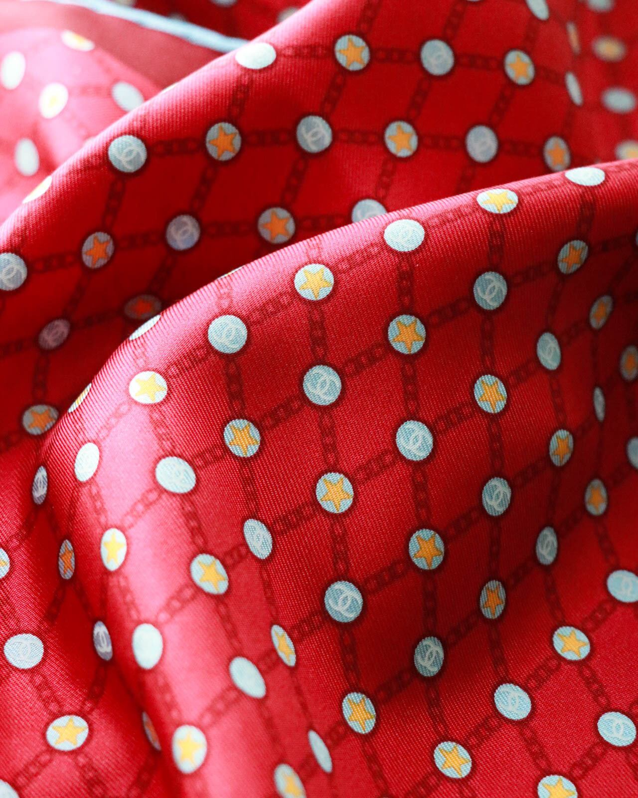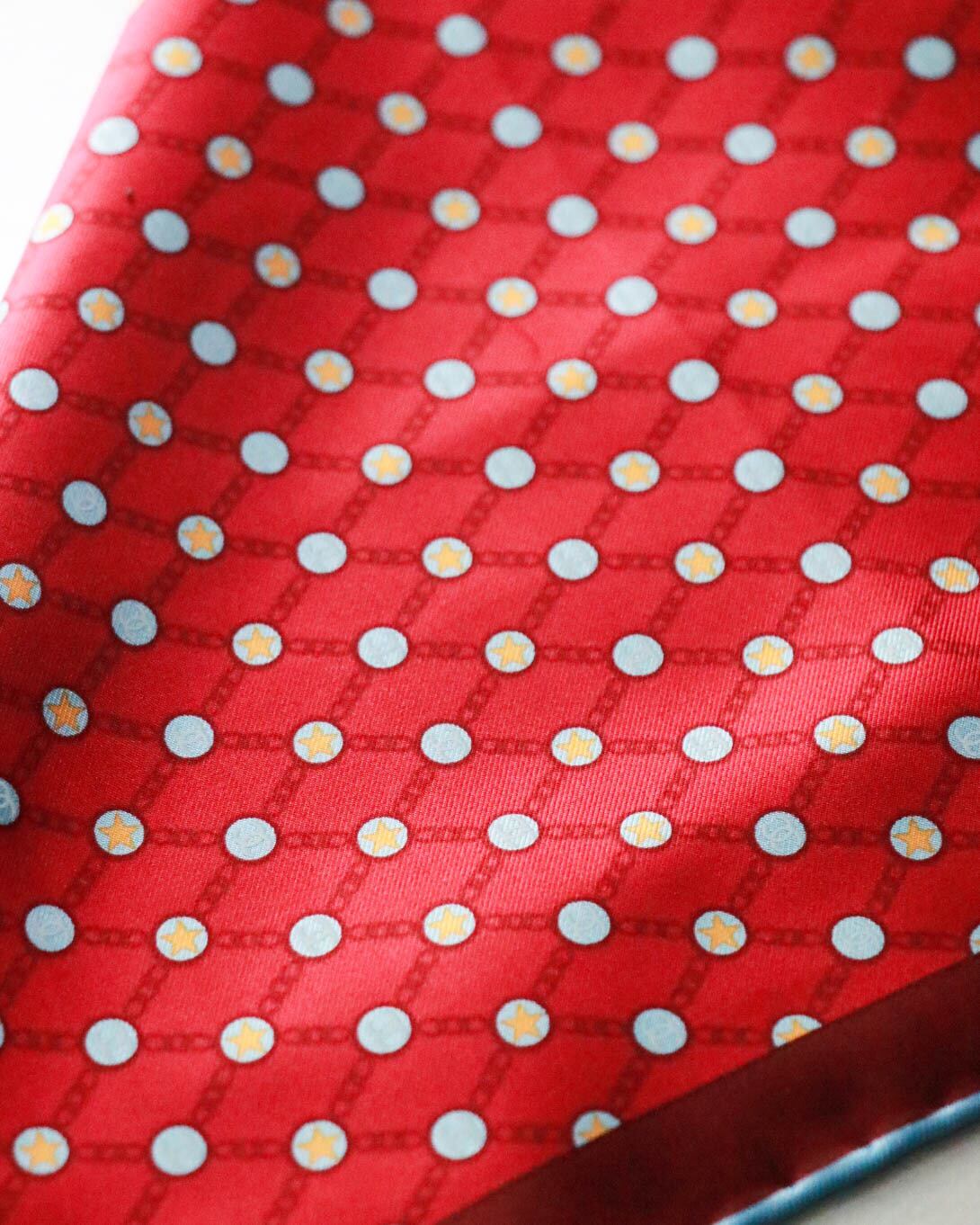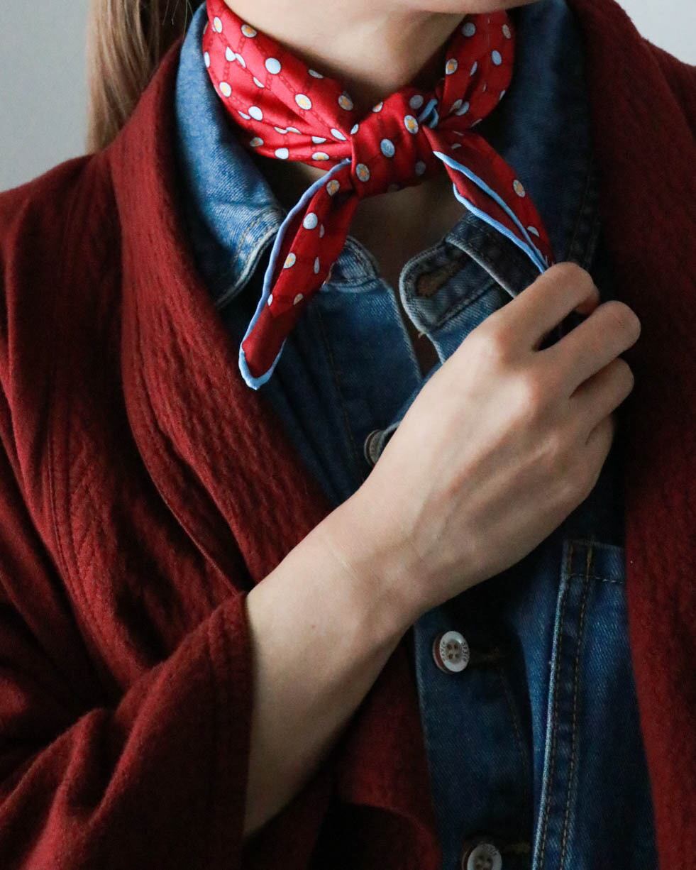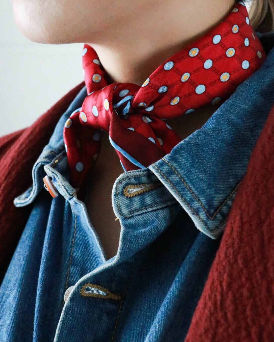 ミニマルなサイズは首元やヘアアレンジにも使いやすく、スカーフ初心者にもおすすめ。