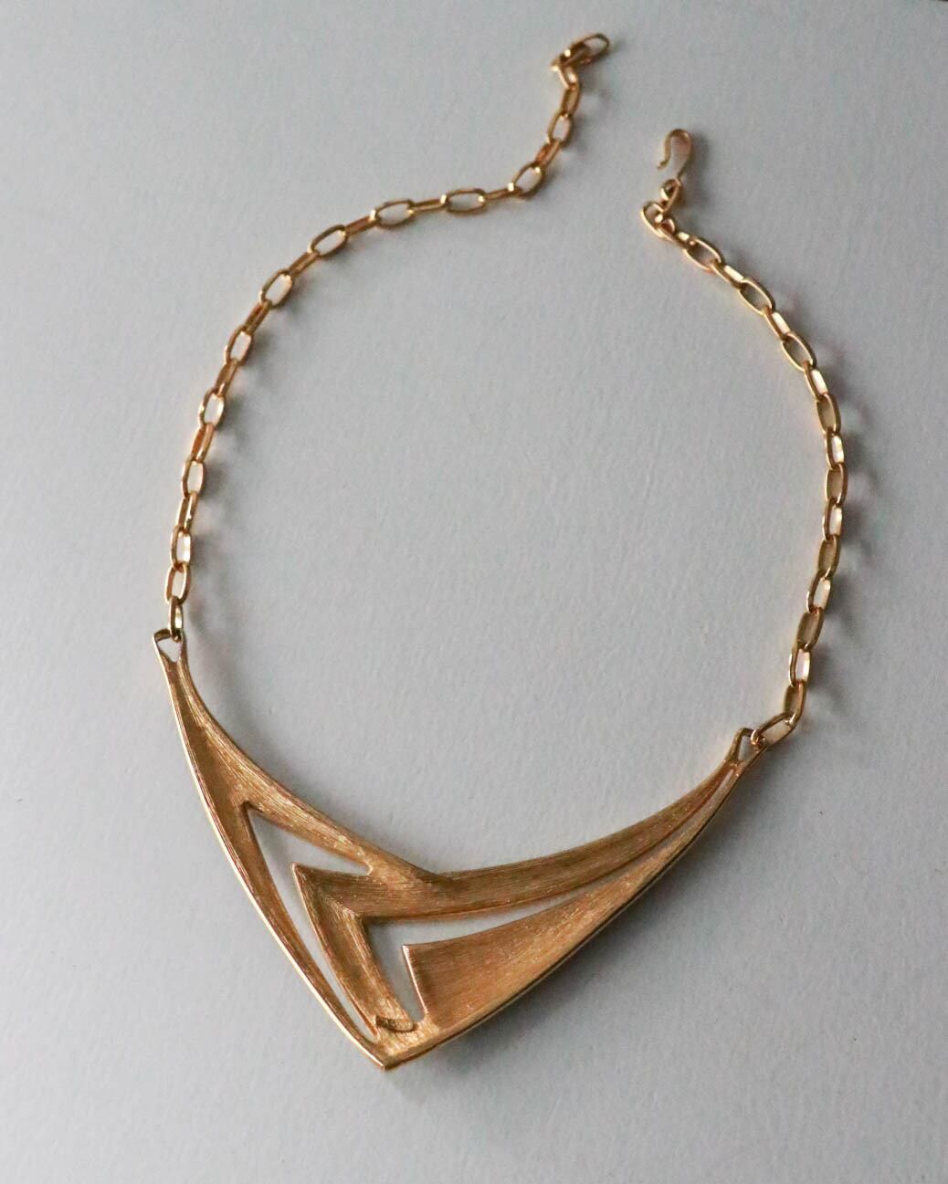 アメリカの老舗コスチュームジュエリーブランドMONETのネックレス。シャープなV字シルエットにブラック×ゴールドのエナメルデザインが映える、モダンでエレガントな一点です。程よい存在感があり、シンプルなトップスやドレスに合わせるだけでスタイルを格上げしてくれます。