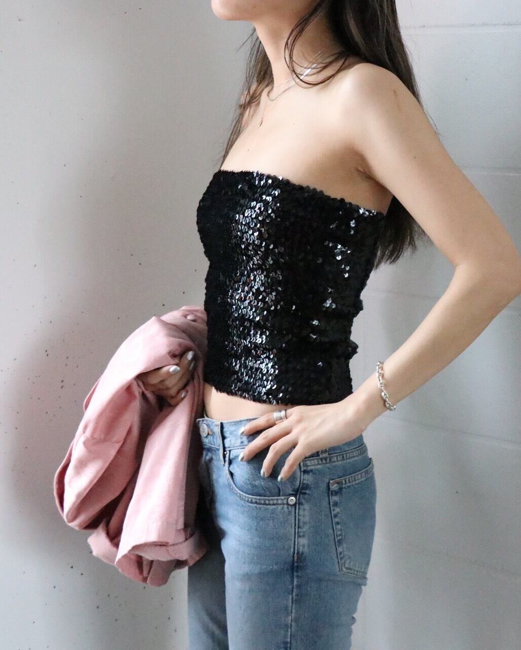 スパンコールチューブトップです。着心地快適なゴム仕様で程よくボーディーにフィットし、女性らしいシルエットが完成する一枚。センシュアルに一枚で着るのはもちろん、Tシャツの上から重ねたり、インナーとして使ったりなど様々な着こなしができます。光に当たるたびにキラキラと輝くスパンコール素材でコーディネートのアクセントになること間違いなしです!