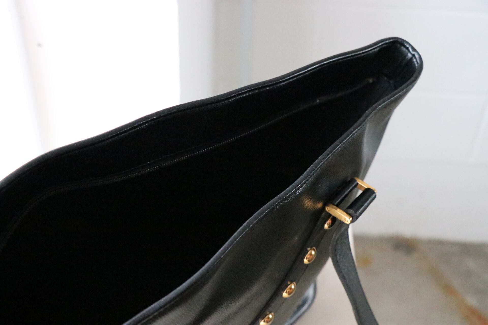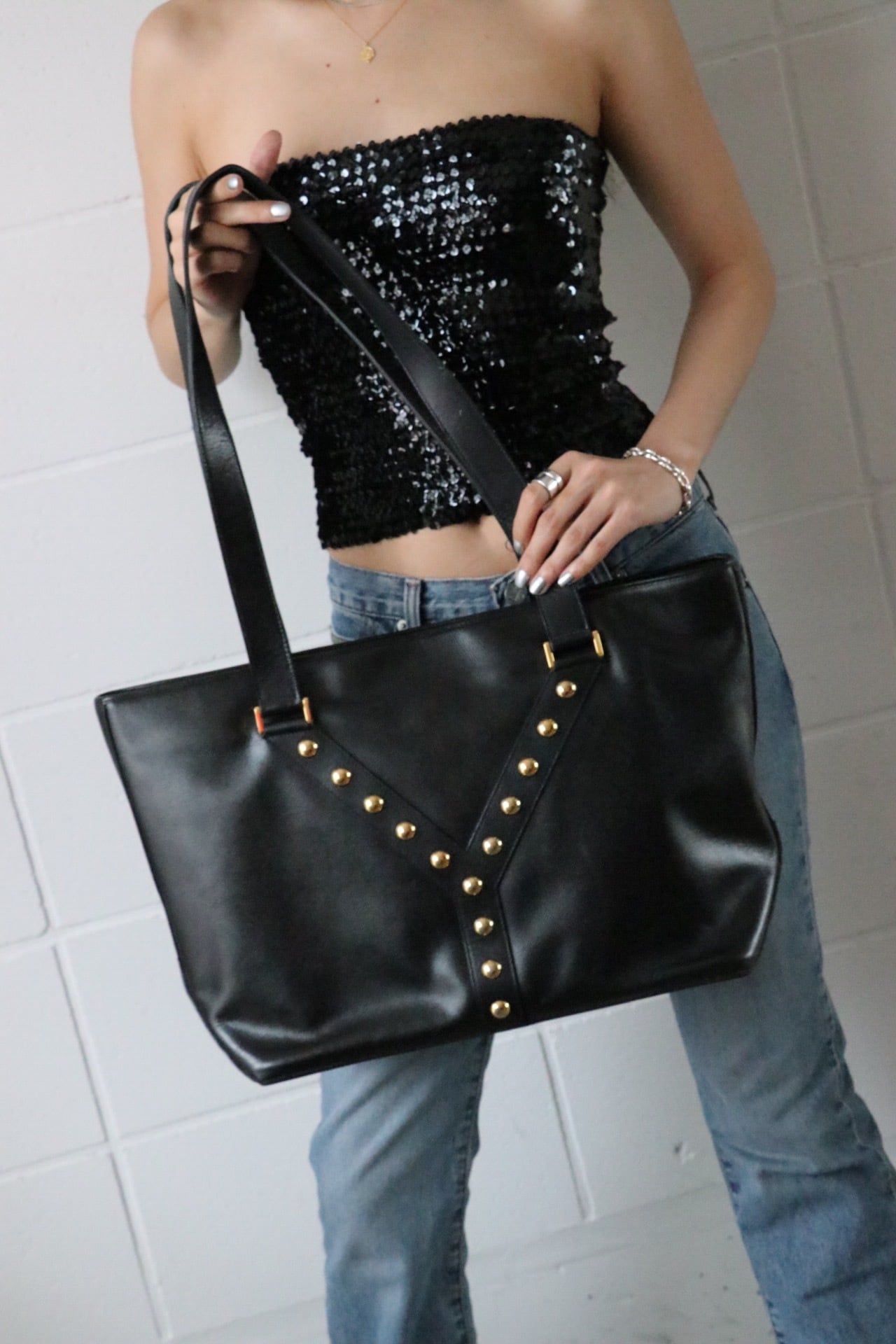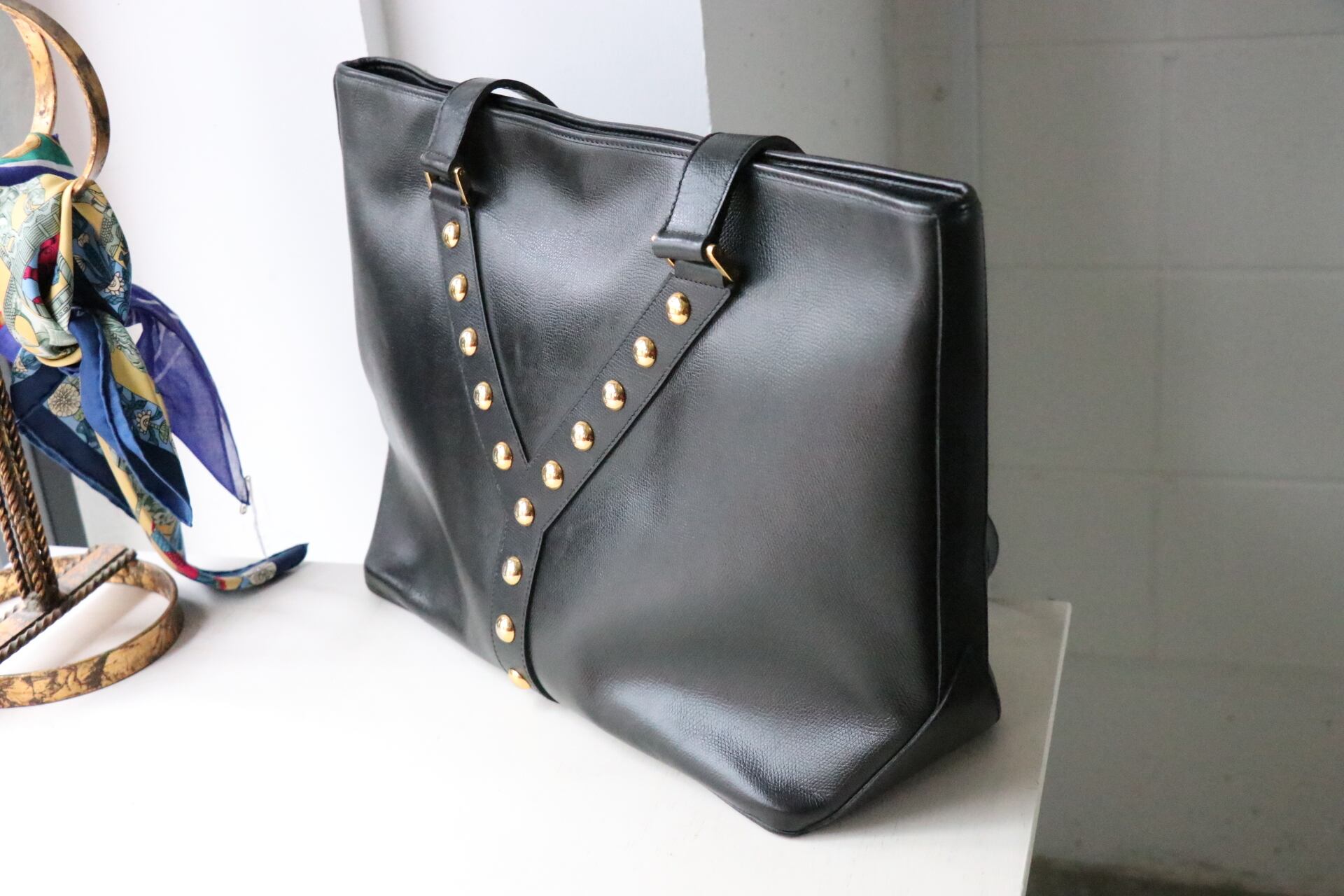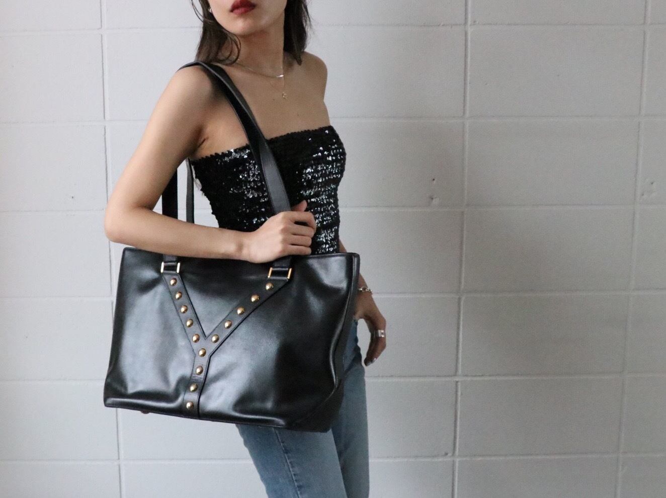 イブサンローランのレザートートバッグです。スタッズがエッジを利かせたデザインで、クラシックスタイルはもちろんカジュアルスタイルとも相性抜群◎