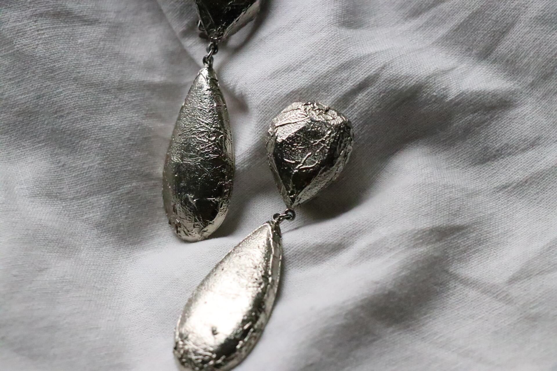 マットな質感のシルバー大振りドロップ型イヤリングの入荷です