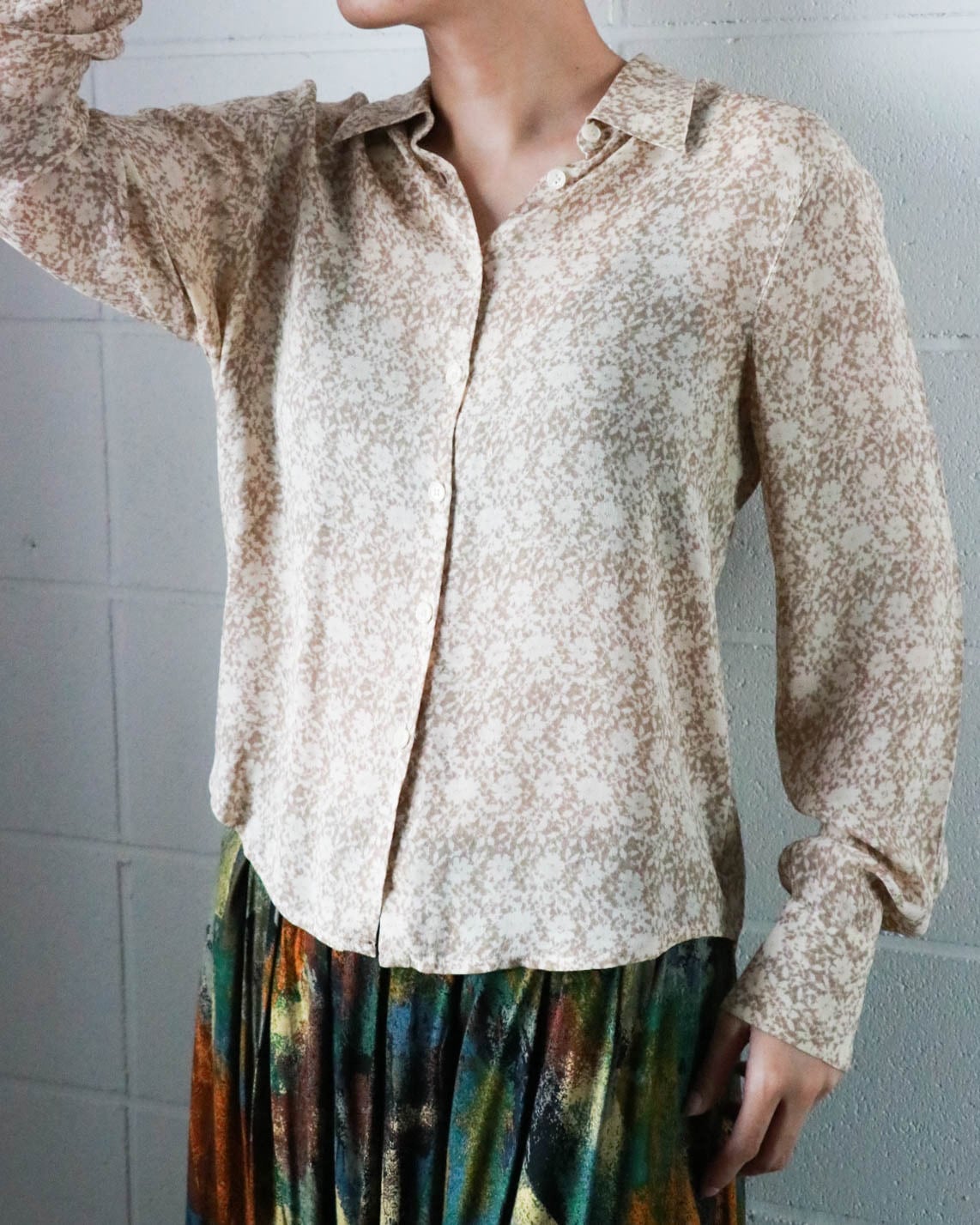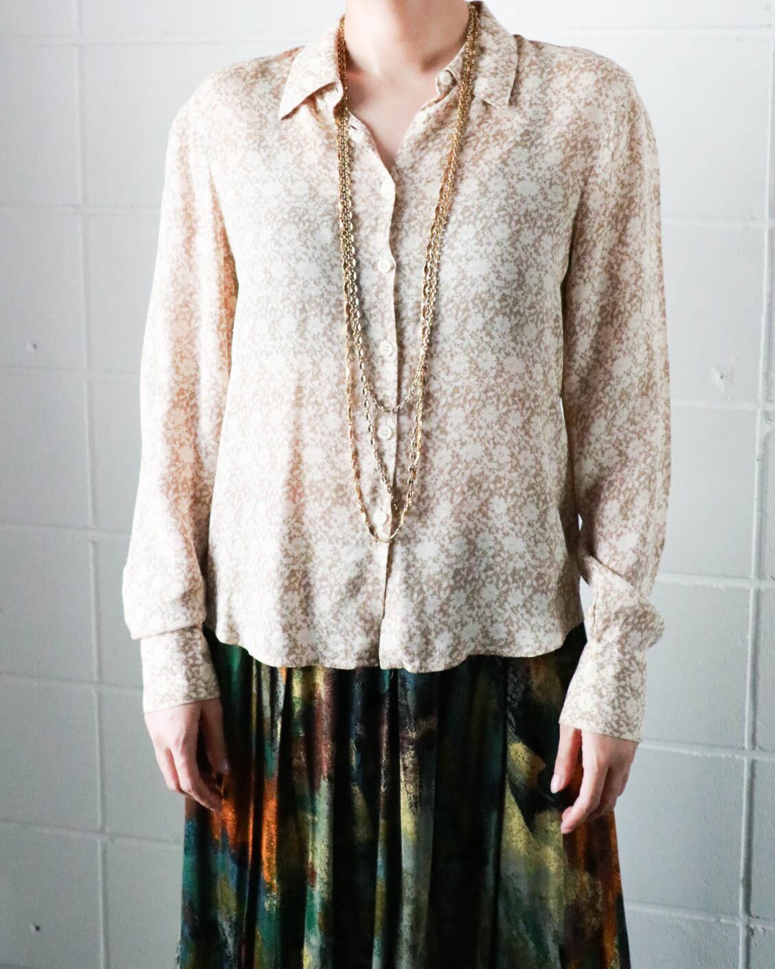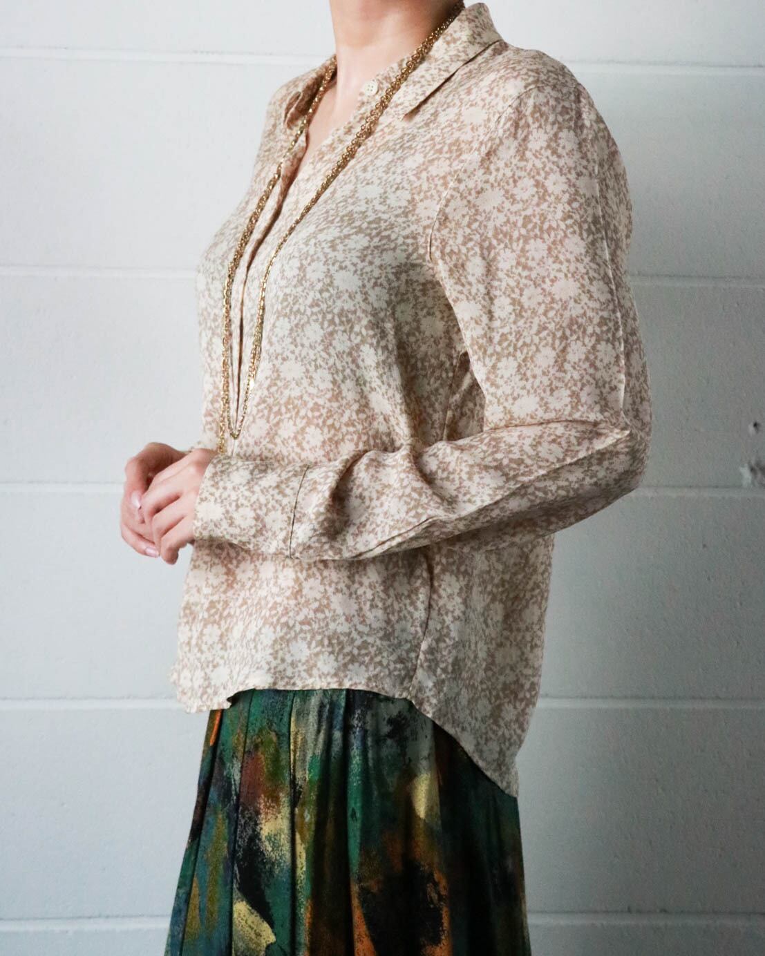 一点投入で華やぐシルクシャツ。よく見ると小花柄にも見えるプリントが女性らしく、エレガンスなムードに。軽やかな透け感で実用性も抜群です◎