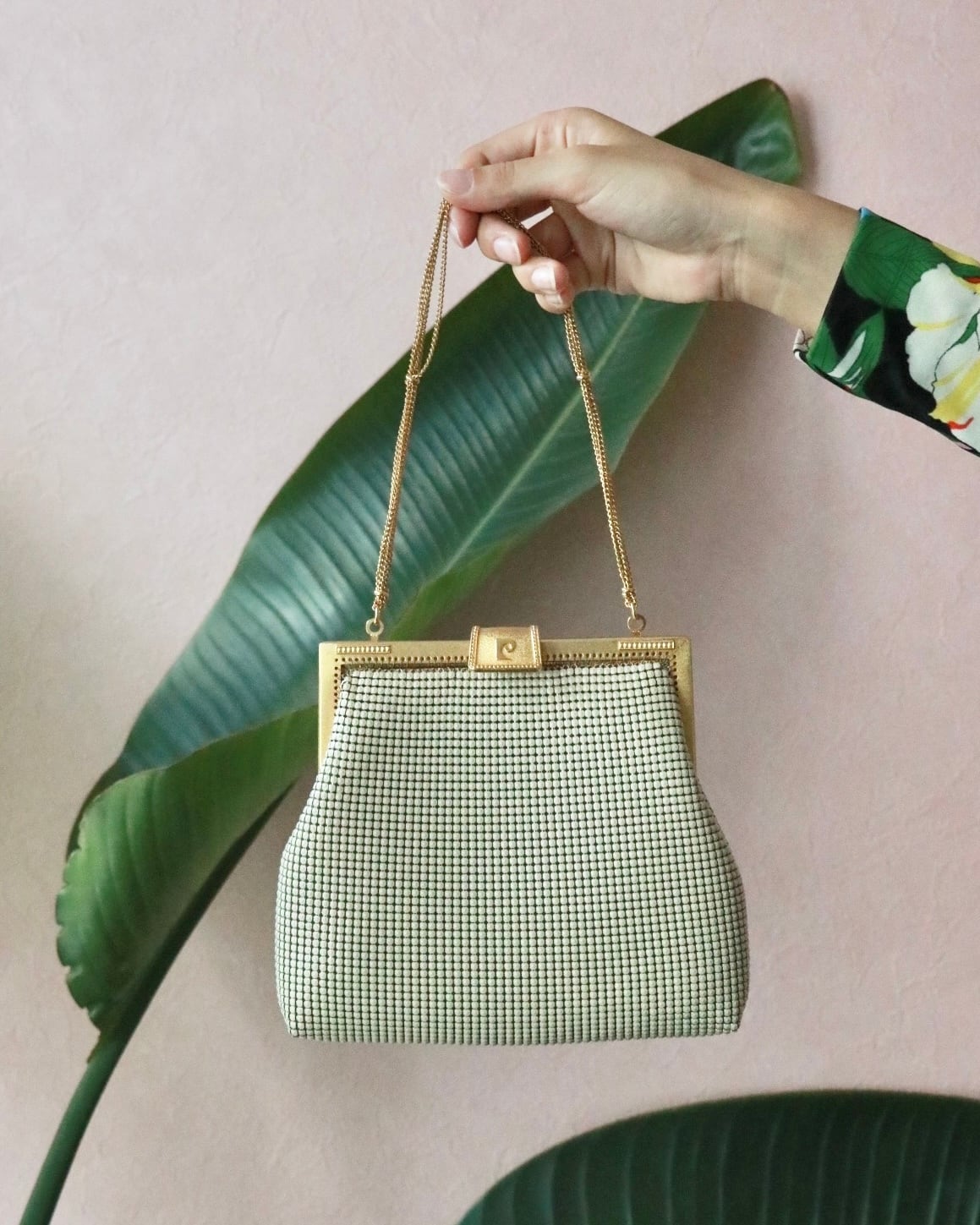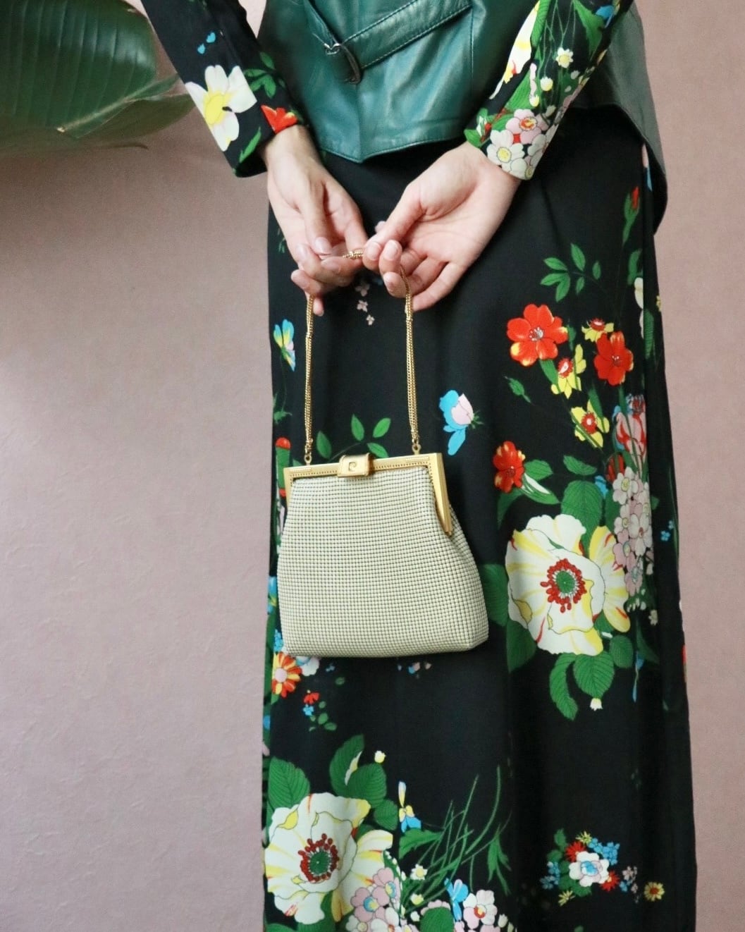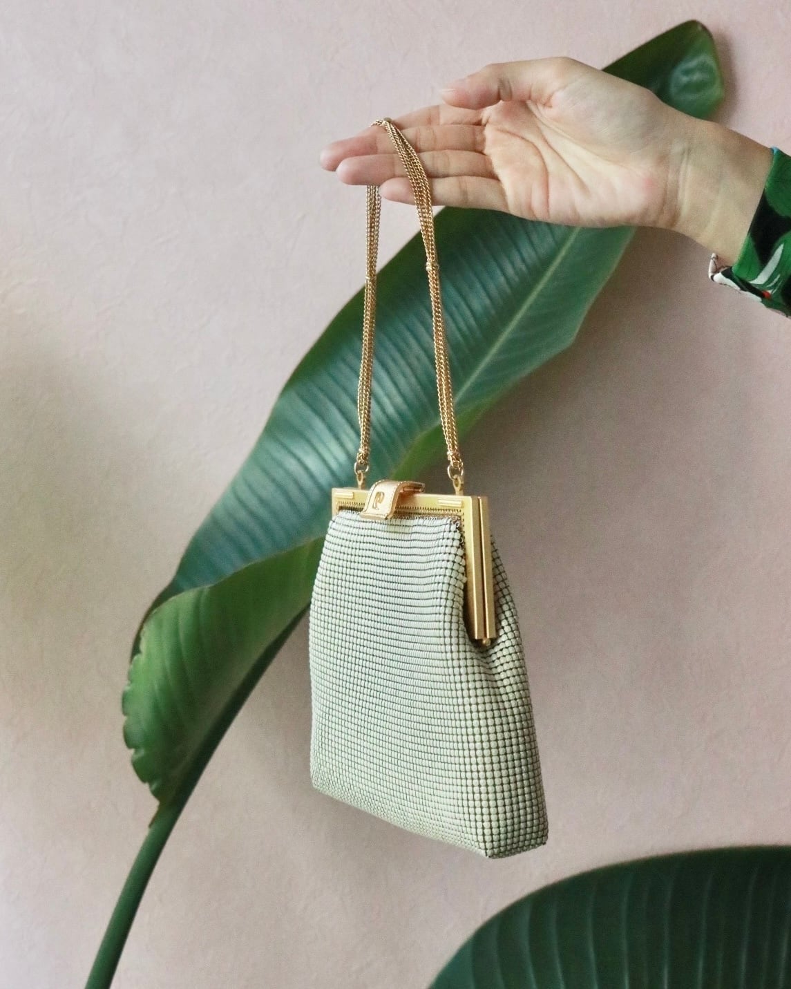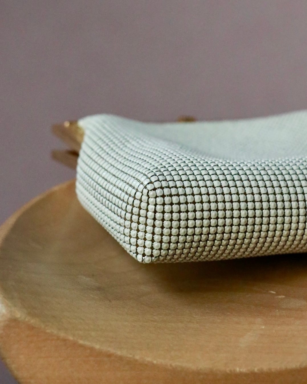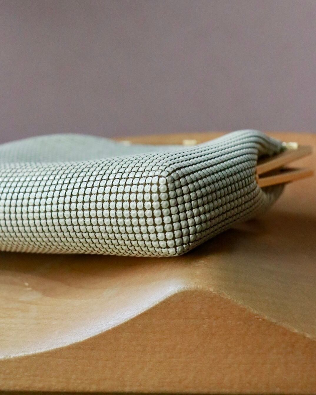 エレガントなホワイトベージュの艶やかなバッグはコーディネートのアクセントに。ゴールドチェーンが華やかです。