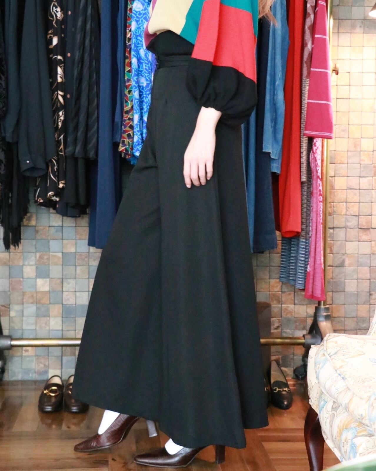 合わせやすいブラックカラーが嬉しいワイドフレアパンツ。