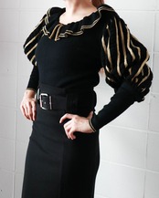 襟元の大きなフリルに、袖の大きなボリュームが目を引くデザインです。