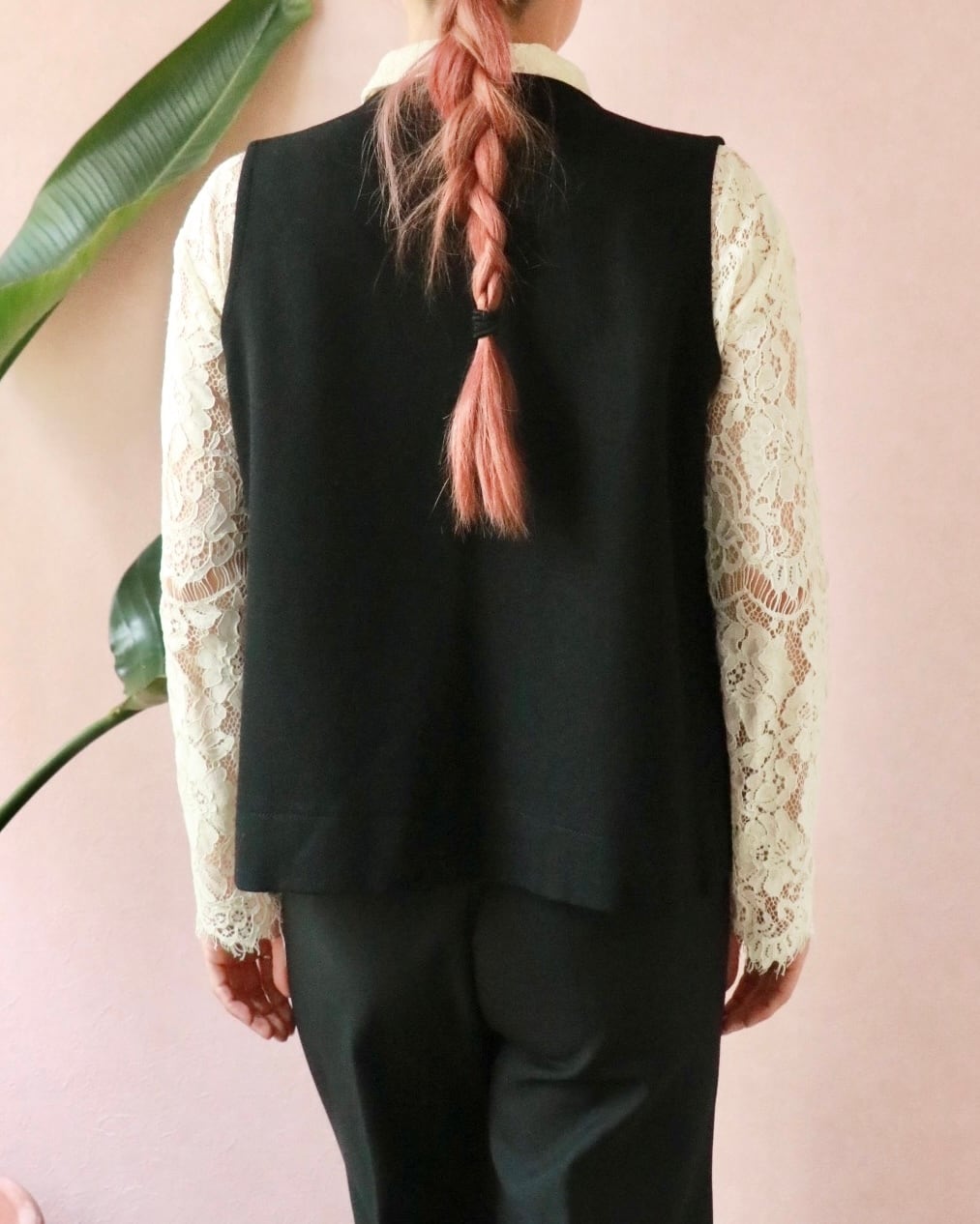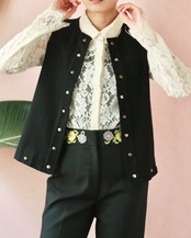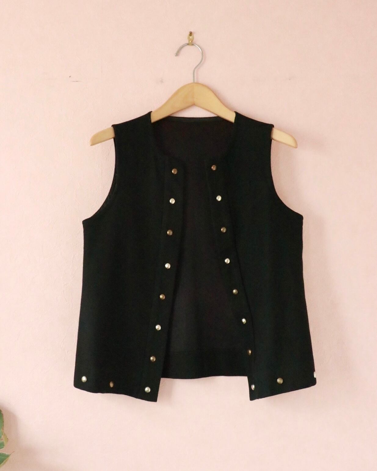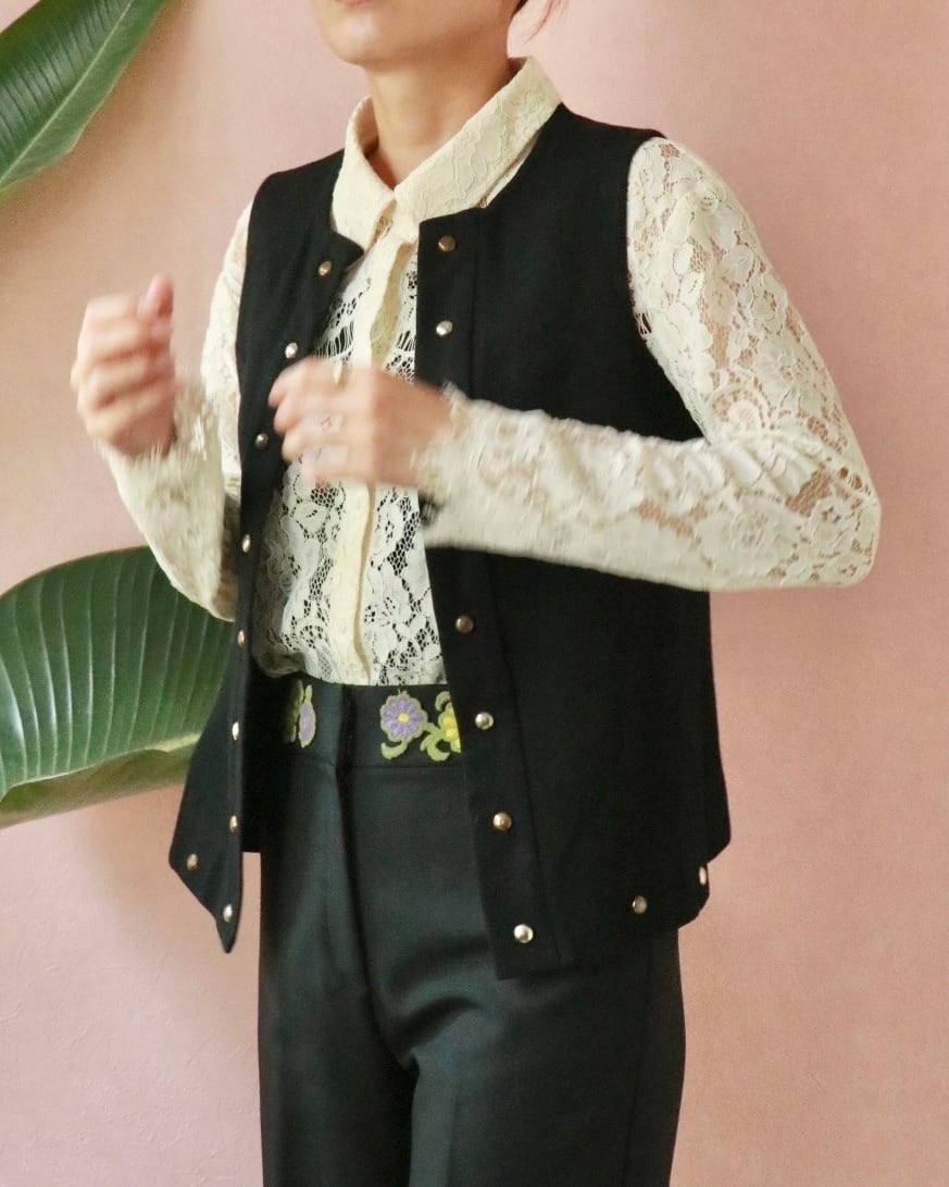 さっと羽織るだけでコーディネートのセンスアップをはかれるアイテム、ベスト。こちらは70年代のもの。ゴールドとシルバーのスタッズが飾りボタンのように交互に付いたデザインで、ブラックベースのアクセントに。季節を問わず、お好みのTシャツやブラウス、ワンピースなどお好きなアイテムに羽織って、ワンランク上のスタイリングを楽しんで。