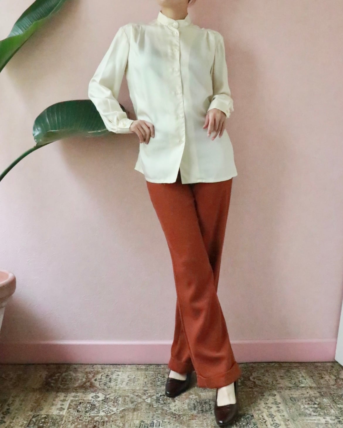 上品なスタンドカラーシャツも上質なシルクで女性らしさが添えられている。