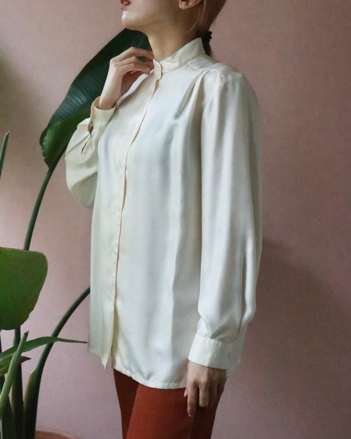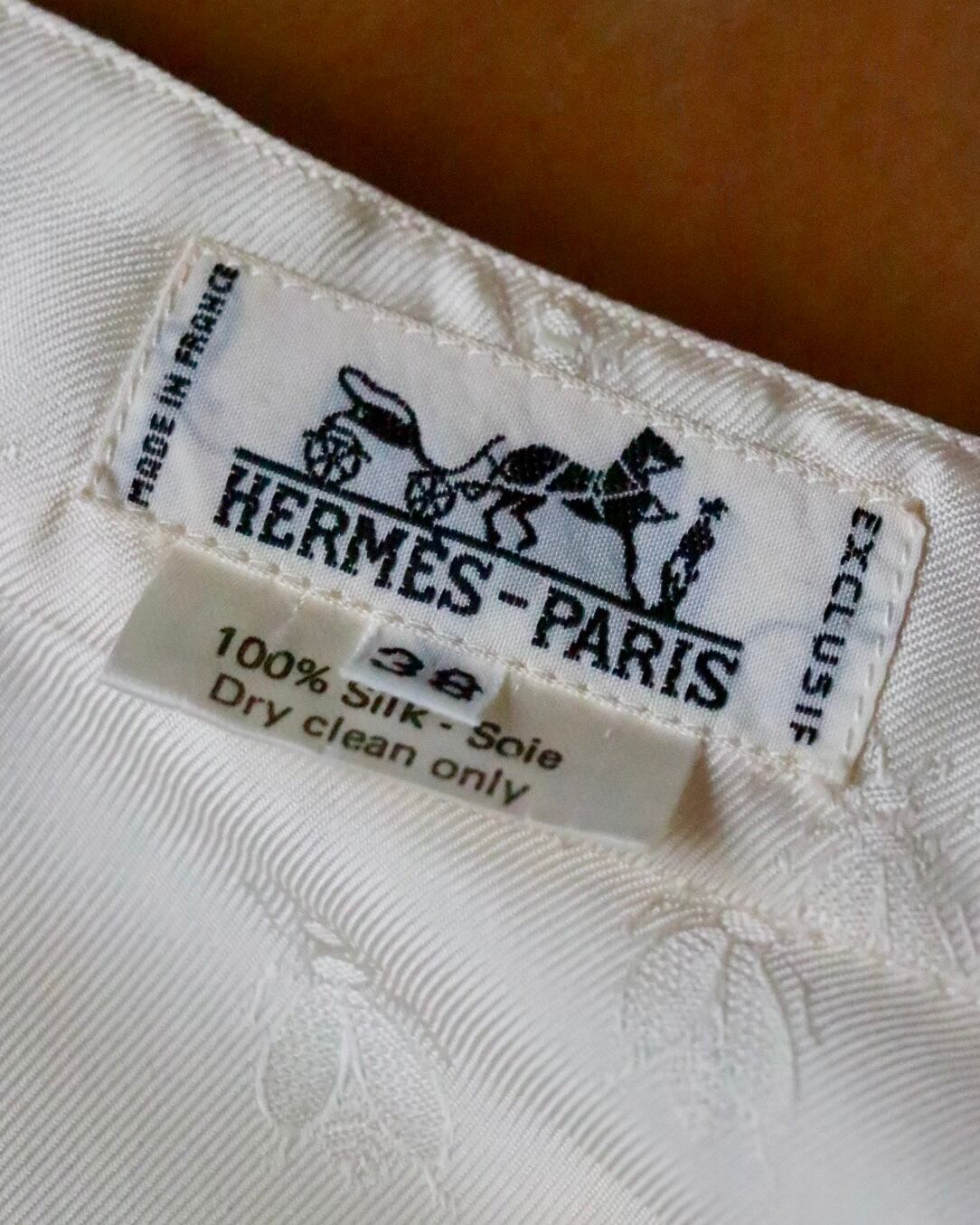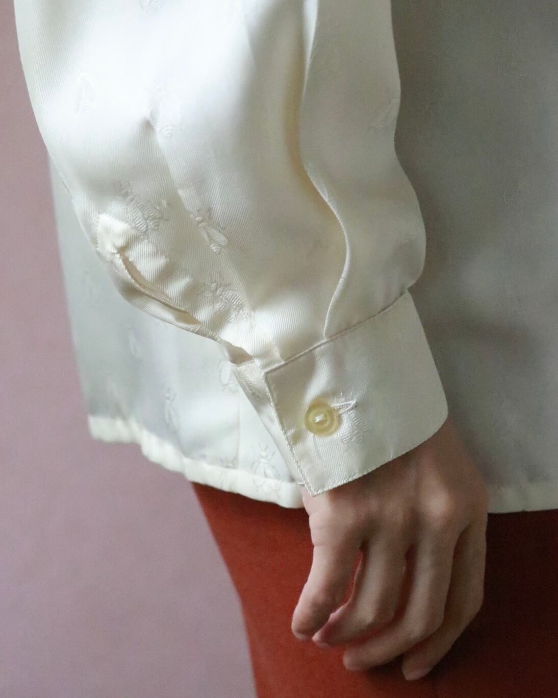 エルメスのシルクシャツは肌馴染みの良いほんのり生成りカラー。