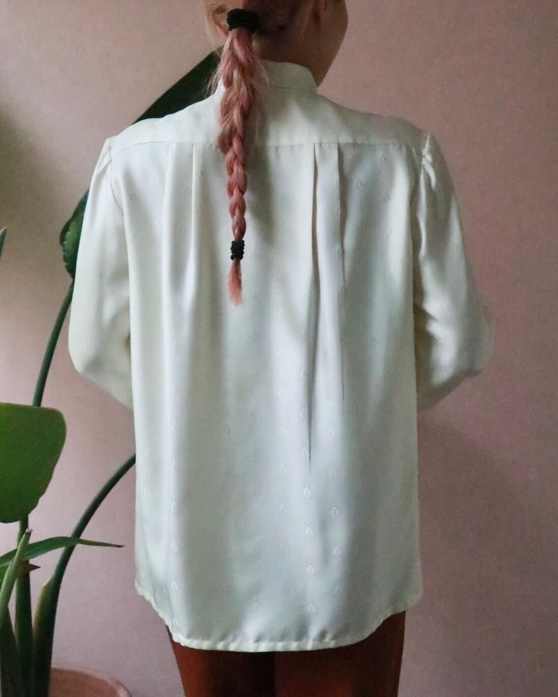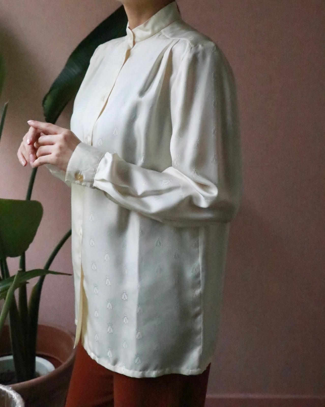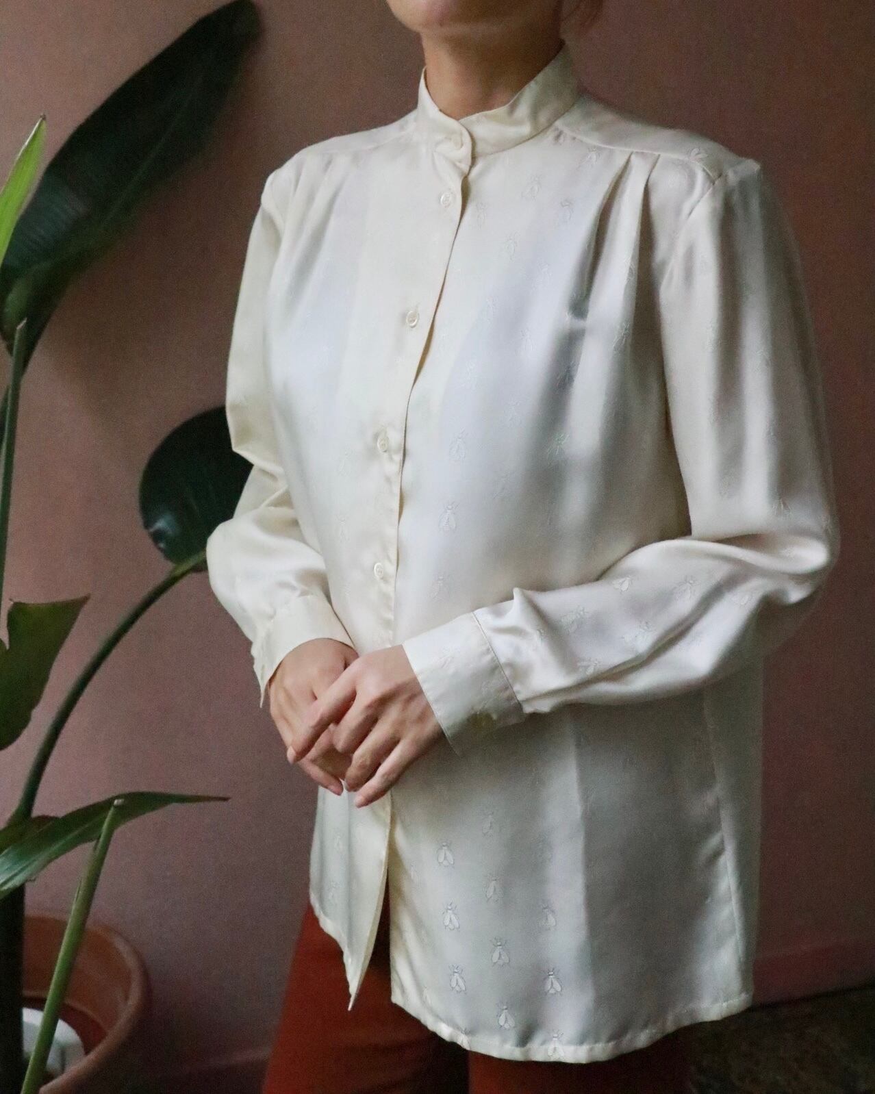 エルメスのシルクシャツは肌馴染みの良いほんのり生成りカラー。
