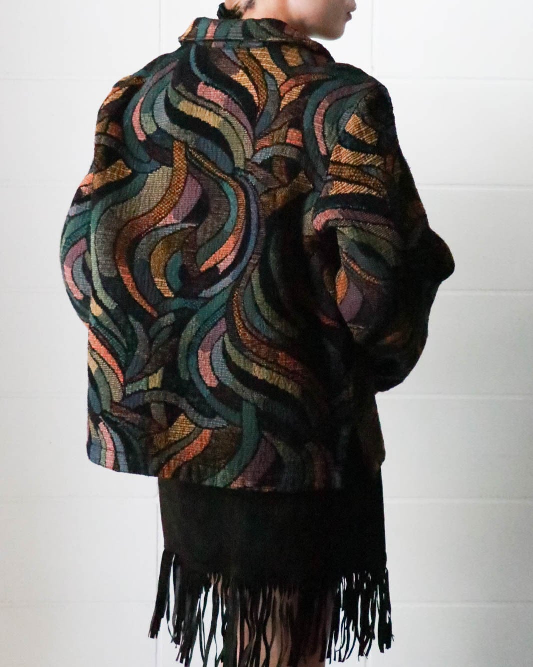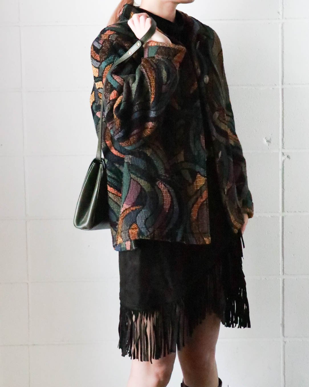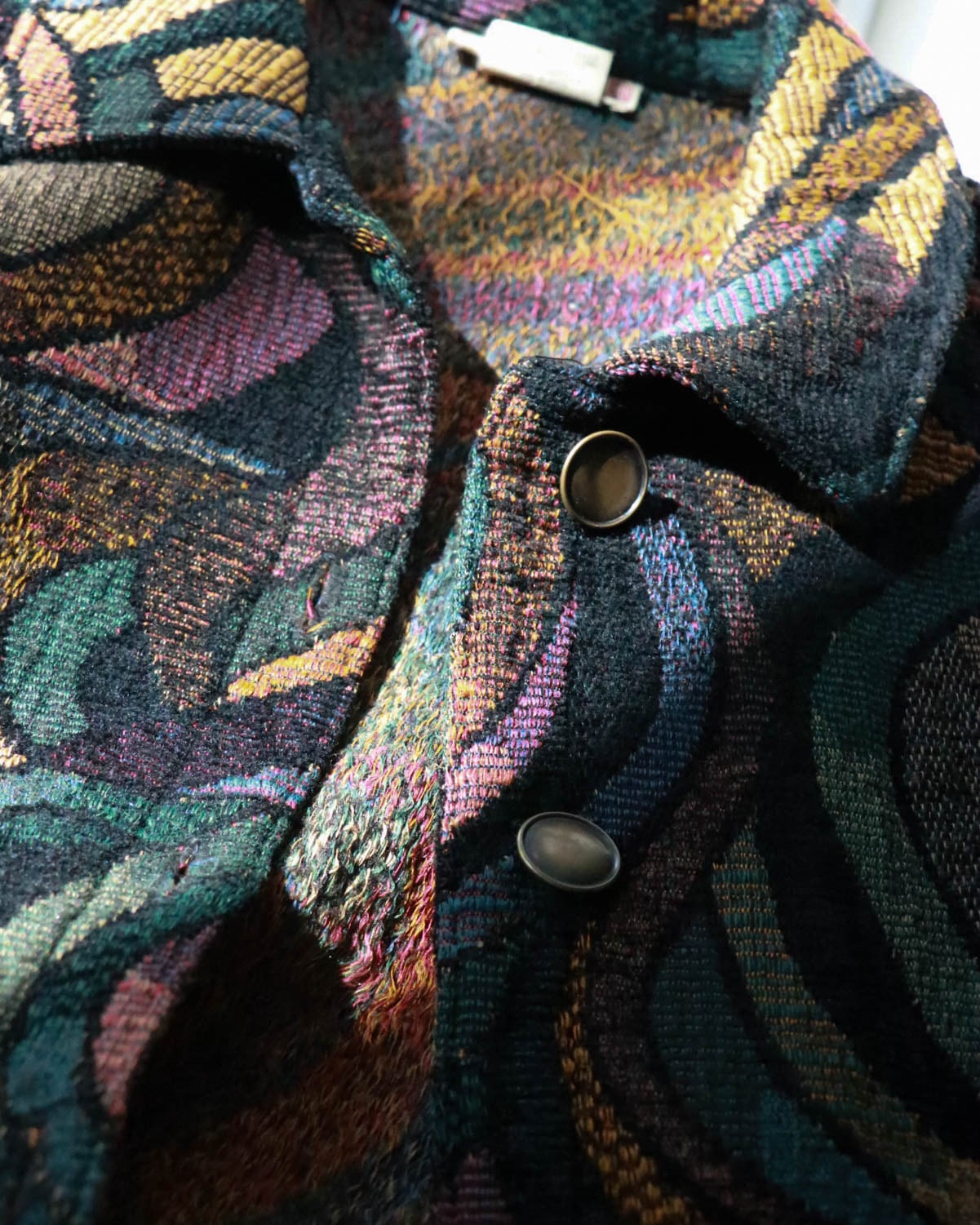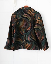 ブラックベースにマルチカラーの模様があそび心とシックな雰囲気をうまくミックスした、まさにヴィンテージならではの個性ある一着。オーバーサイズのシルエットはインナーも合わせやすく、これからの季節に大活躍します。