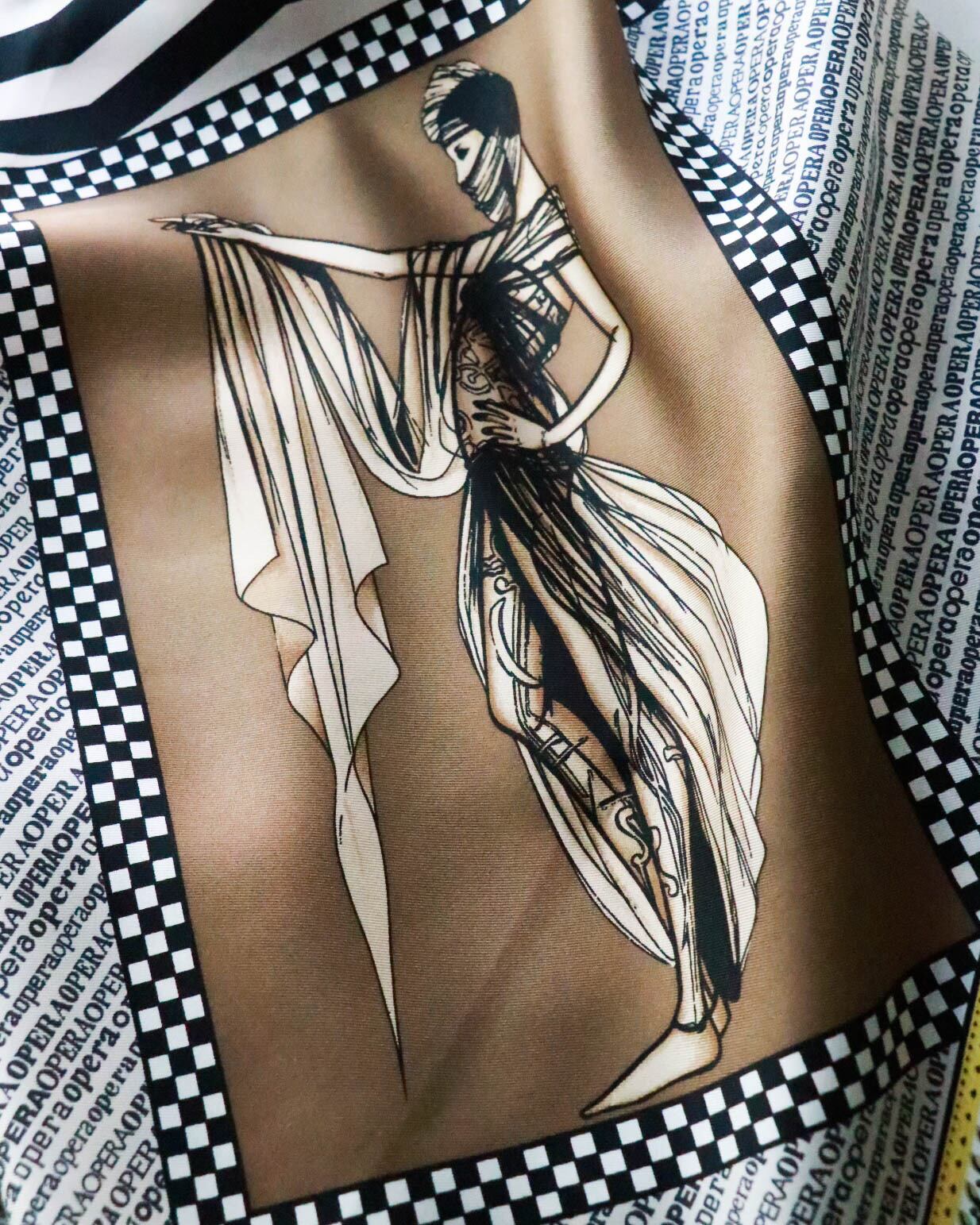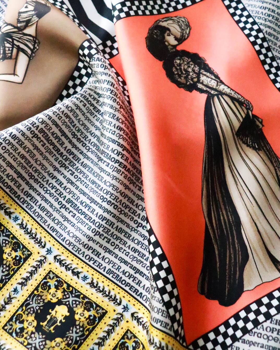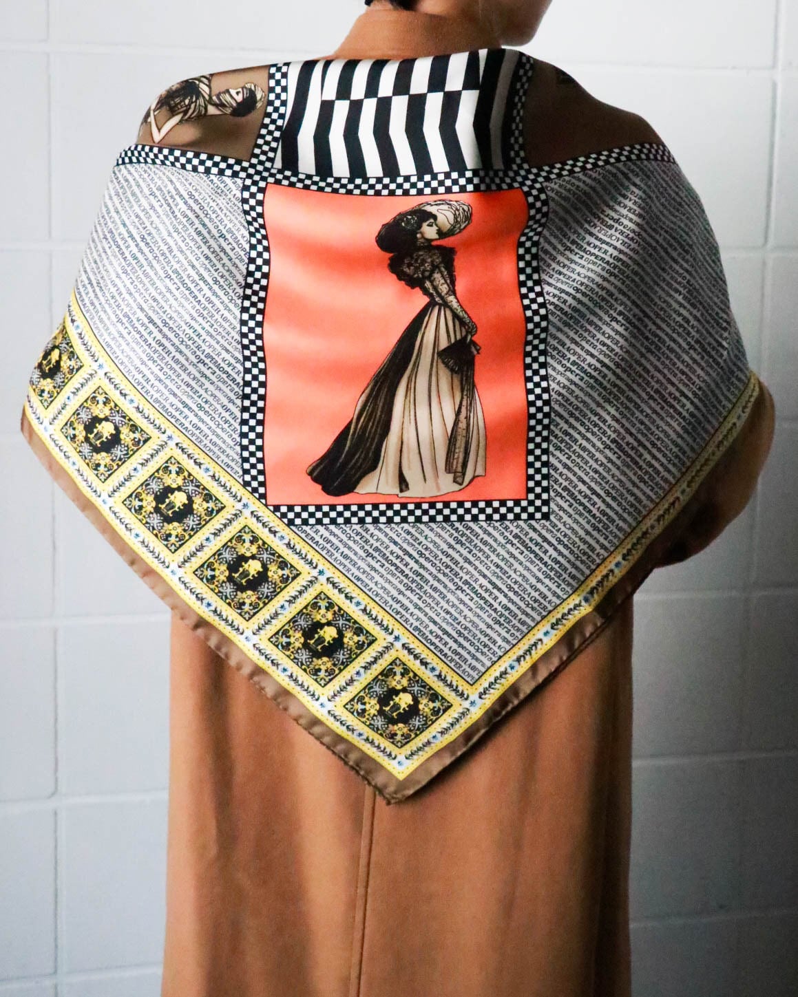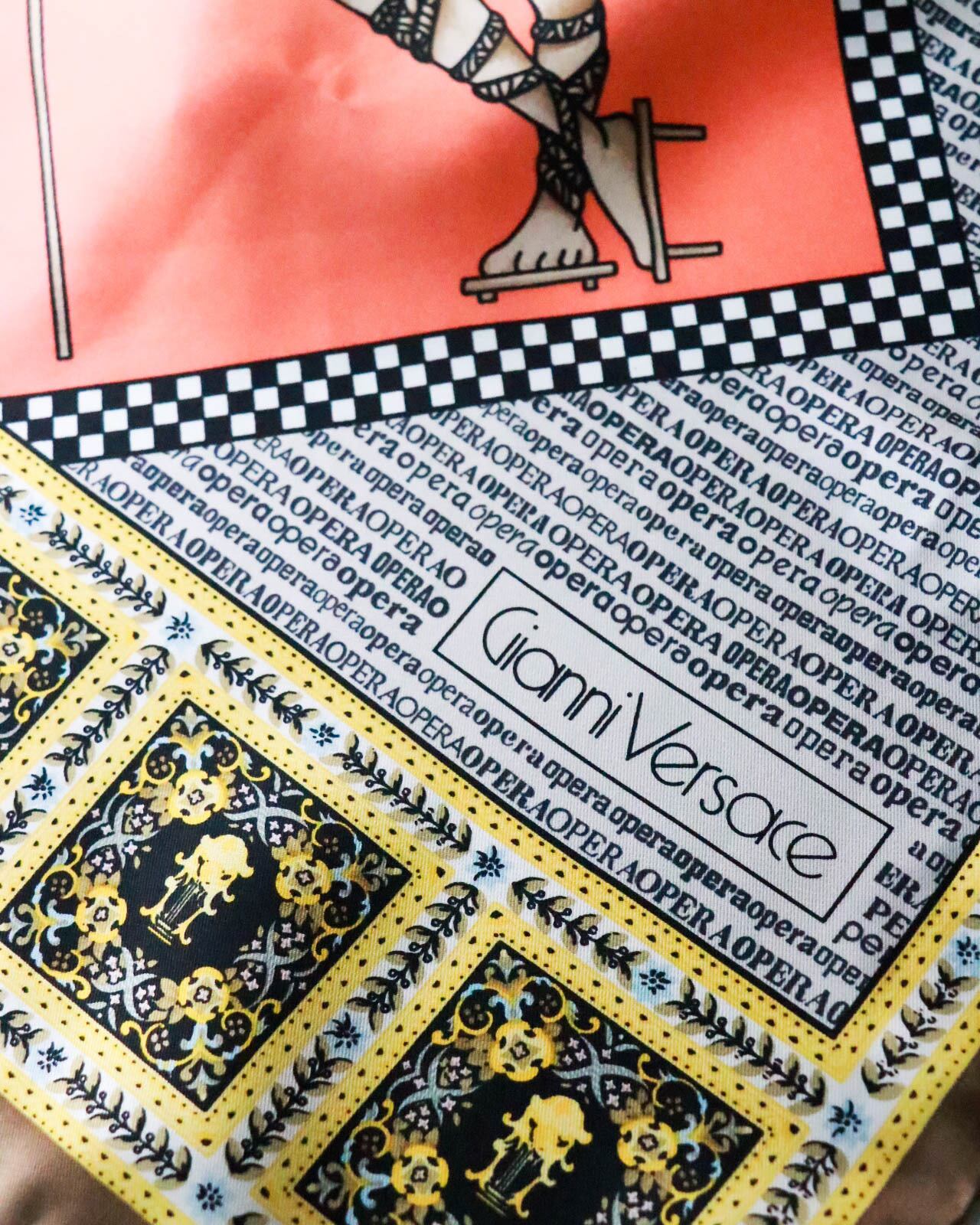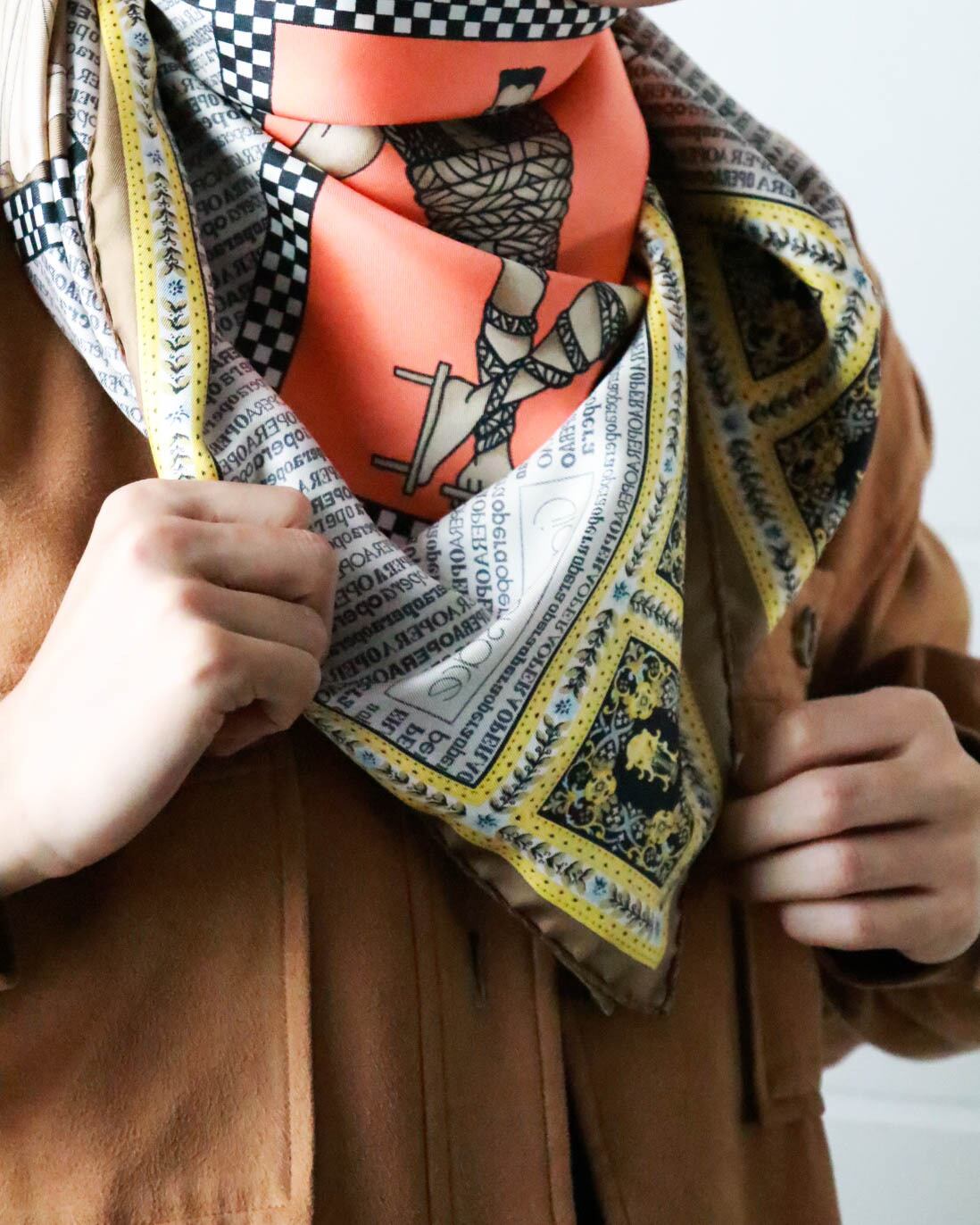 シルクスカーフはヴェルサーチのもの。西洋風のポートレイトデザインがユニーク。肩にかけるだけでも様になりコートなどに差し色としても取り入れやすい色彩です。