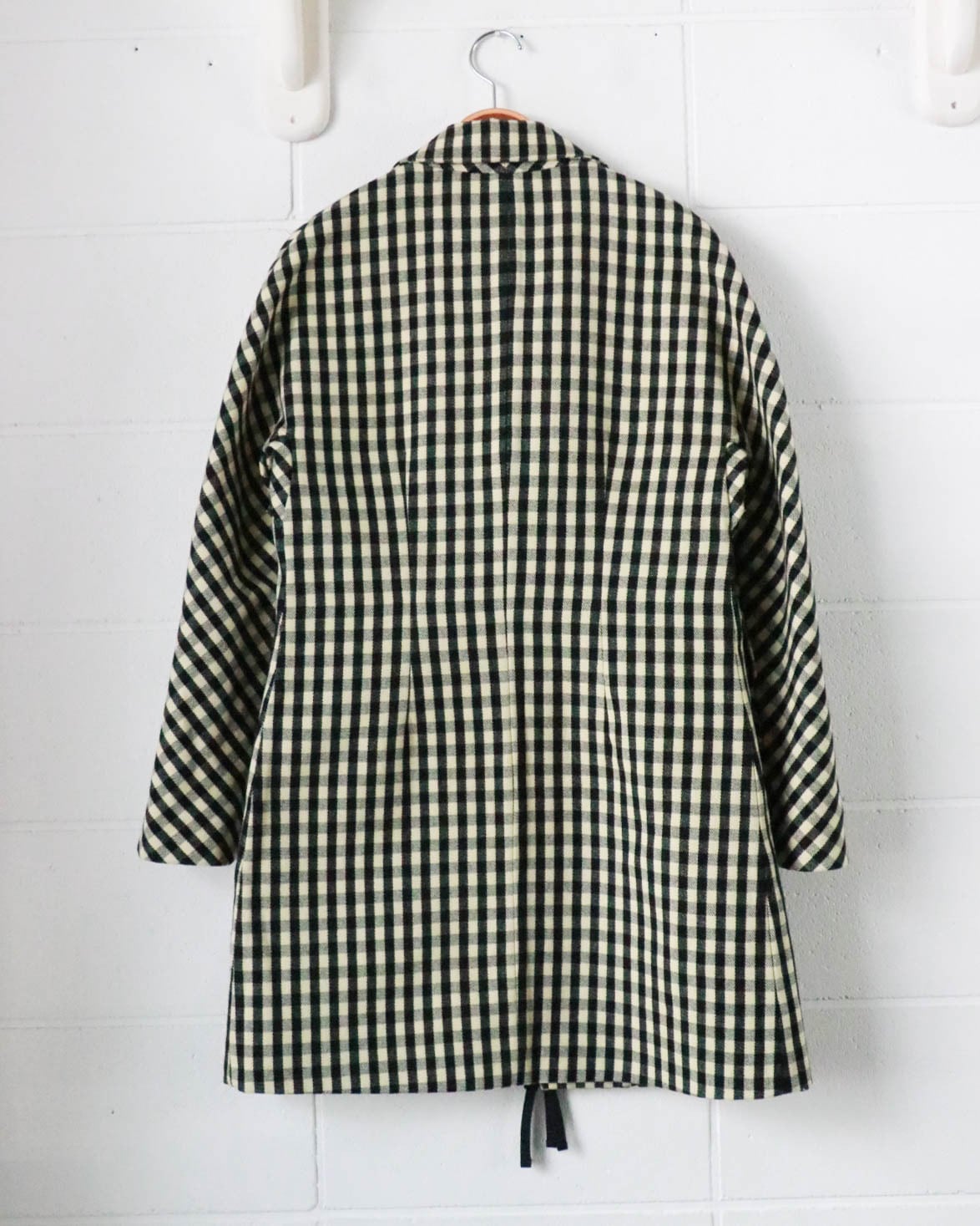 モダンと遊び心が共存する、MARNIらしい1着。こちらは2012年のもの。クラシカルなギンガムチェックを、立体的なシルエットと上質な素材でアップデート。羽織るだけでスタイルが完成する、存在感のあるコートです。