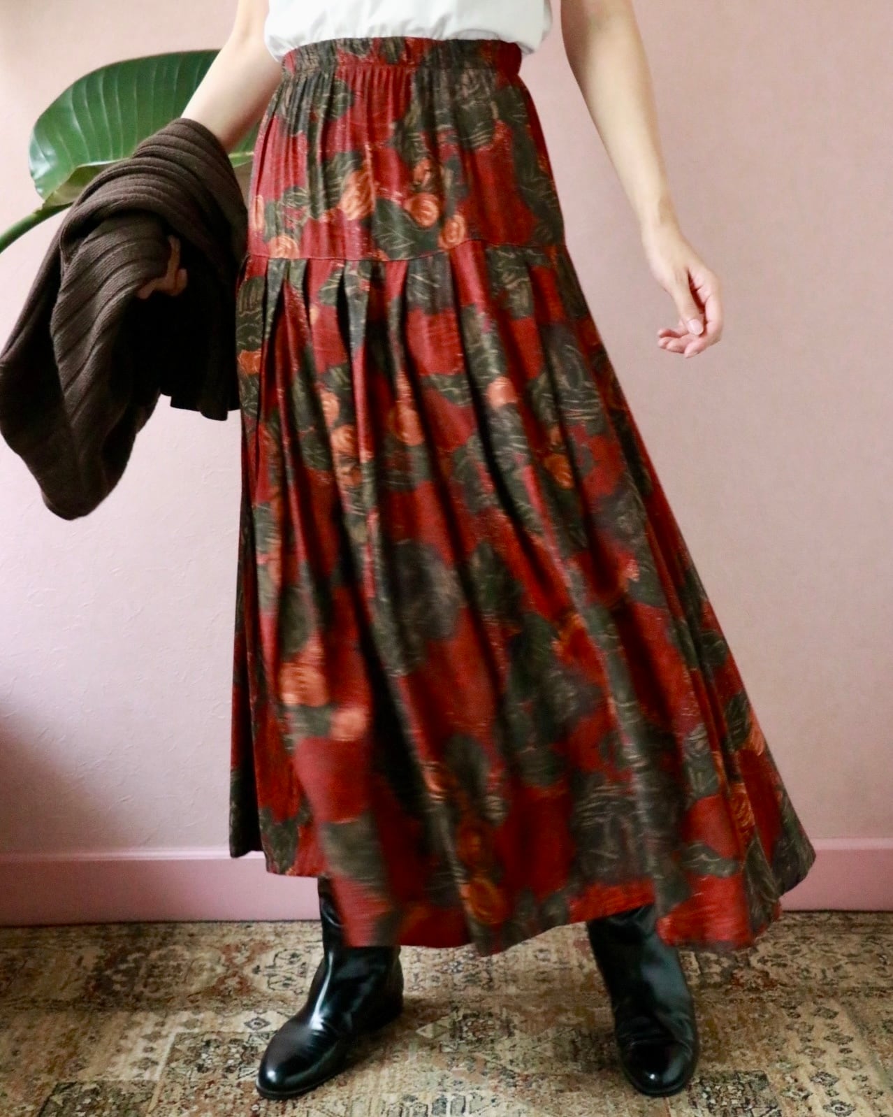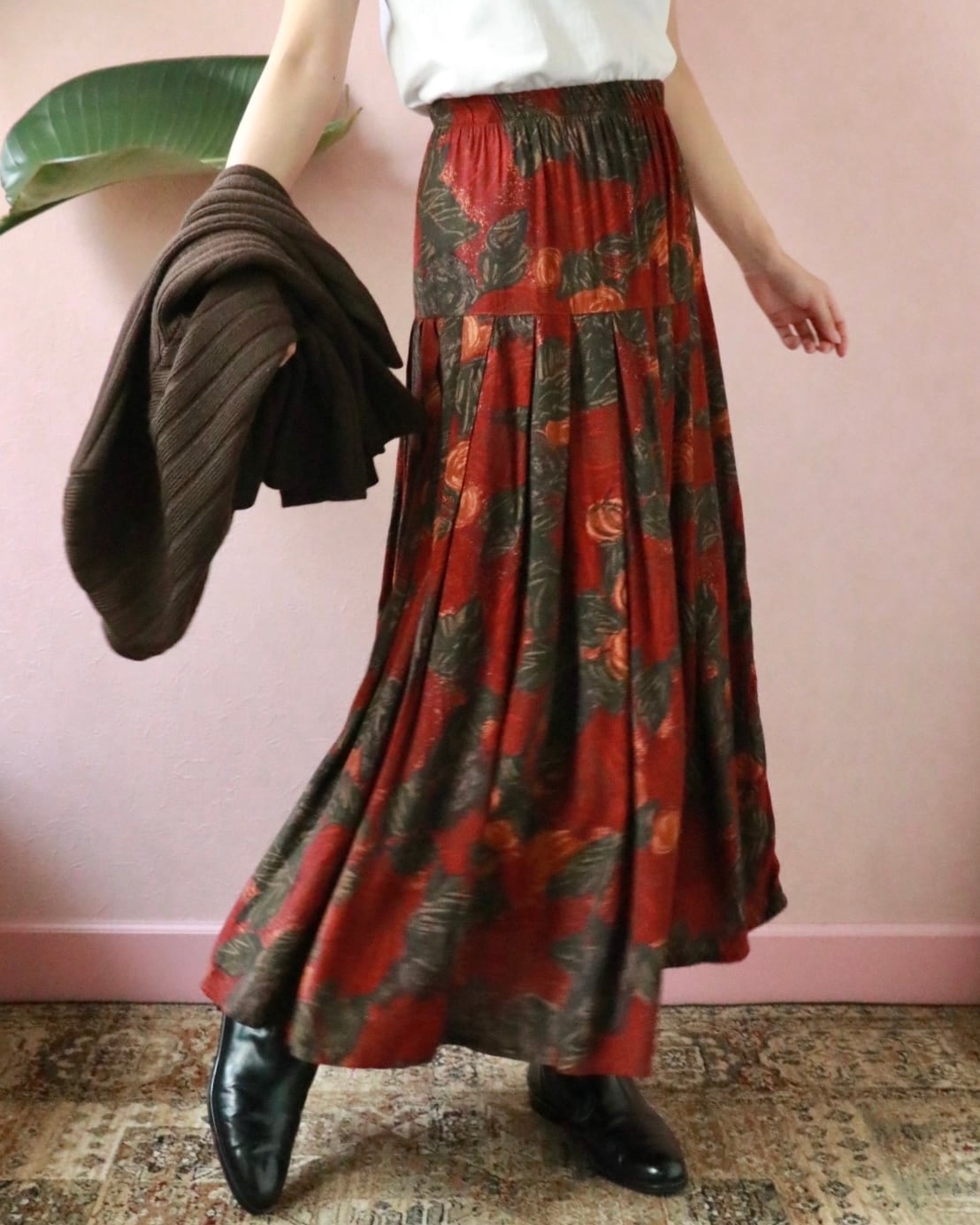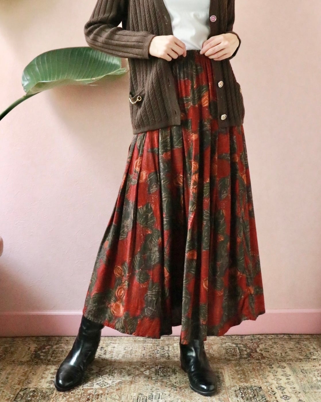 ヴィンテージ感漂う総柄スカートが入荷。深みのあるカラーと歩くたびに揺れるフレアシルエットがドラマティックな雰囲気を演出。シンプルなトップスと合わせるだけで、存在感のあるスタイルが完成します。