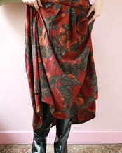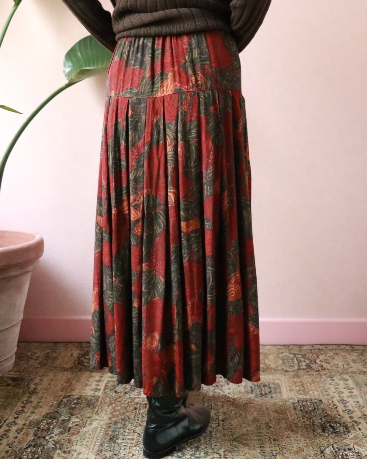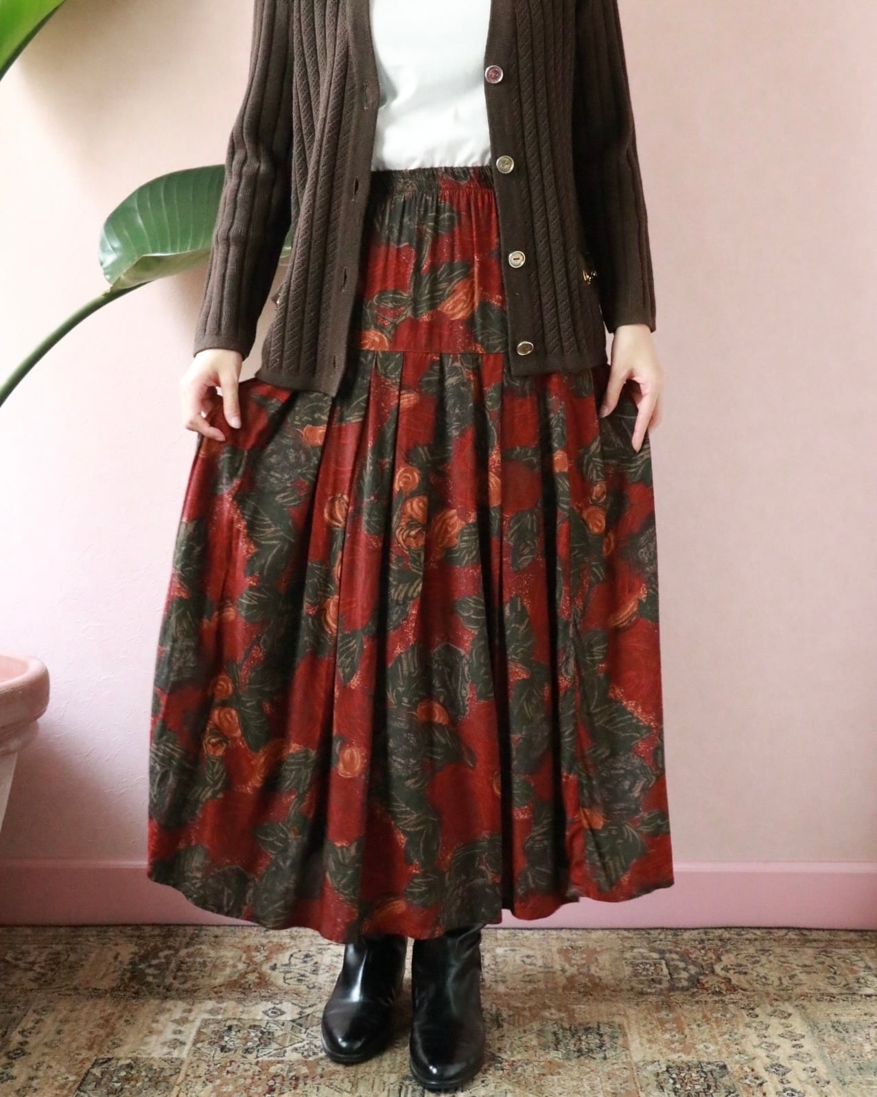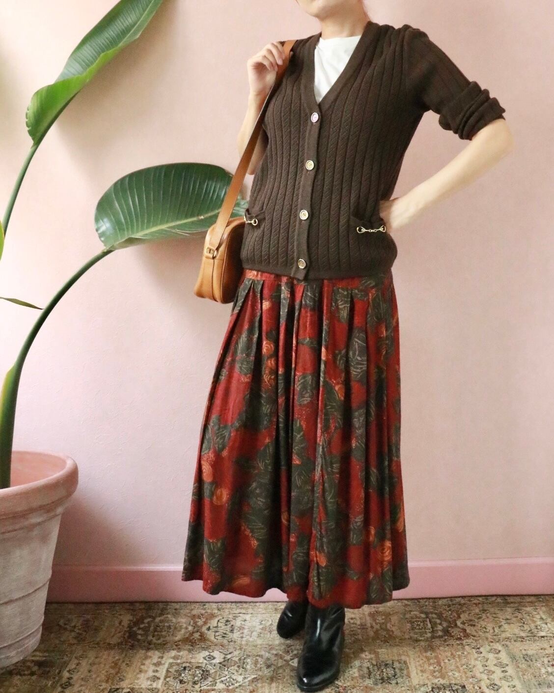 ヴィンテージ感漂う総柄スカートが入荷。深みのあるカラーと歩くたびに揺れるフレアシルエットがドラマティックな雰囲気を演出。シンプルなトップスと合わせるだけで、存在感のあるスタイルが完成します。