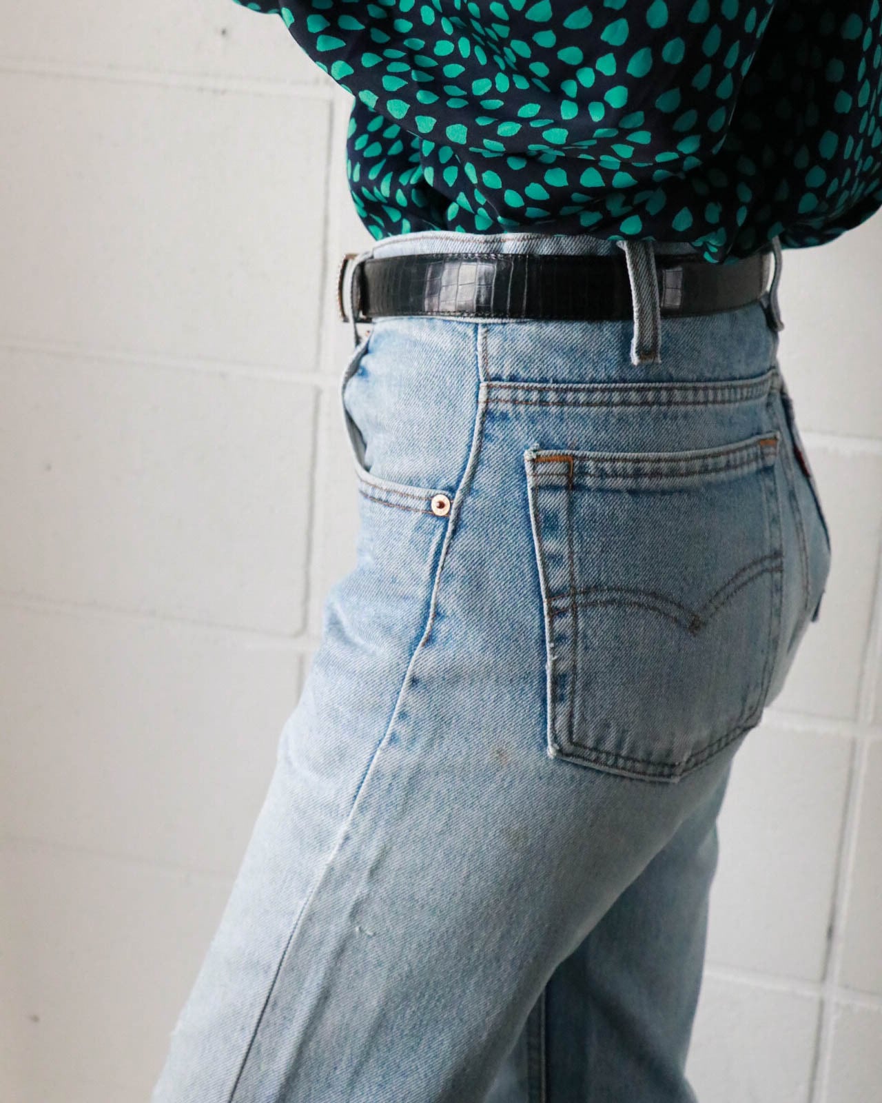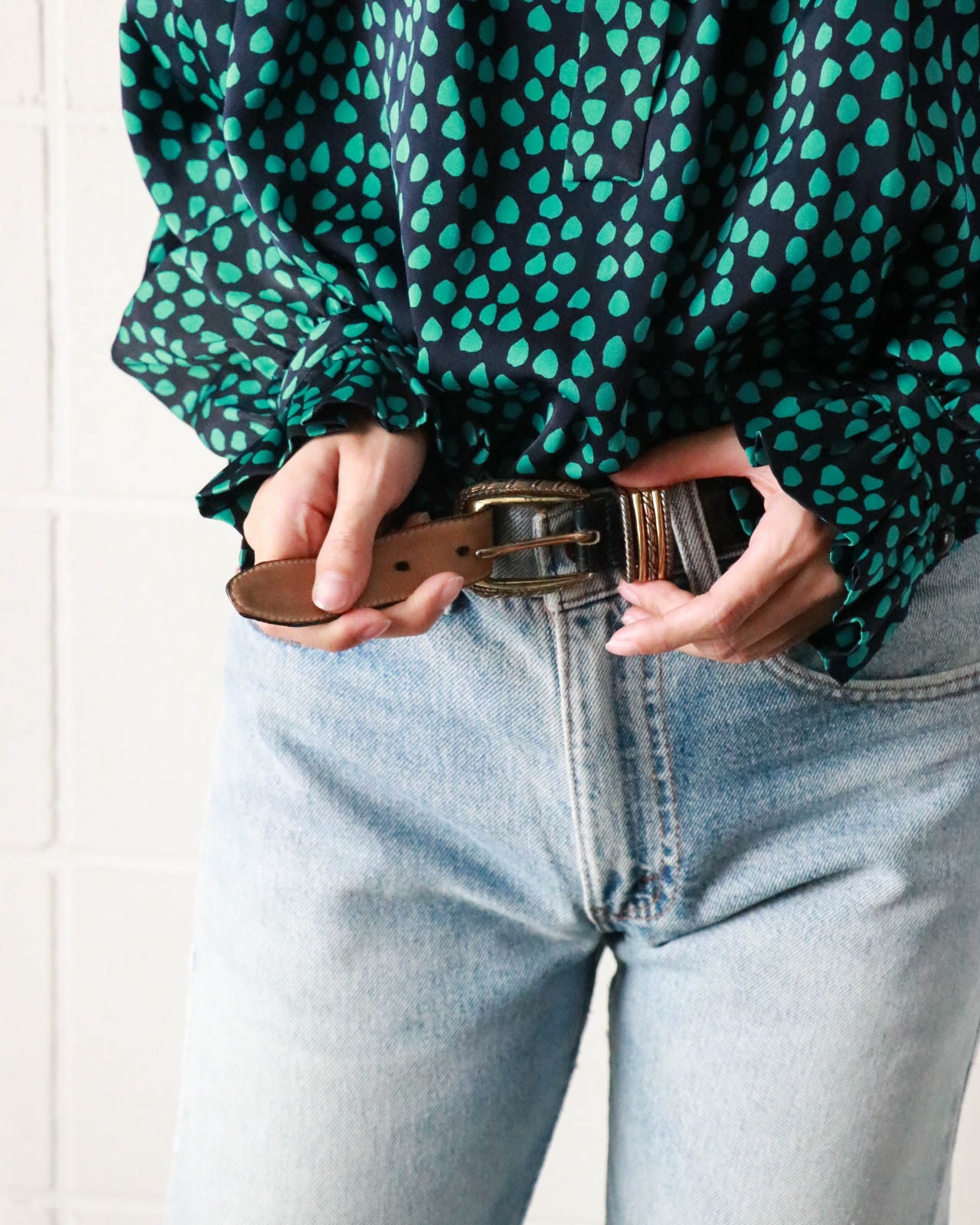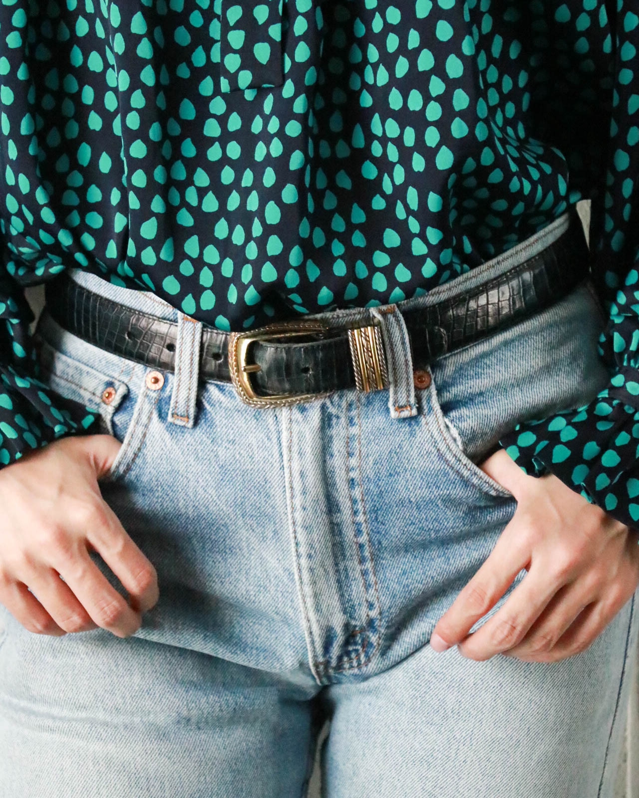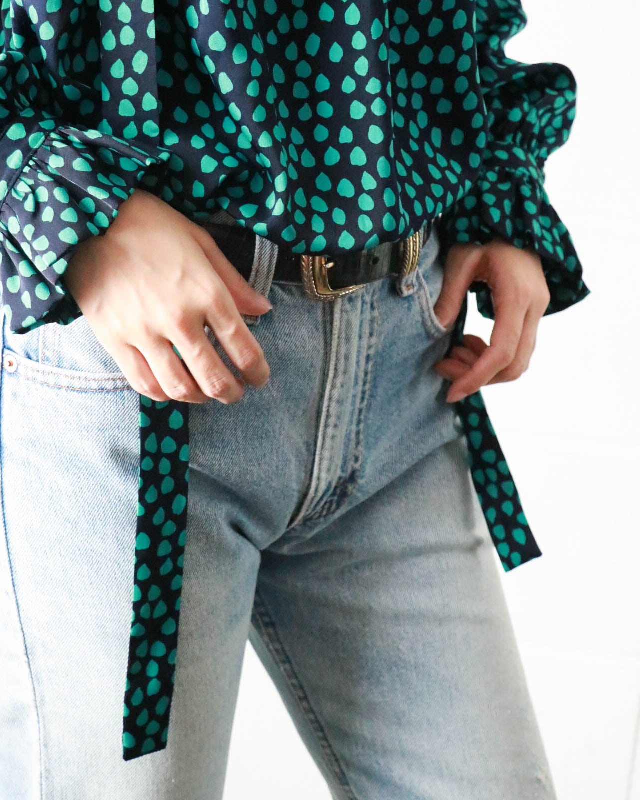 写真はデニムに合わせておりますが、ワンピースの上から巻いて、スタイリングを引き締めるのもおすすめです。