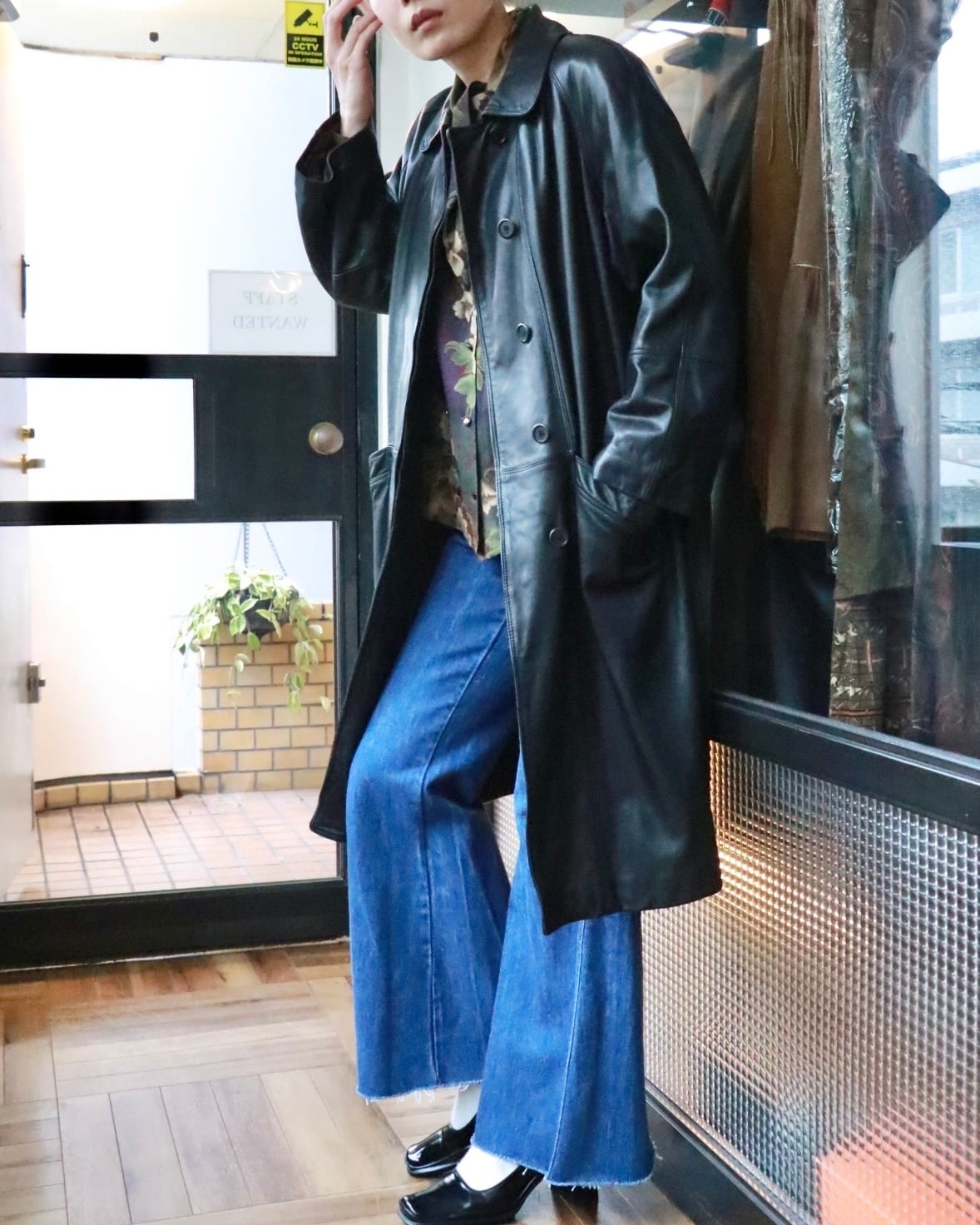 イタリア製のトレンチライクなレザーコートが入荷。洗練されたブラックレザーとゆったりとしたオーバーサイズのシルエットがとっても魅力的で厚手のインナーにも合わせやすい。上質で柔らかいレザーと実用的なディテールはヴィンテージならでは。タイムレスなデザインにトレンド感をプラスし、カジュアルにもモードにも自在に溶け込むワードローブの主役級アイテムです。