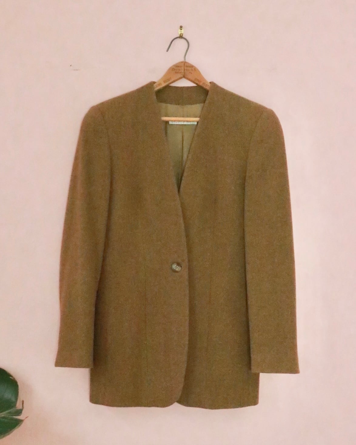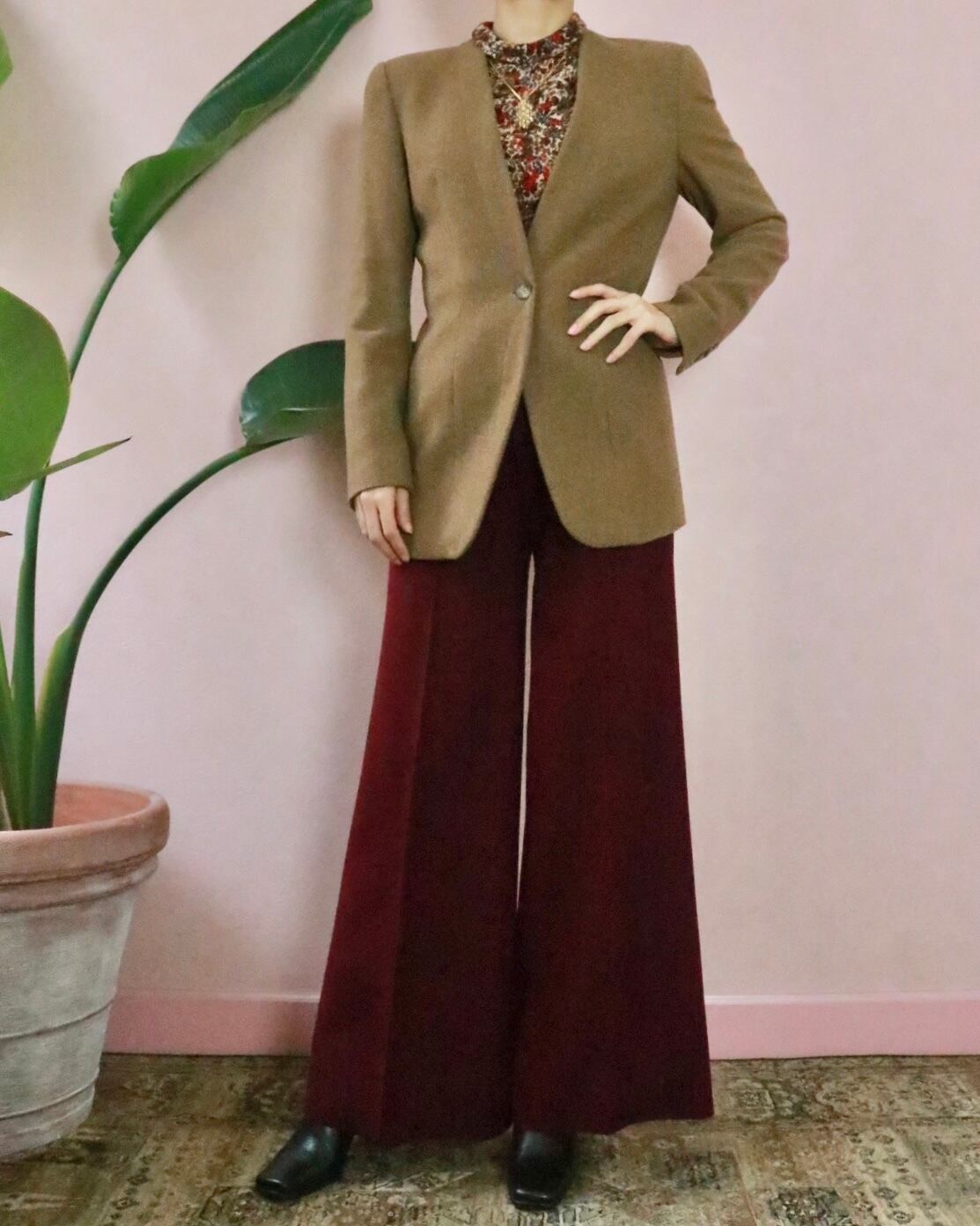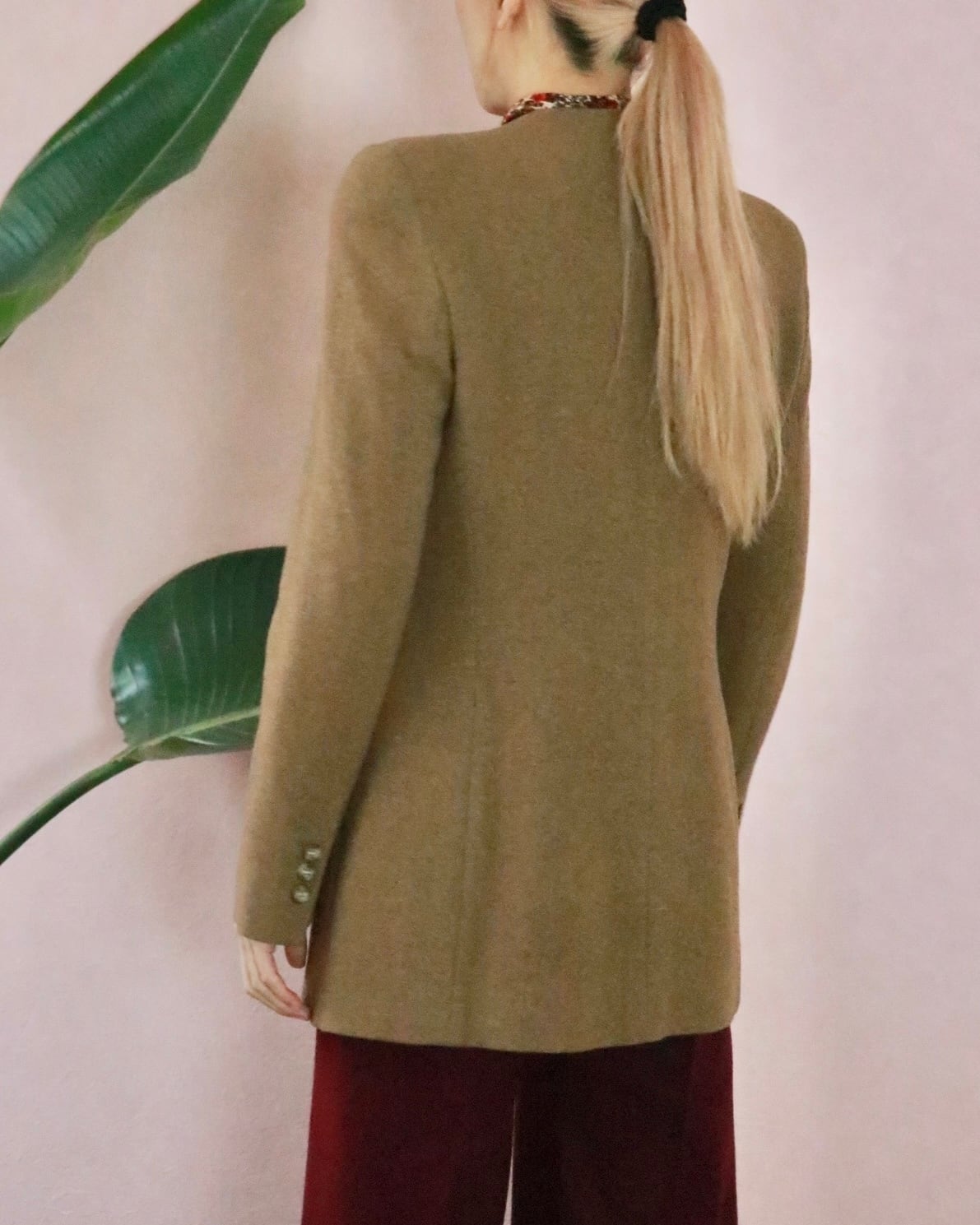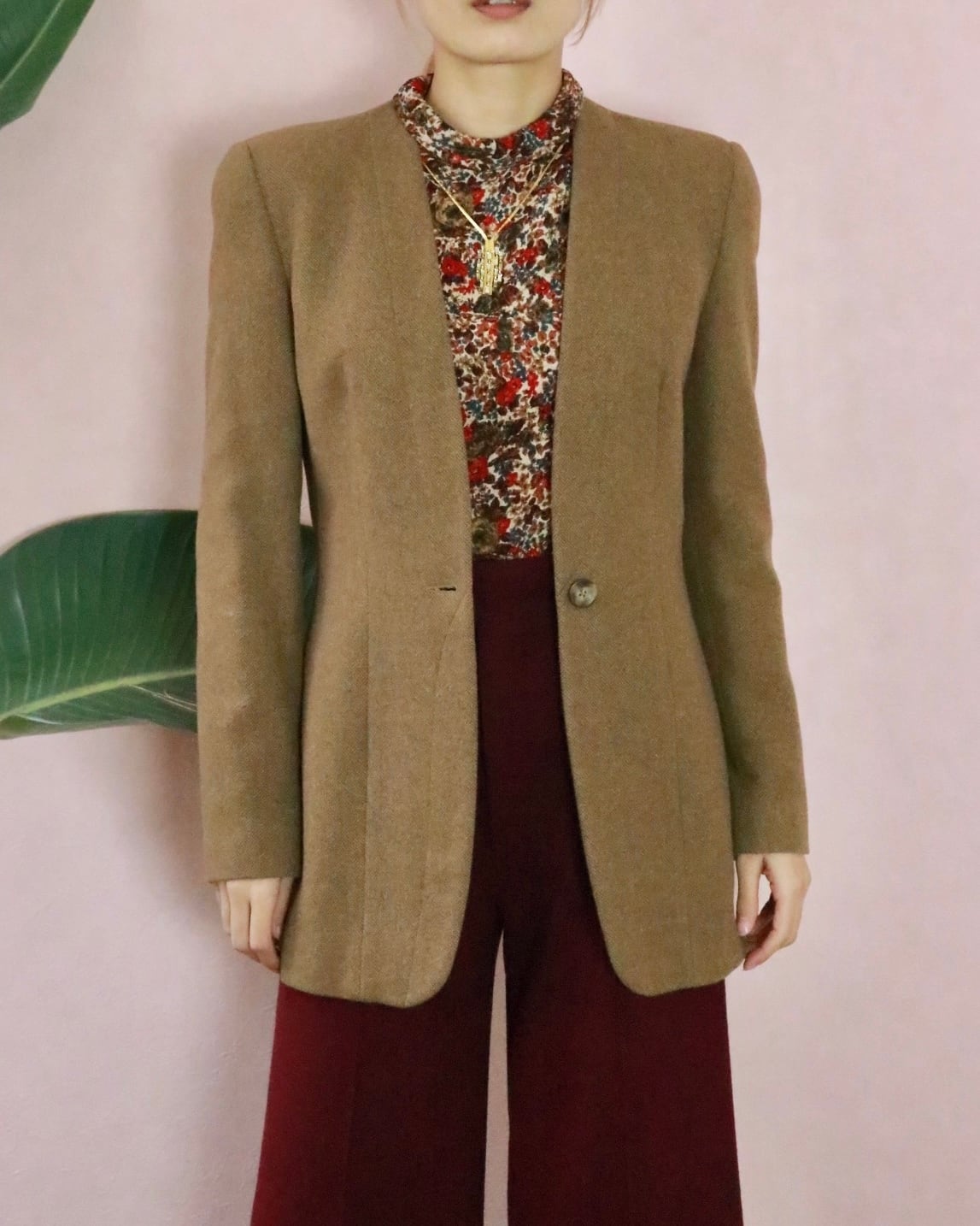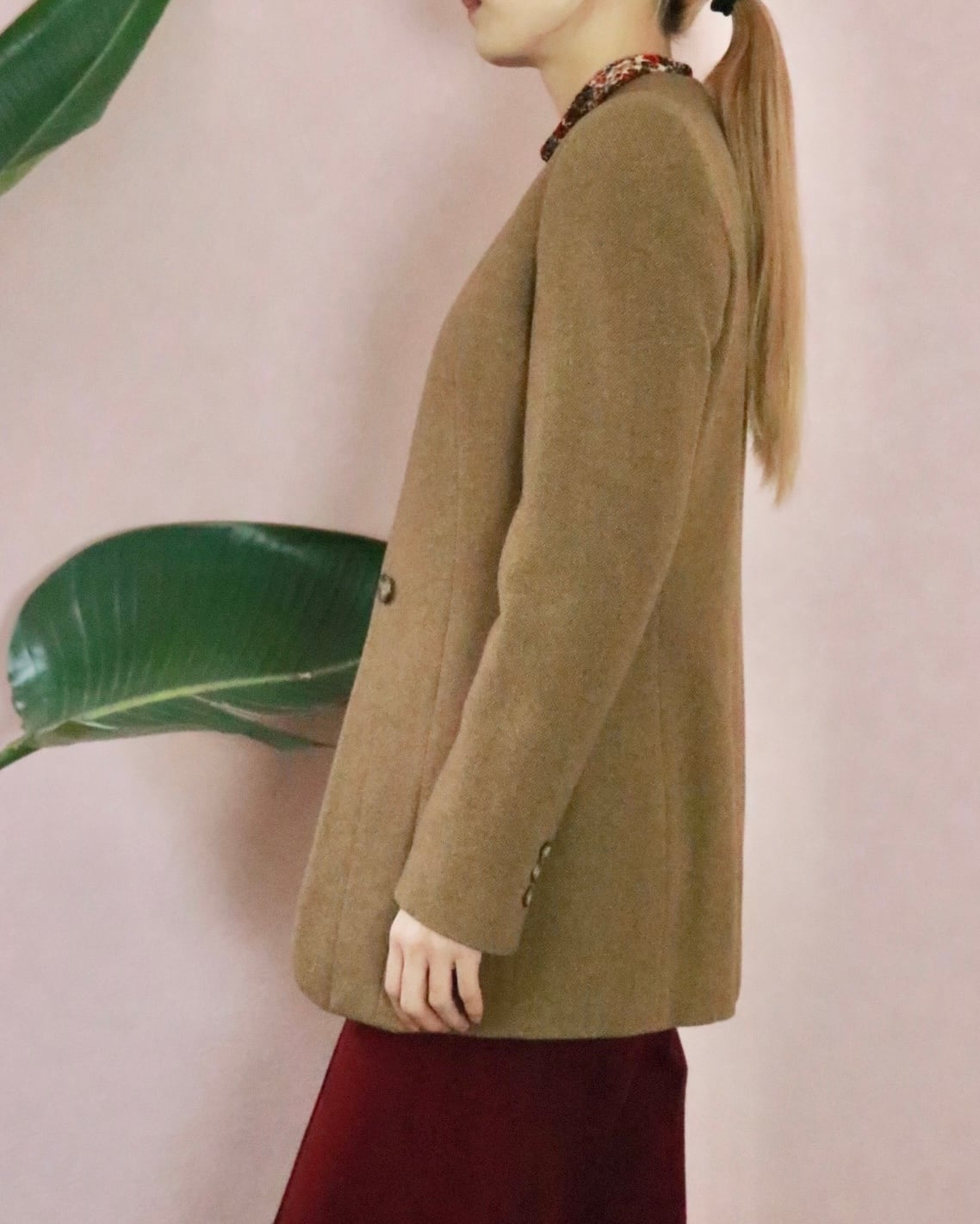洗練されたシルエットにノーカラー、細やかな美しいディテール、お尻まで隠れる着丈、カシミア混の上質な素材に上品な色合い。
