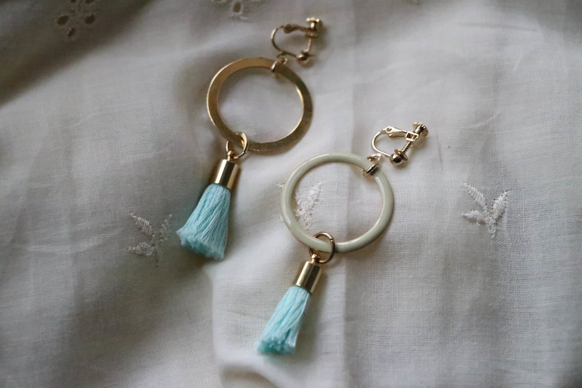 オフホワイトのエナメルサークルにパステルグリーンのフリンジが可愛いらしいハンドメイドイヤリング