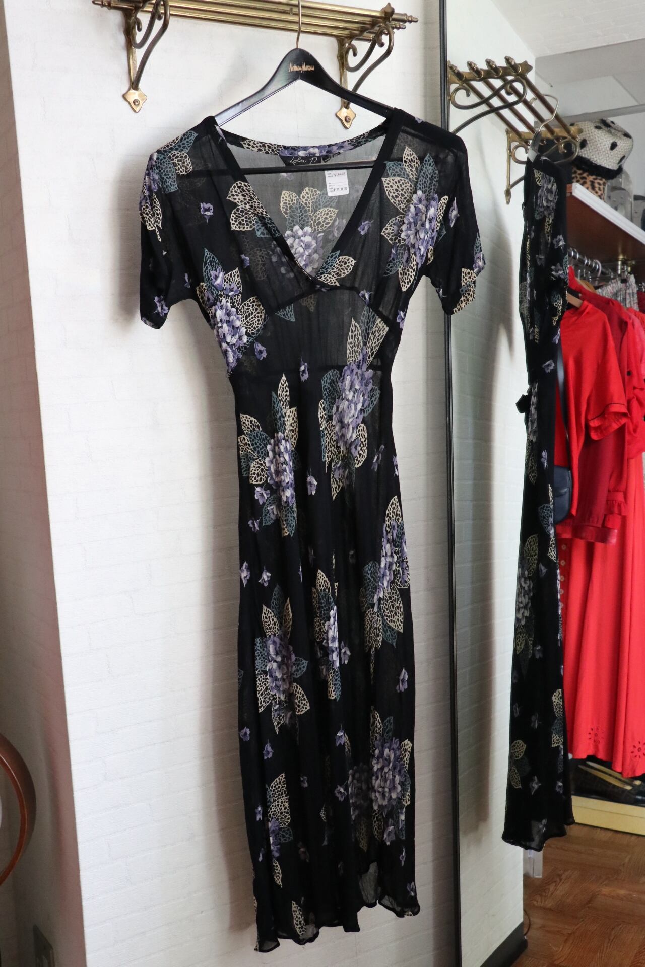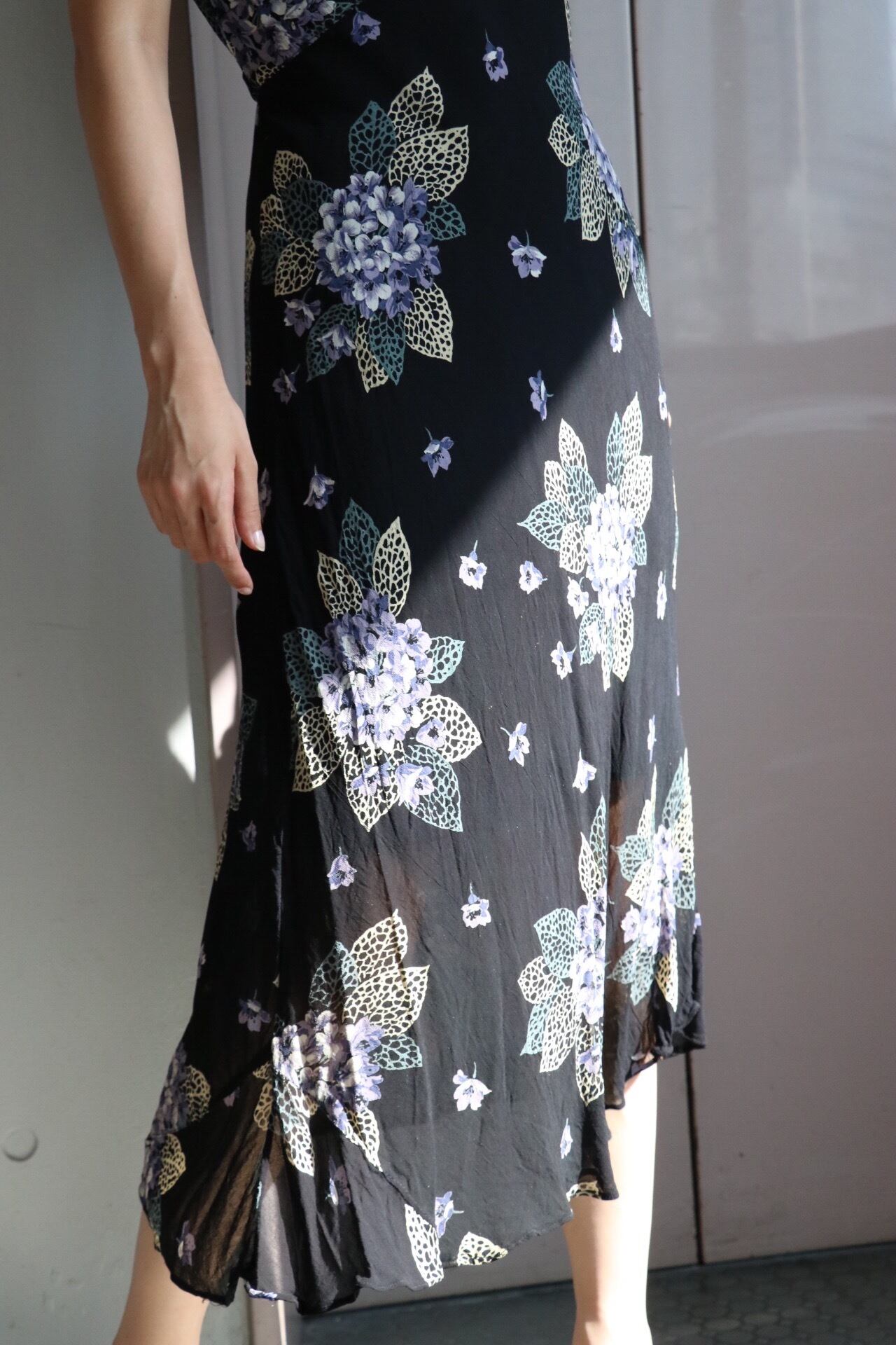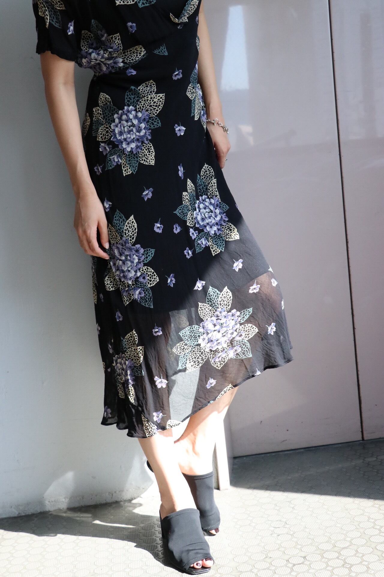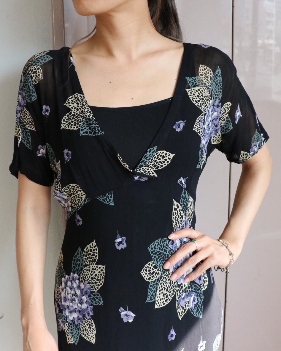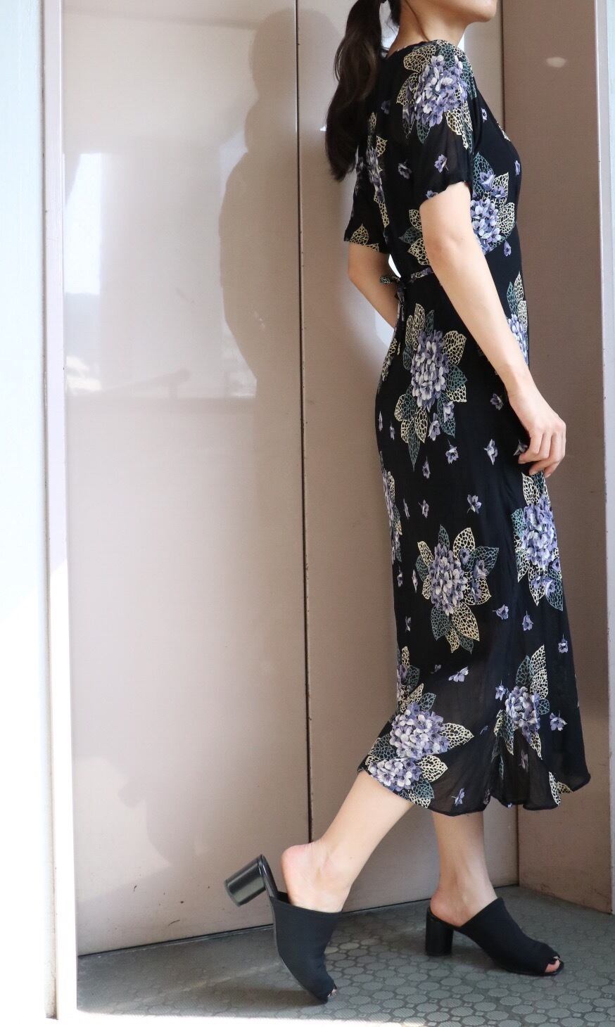 花柄の甘めな印象が苦手という方にオススメなシフォンワンピース。こちらは、ブラックベースに落ち着いた色味の花々が咲き、大きく開いたネックラインと透け感がセンシュアルな大人のレディを演出します。一枚で着るのはもちろんデニム等を合わせたレイヤードスタイルもオススメです!
