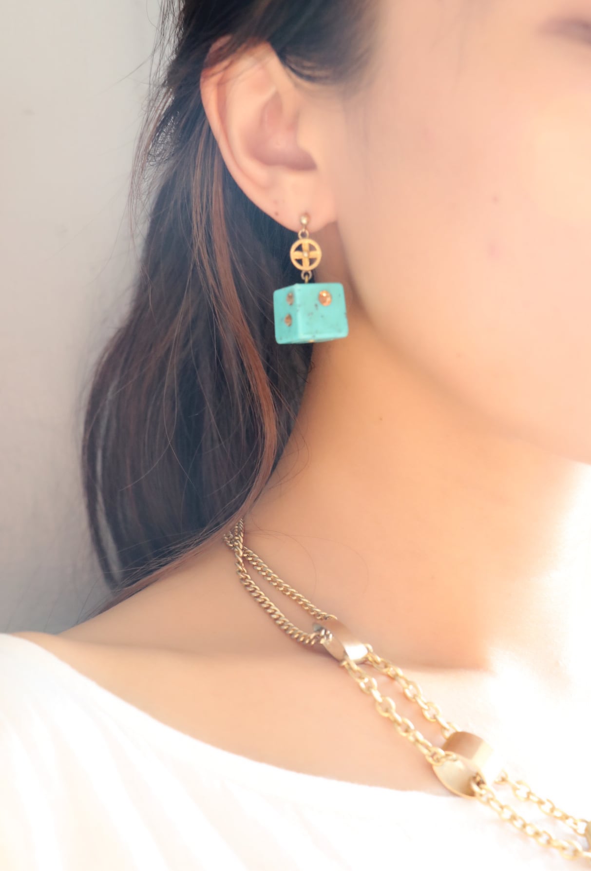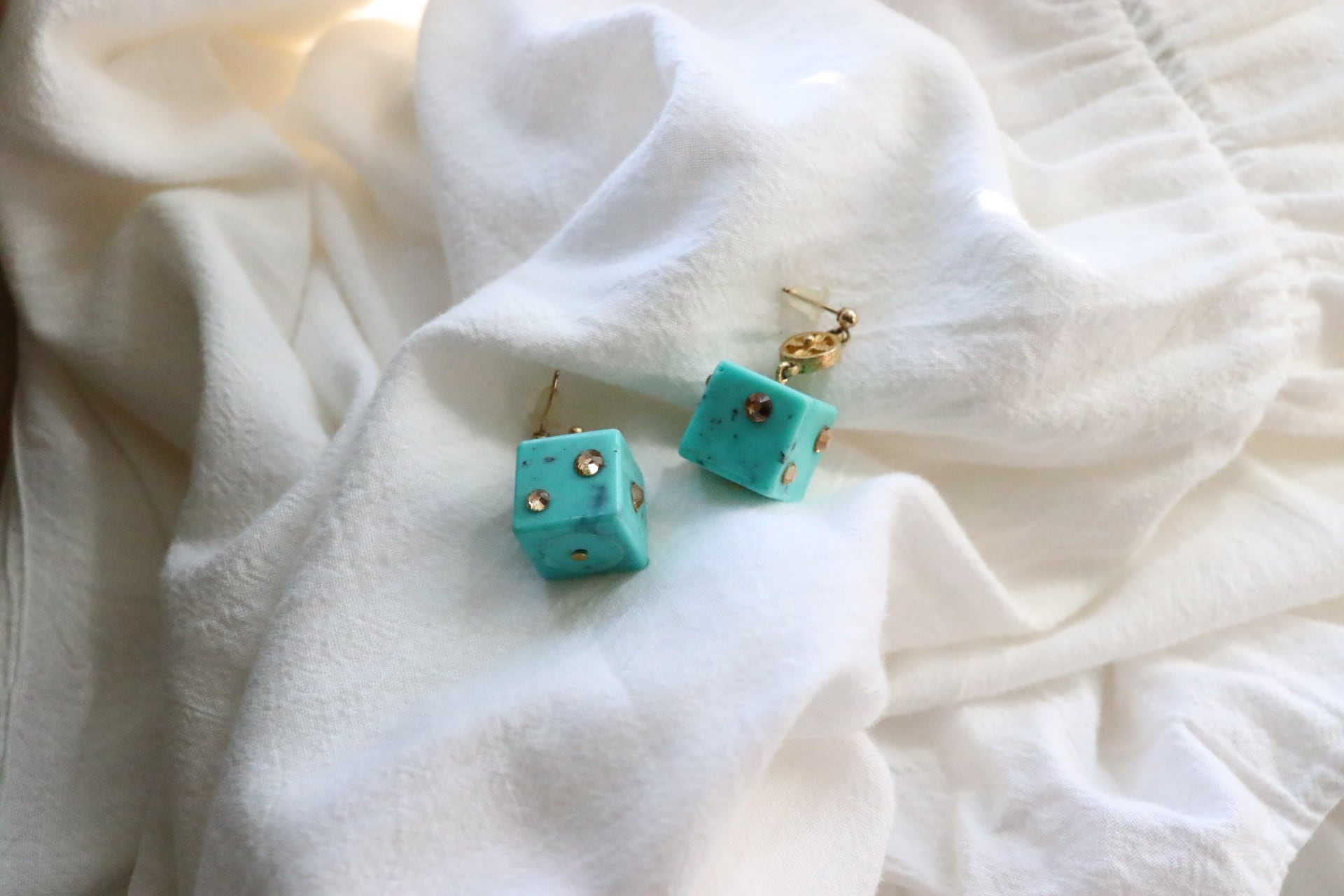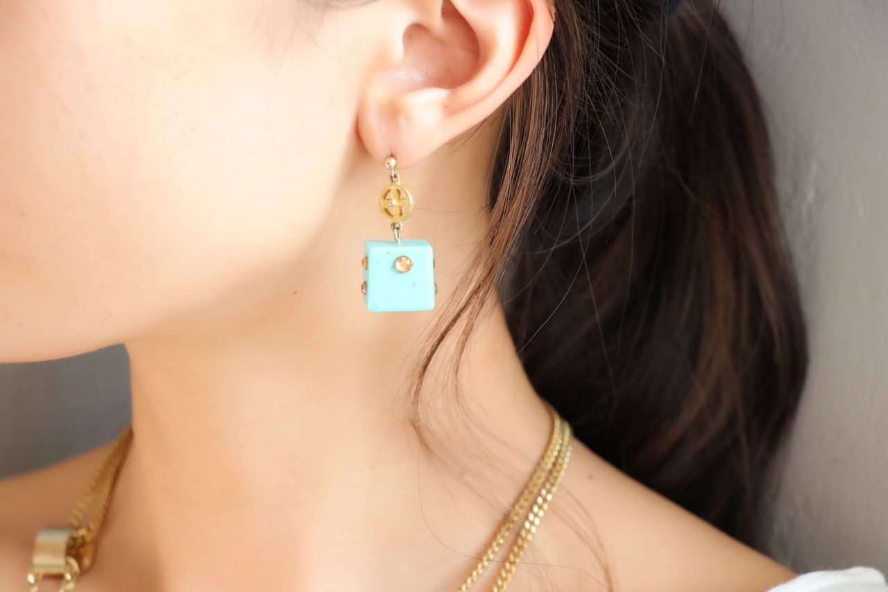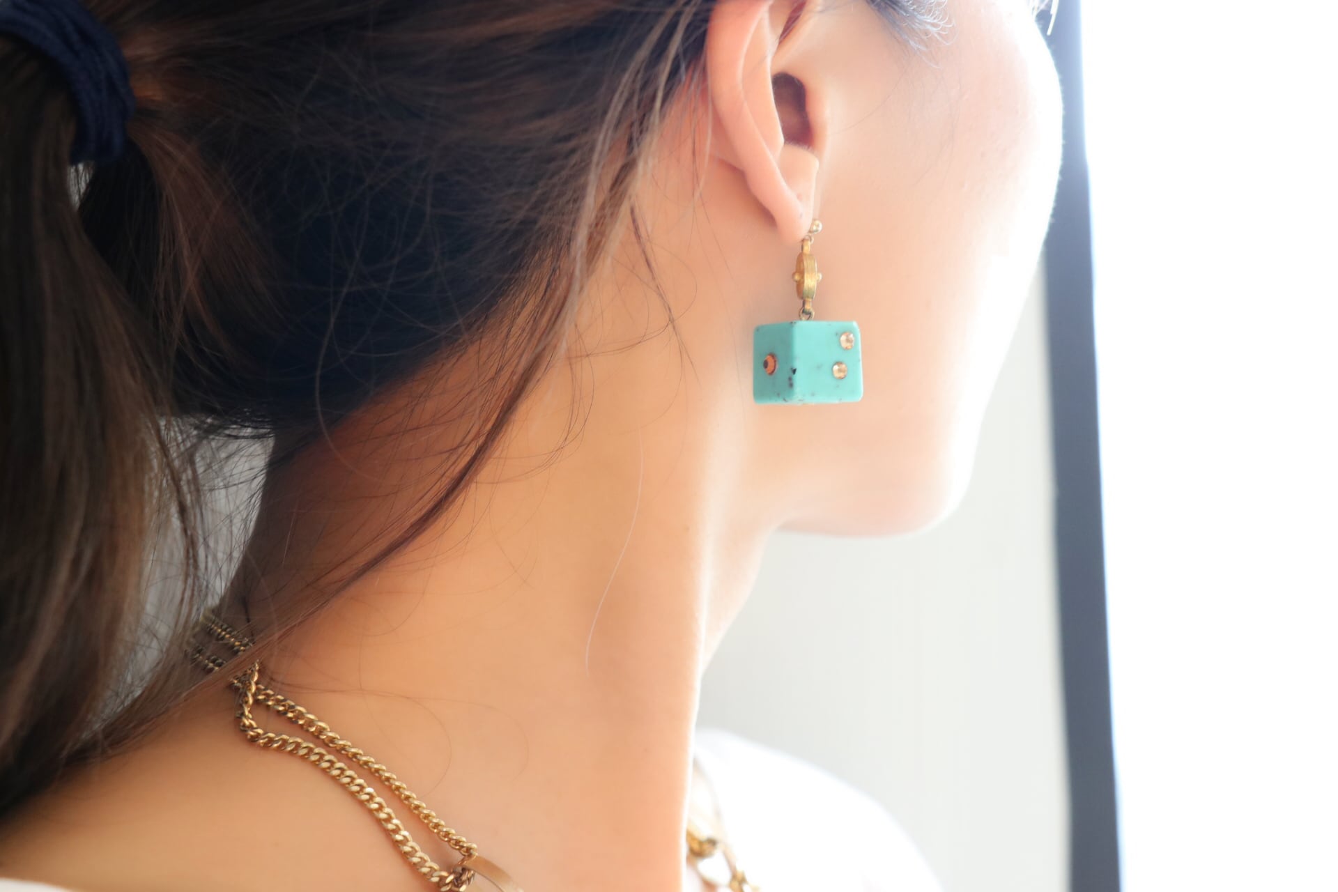 チョコミントアイスのようなキューブに飴色のラインストーンがダイスのように散りばめられたデザインは涼しげでさりげないアクセントに。