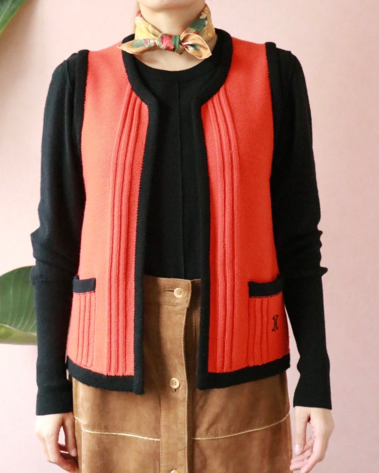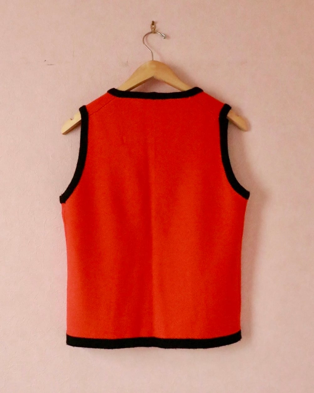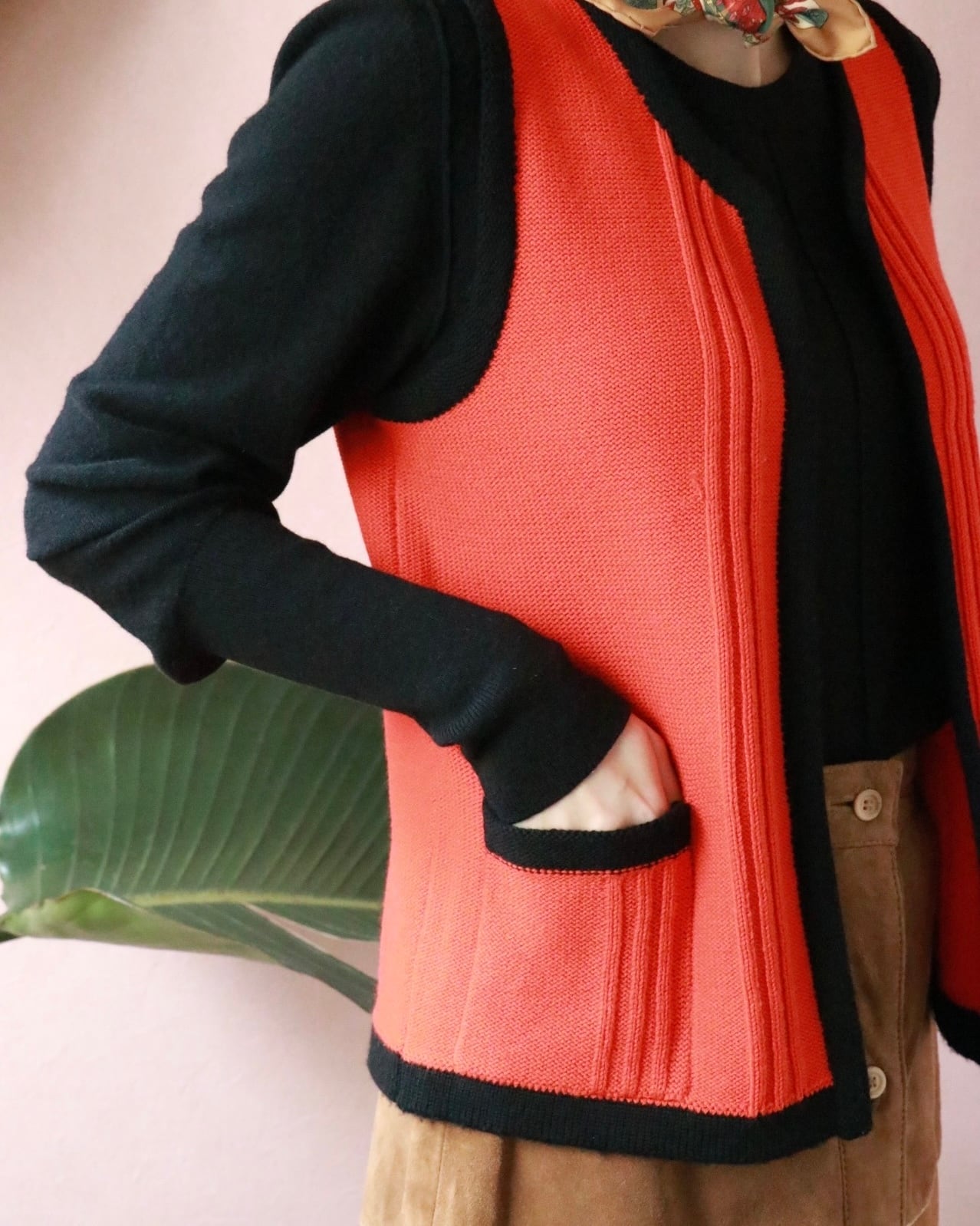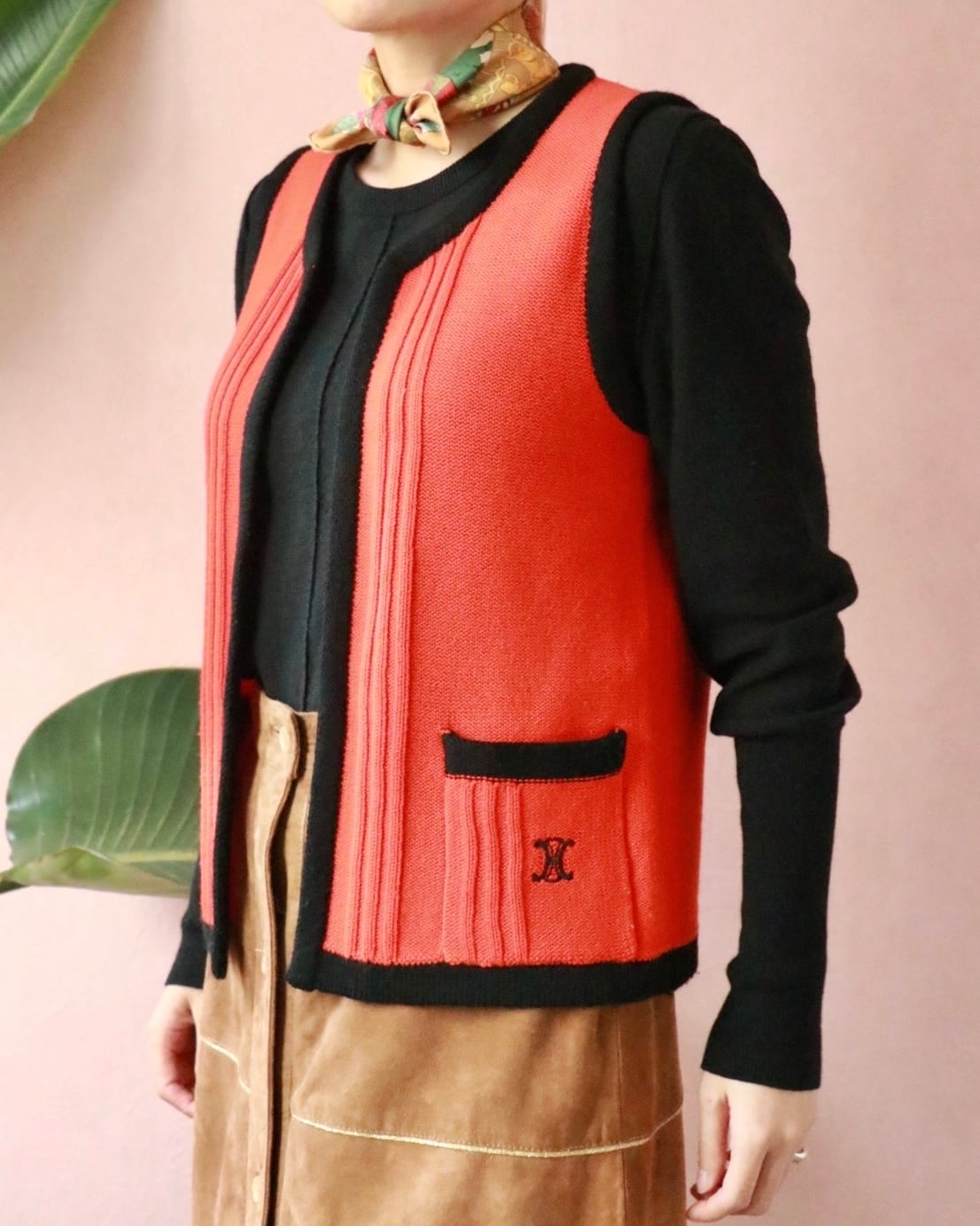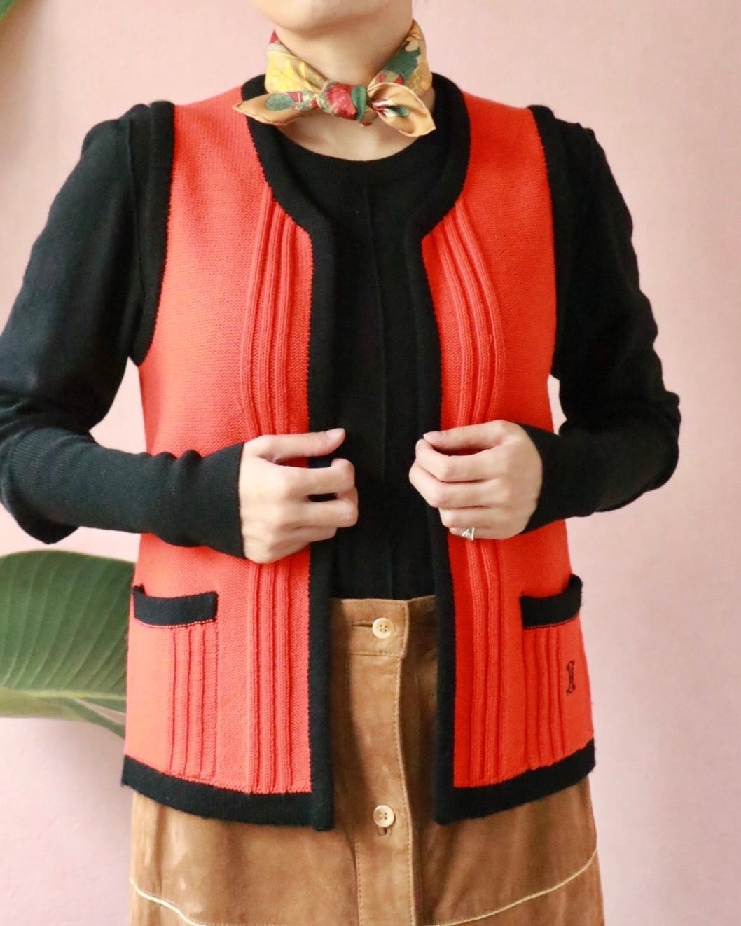 ビビッドなオレンジカラーが目を引くウールニットジレ。