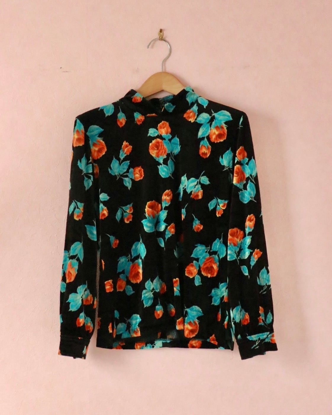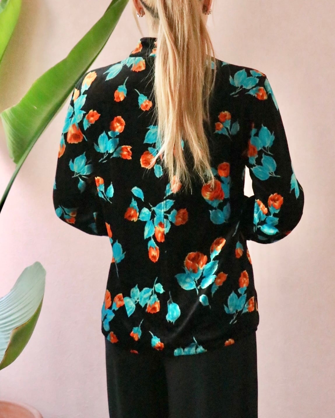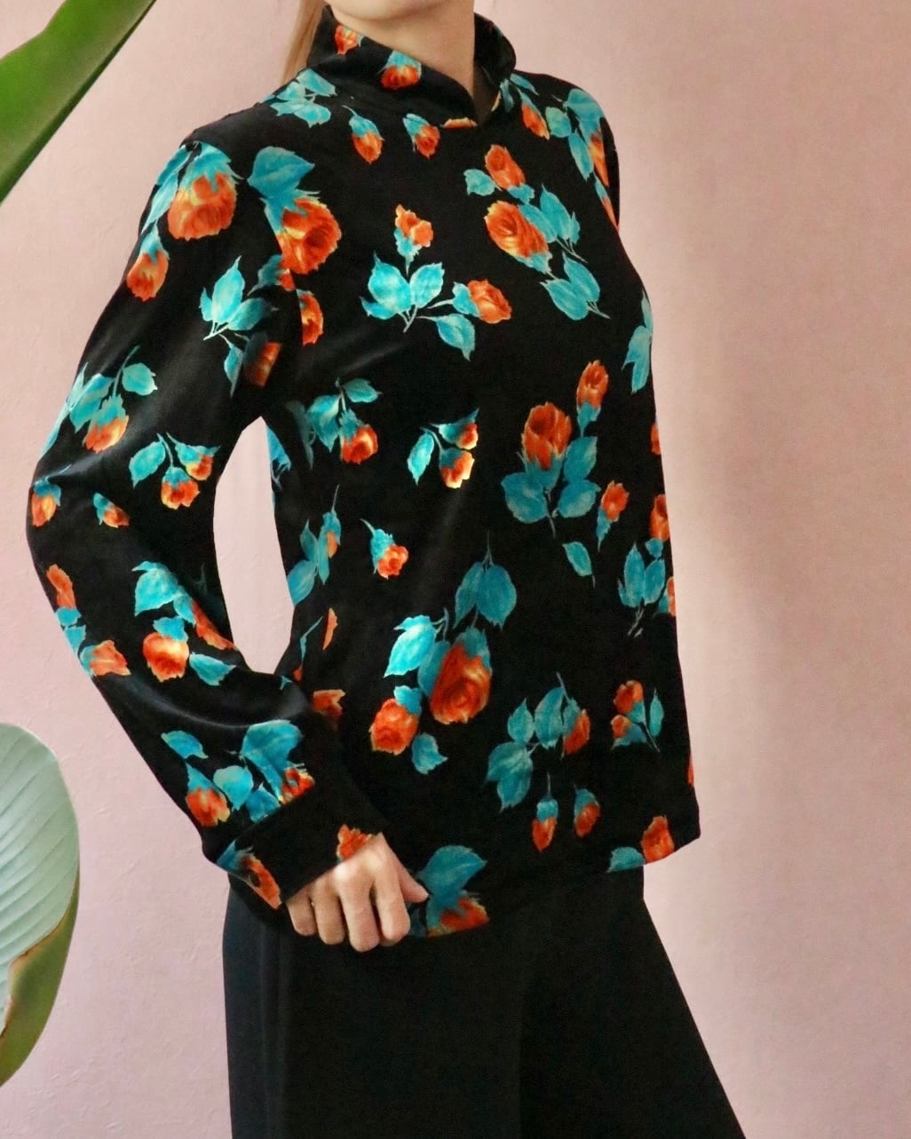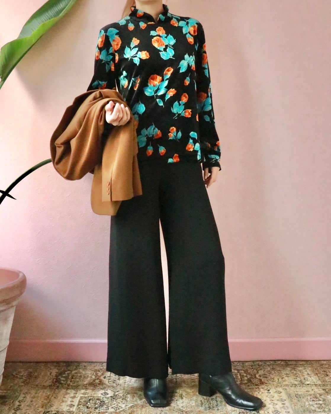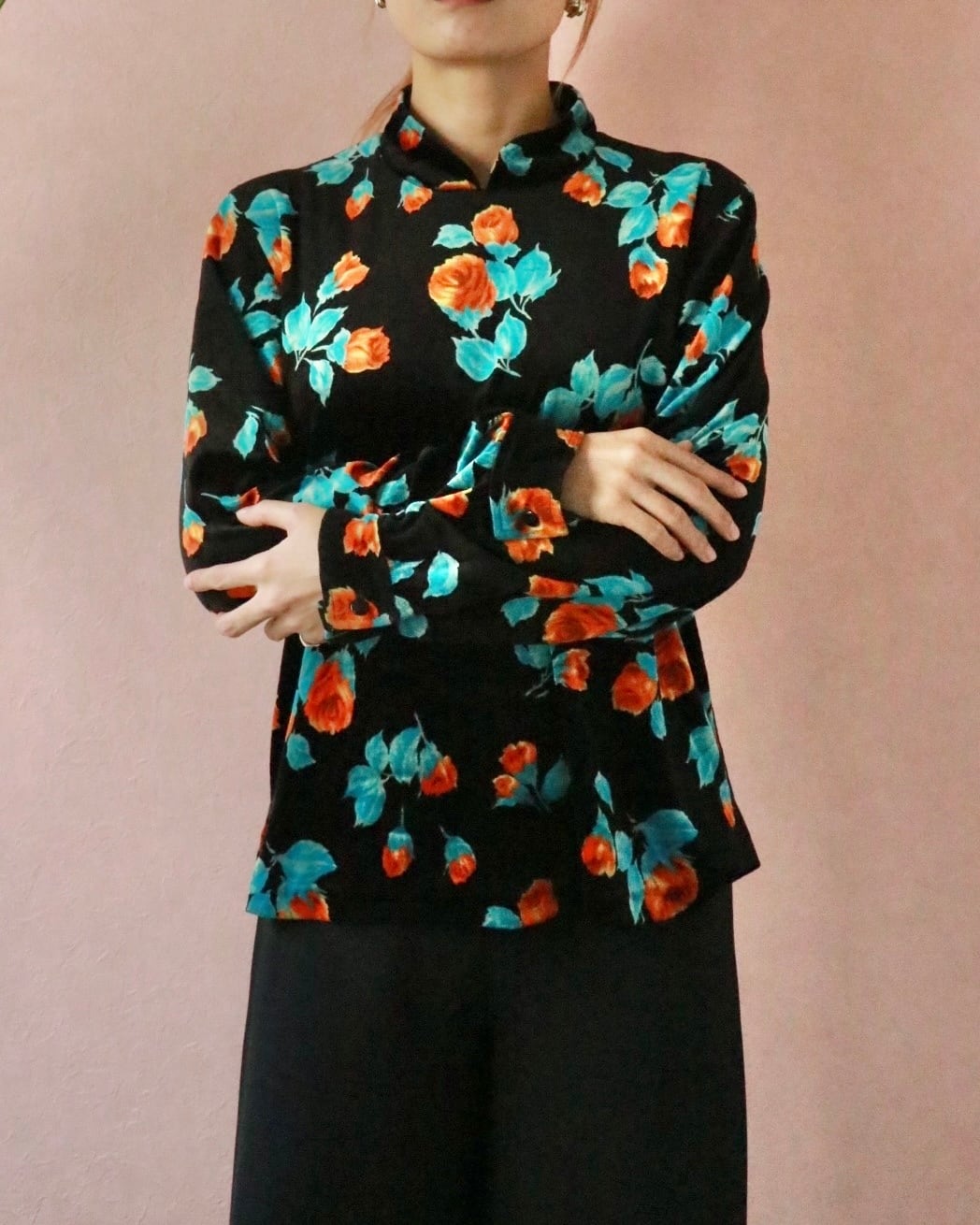 柔らかな光沢を放つベロア生地に、ウンガロらしい鮮やかなフローラルが咲き誇る一枚。深みのあるブラックにターコイズとオレンジの花柄が映え、華やかさと大人の余裕を同時に叶えてくれます。デイリーからオケージョンまで幅広く着られるトップスです。