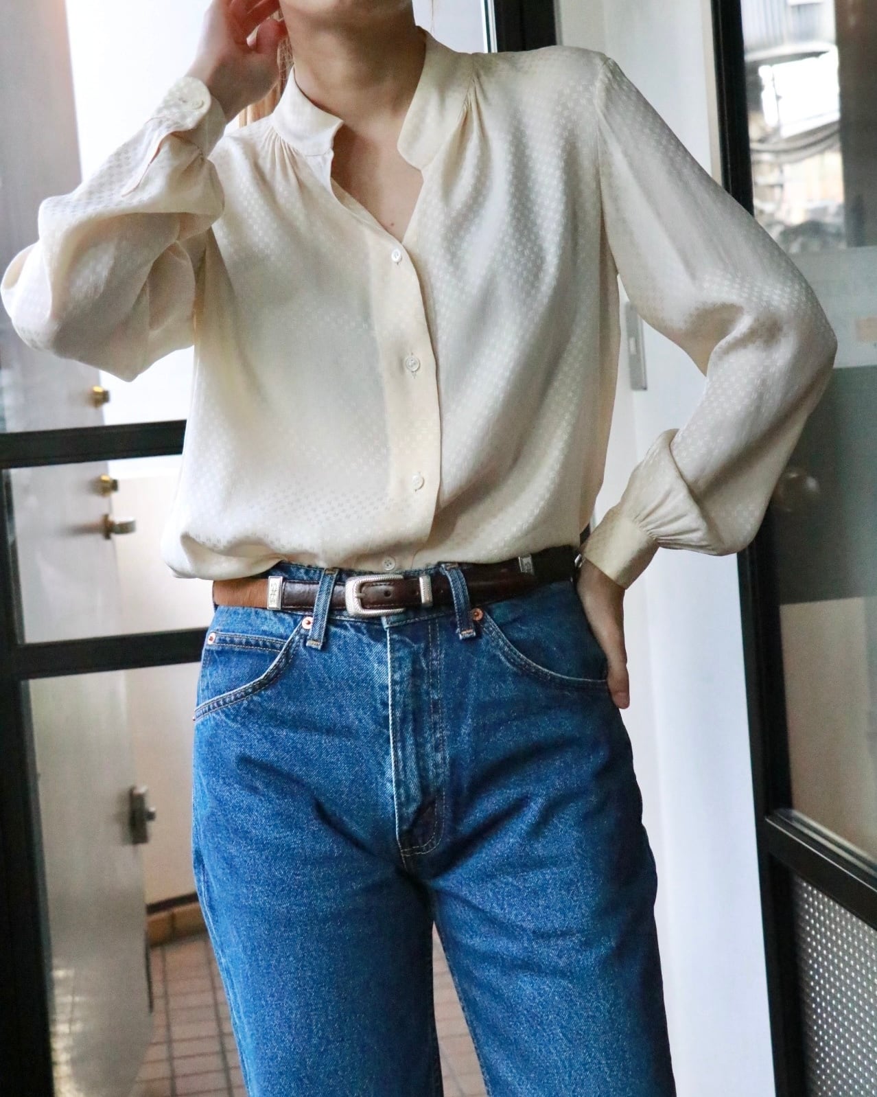 とろみと艶のあるシルクで女性らしいしなやかな輪郭をつくりつつ、スタンドカラーのマニッシュな要素をはらんだデザイン。