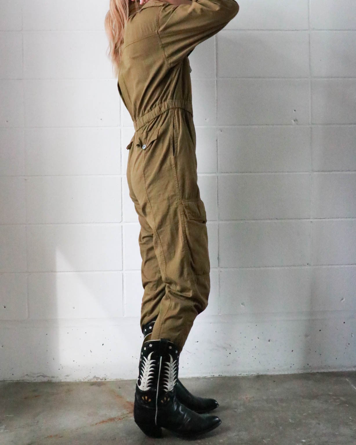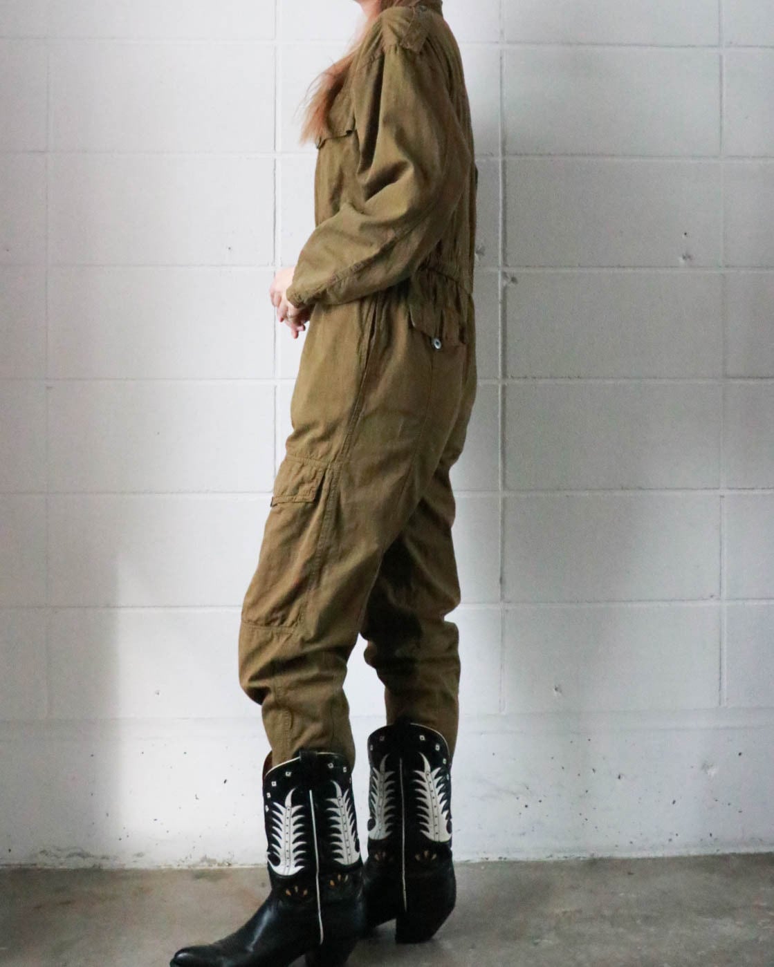 シンプルなシルエットと綿素材でからだのラインをゆるやかに拾う感じでリラックスして着れる一着。エポレットがついていたりミリタリー要素も随所にありカジュアルな印象が強めです。