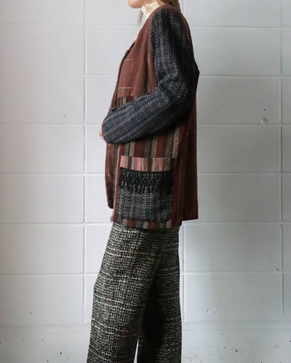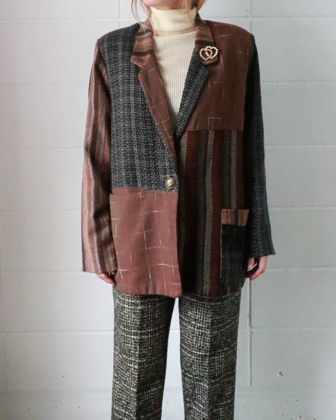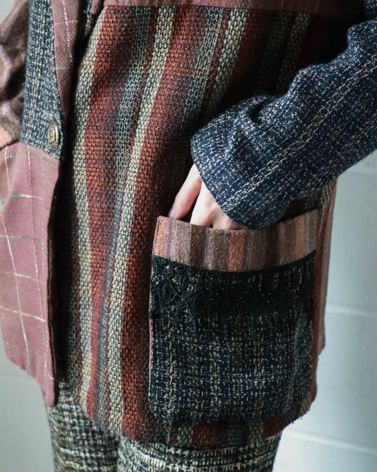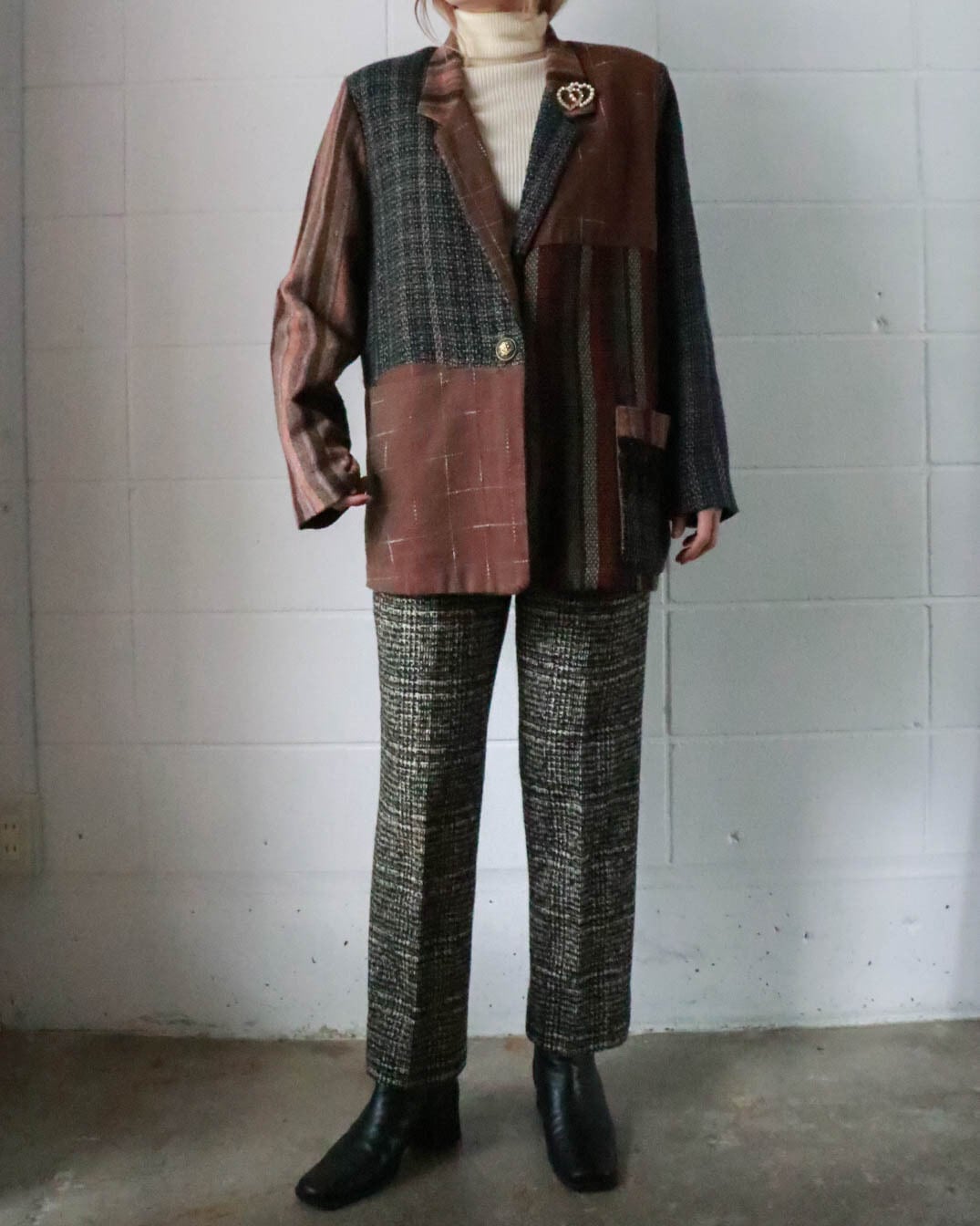 様々な素材の組み合わせがユニークなヴィンテージジャケットが入荷。マルチカラーのおかげで、インナーやボトムズにも合わせやすい。ゆったりサイズで肌寒い季節にラフに着こなせます。