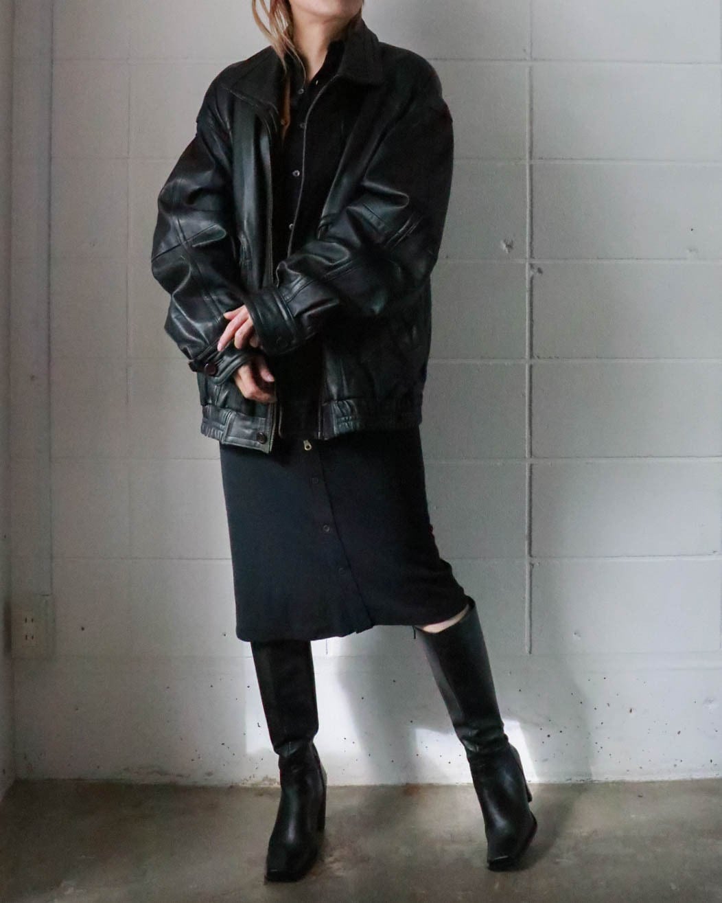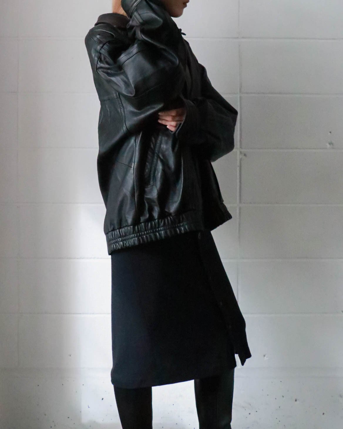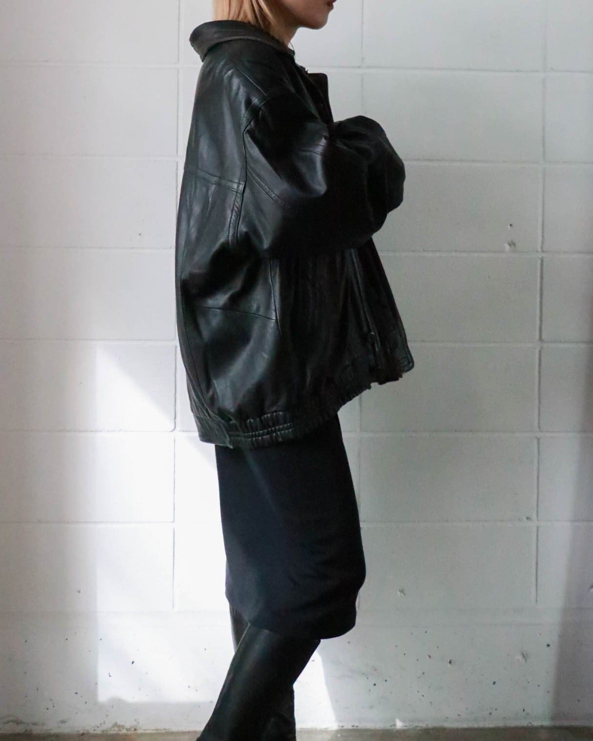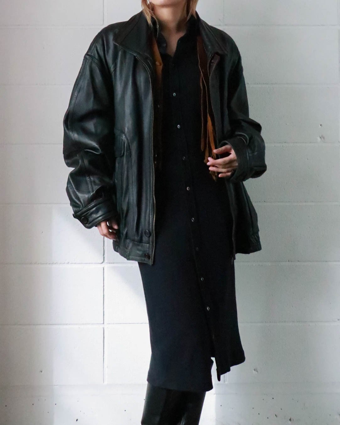 ヴィンテージのレザーブルゾンが入荷。オーバーサイズのシルエットが今っぽく、さっと羽織るだけでこなれた印象に。オールブラックに襟元やポケットにブラウンレザーを組み合わせたデザインがさりげないアクセント。ベーシックカラーのゆったりアウターはインナーも合わせやすく、AWシーズン大活躍すること間違いなし。