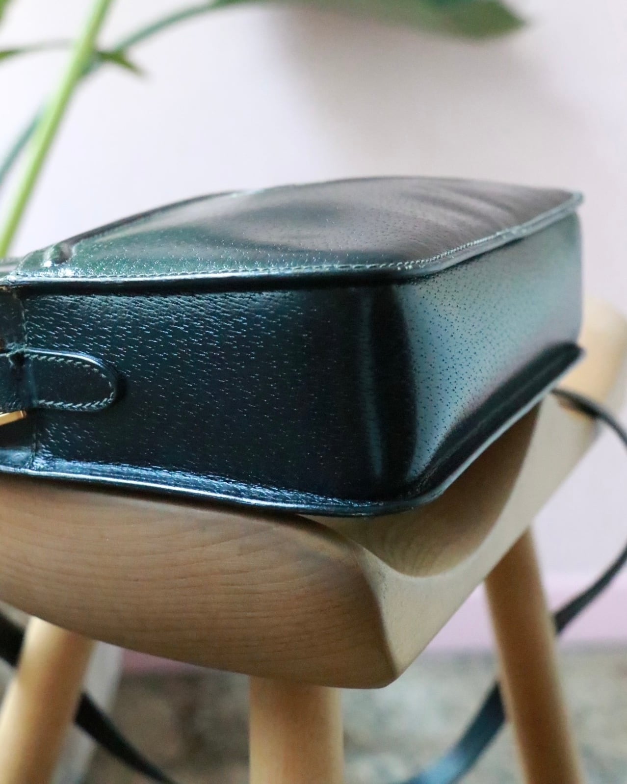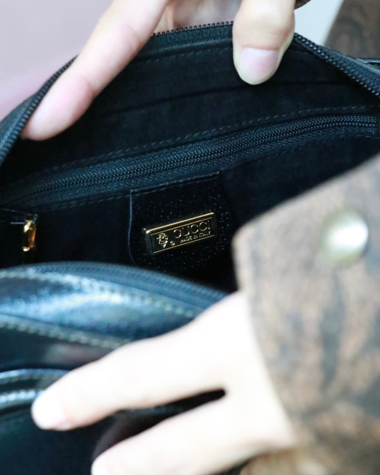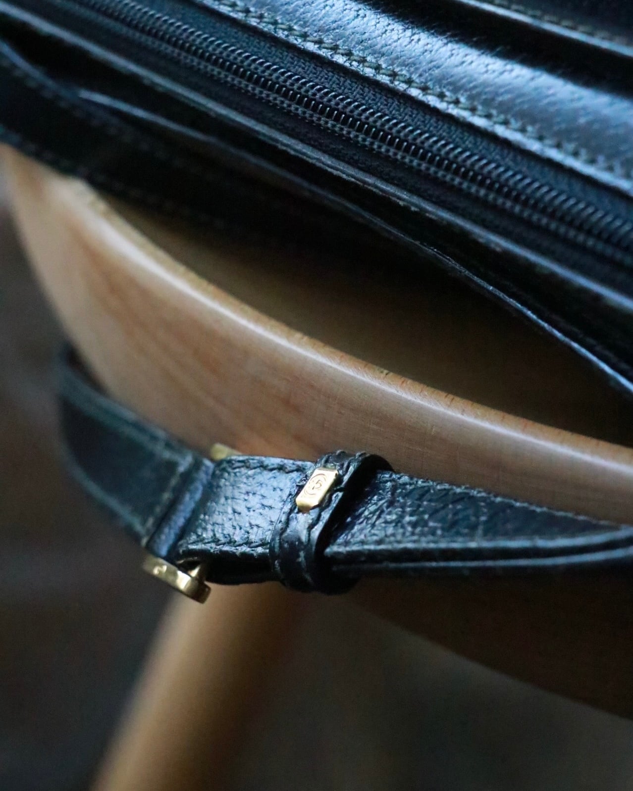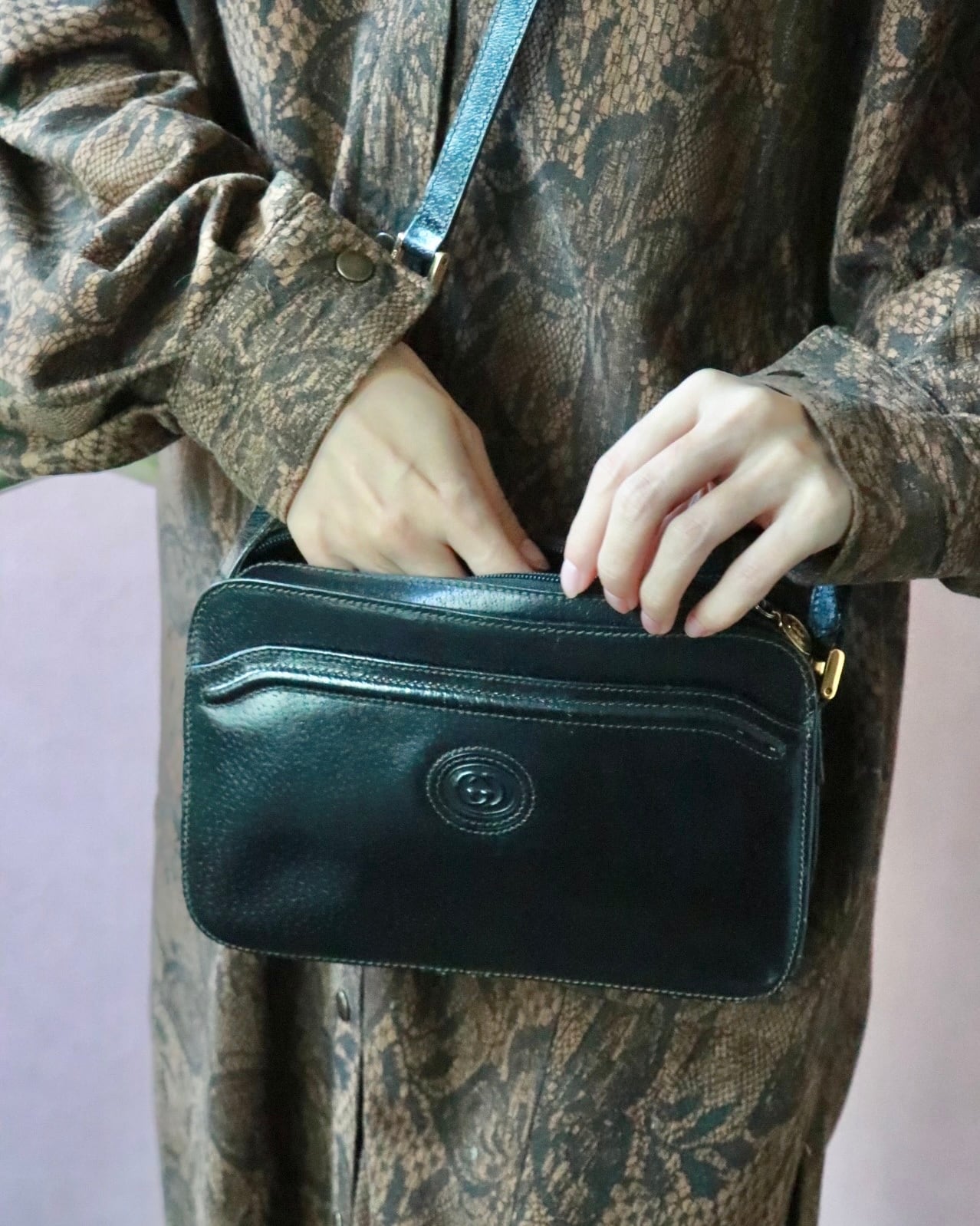 品のいい型押しレザーを使用したオールドグッチのブラックカラーショルダーバッグ。ロゴも型押しで主張しすぎずコーディネートに馴染みやすいので応用力抜群。レザーが柔らかい分収納力も高く、外と中にポケット付。