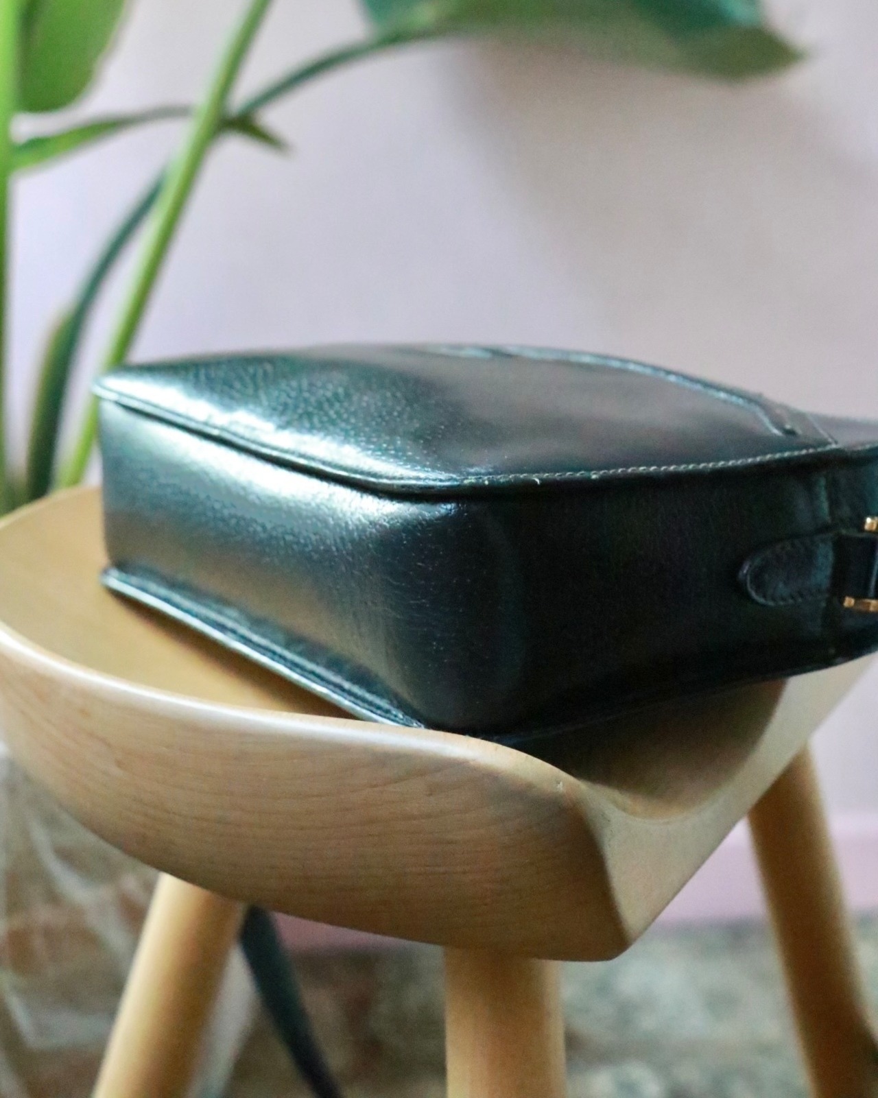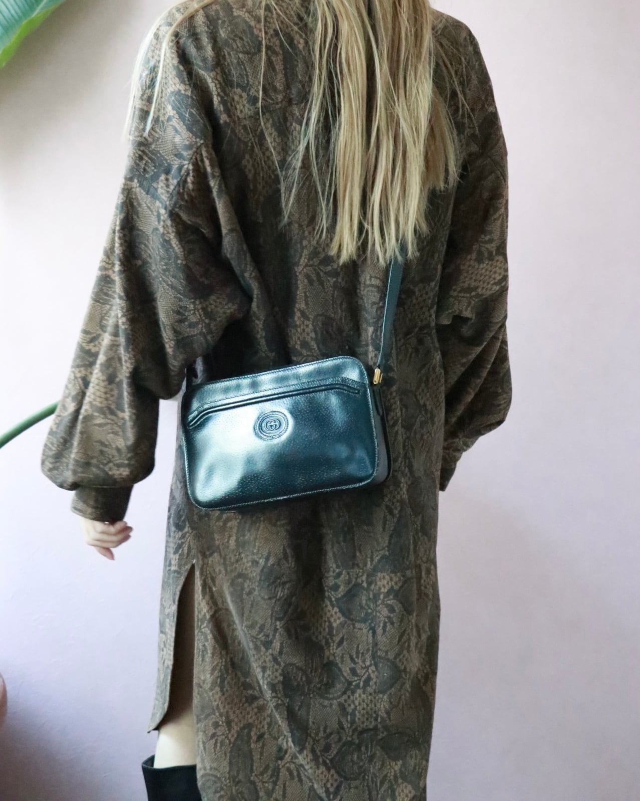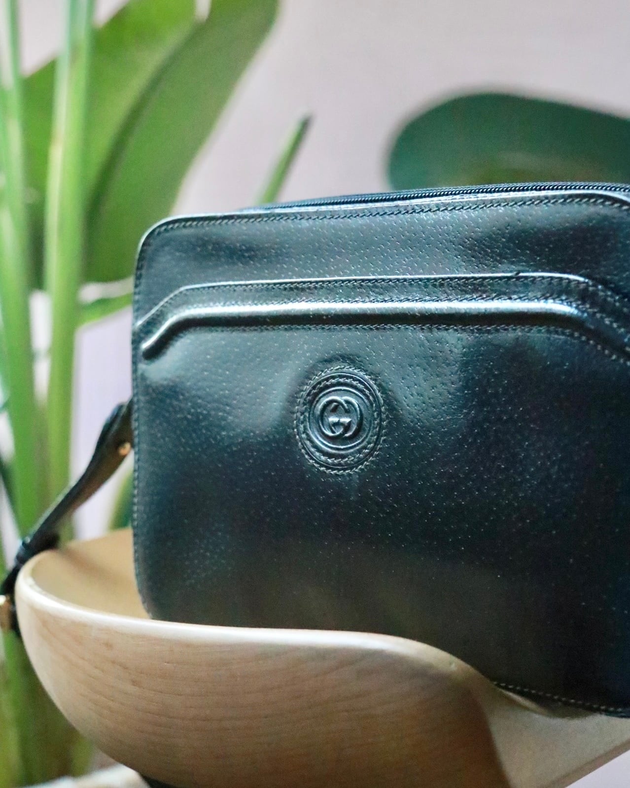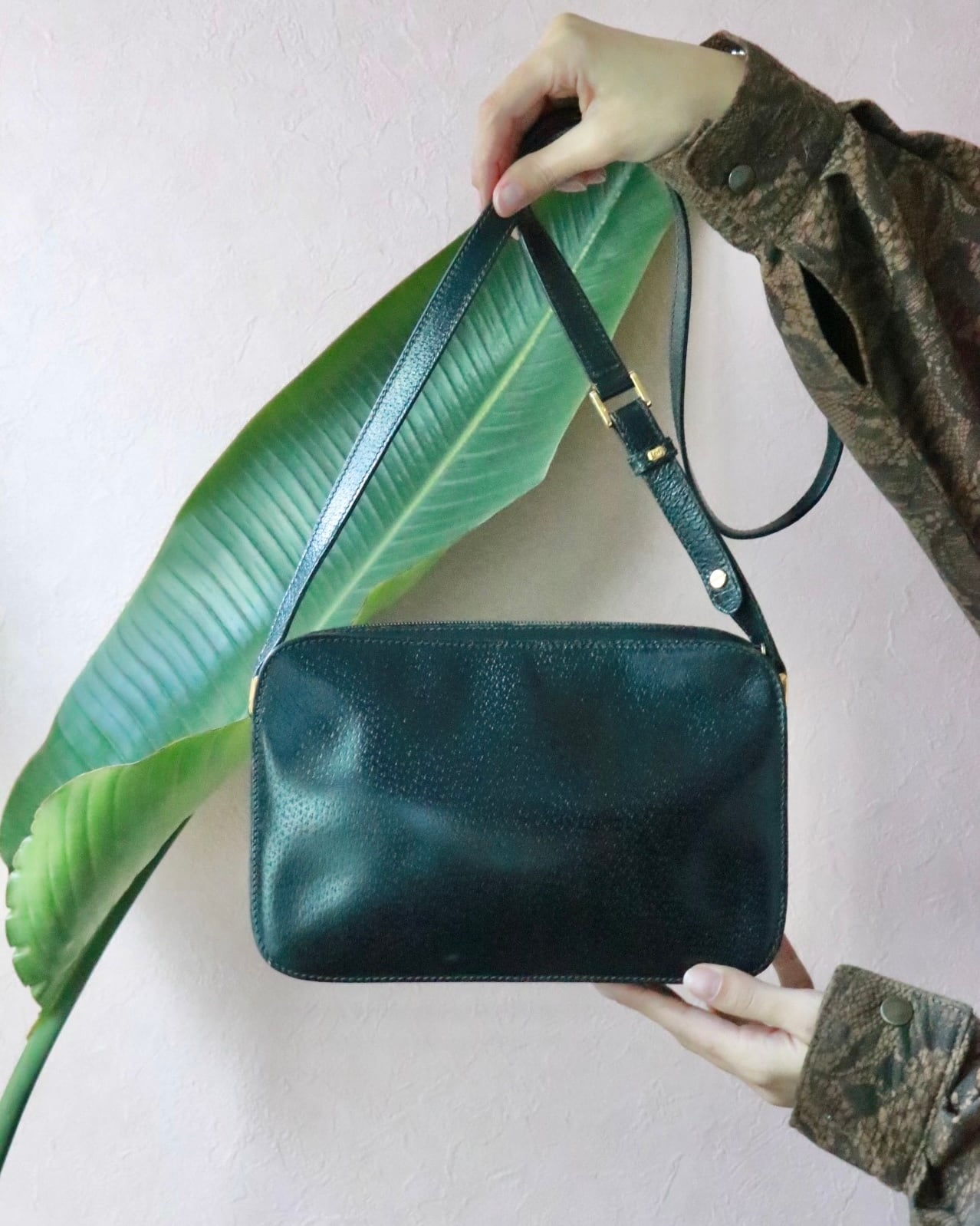 品のいい型押しレザーを使用したオールドグッチのブラックカラーショルダーバッグ。ロゴも型押しで主張しすぎずコーディネートに馴染みやすいので応用力抜群。レザーが柔らかい分収納力も高く、外と中にポケット付。