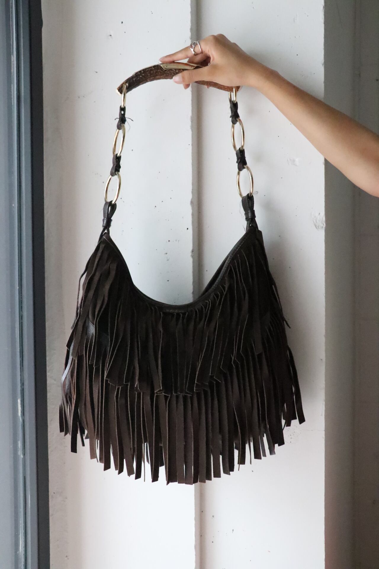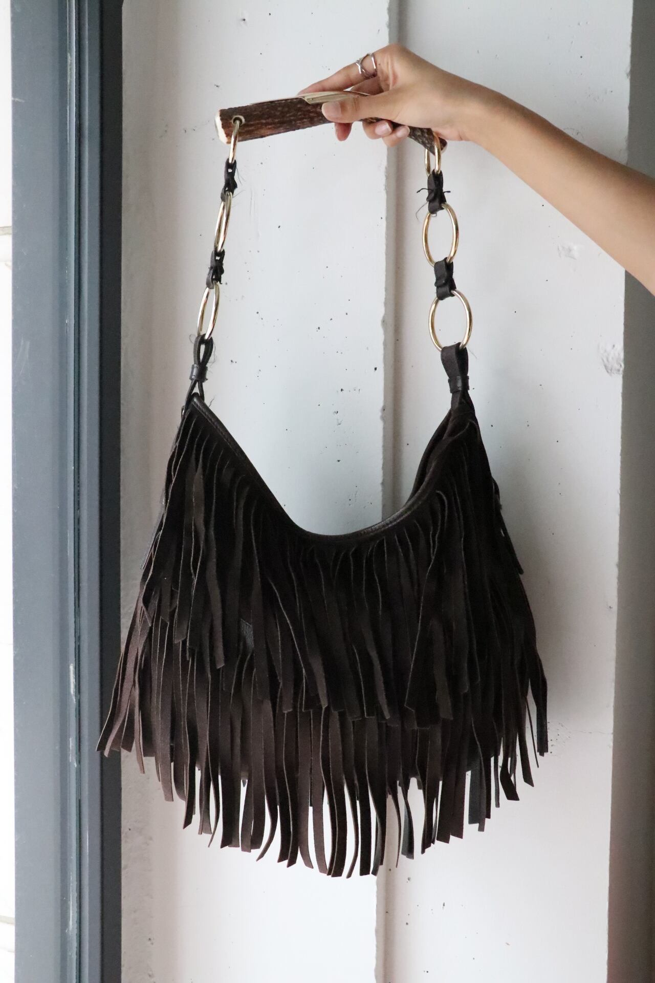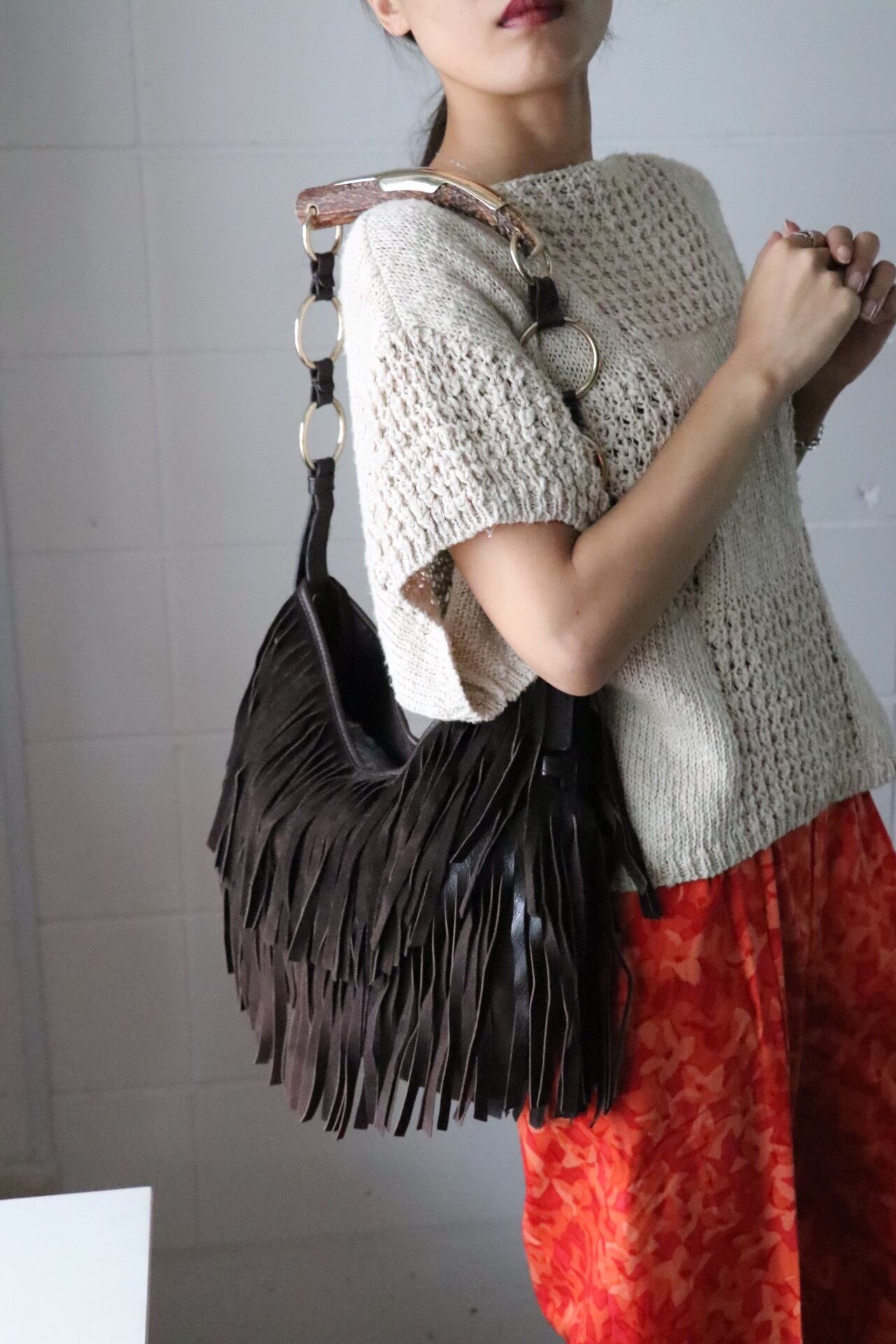 ボディーはダークブラウンのスエードフリンジはダークカラーながらも動きのあるバッグ
