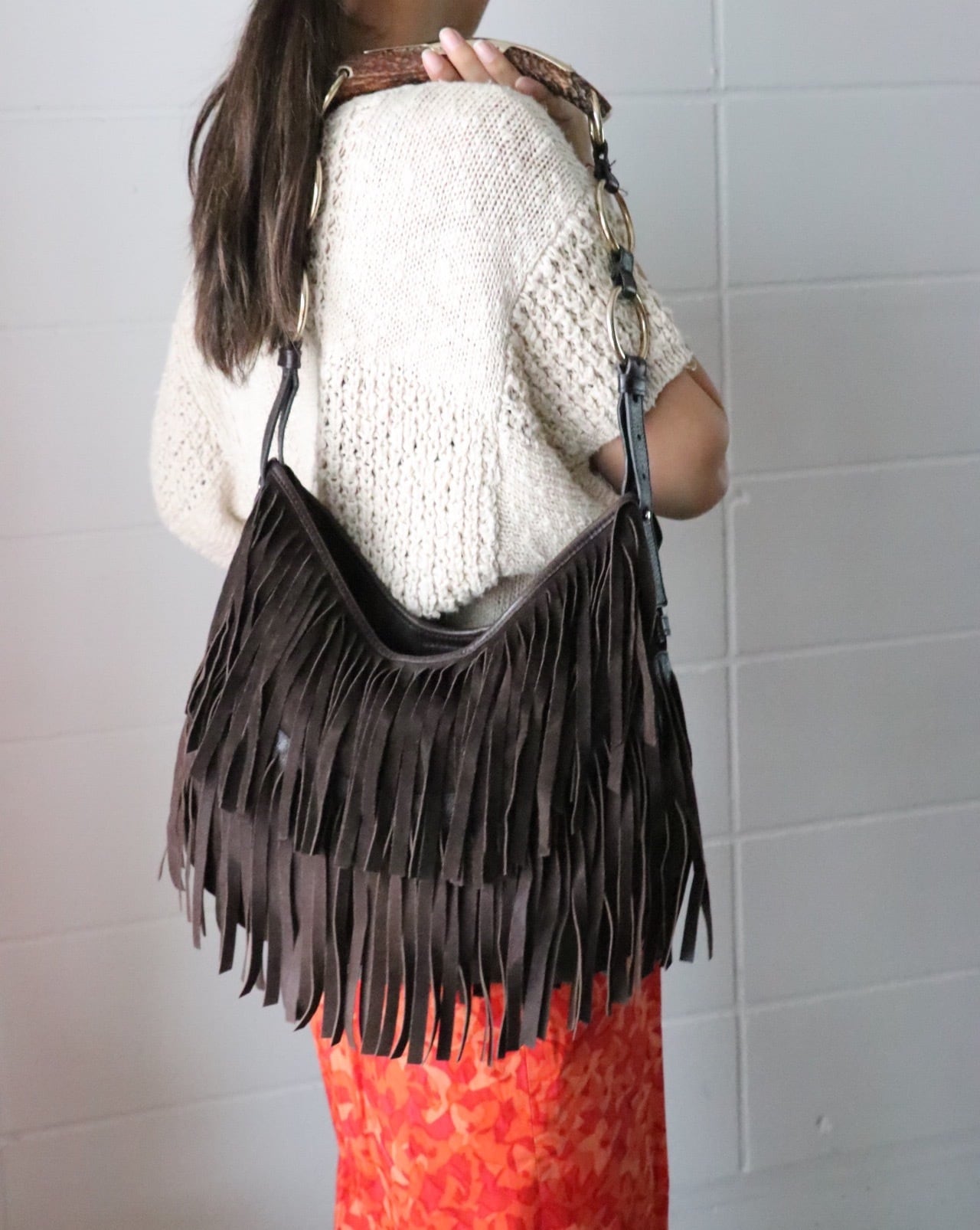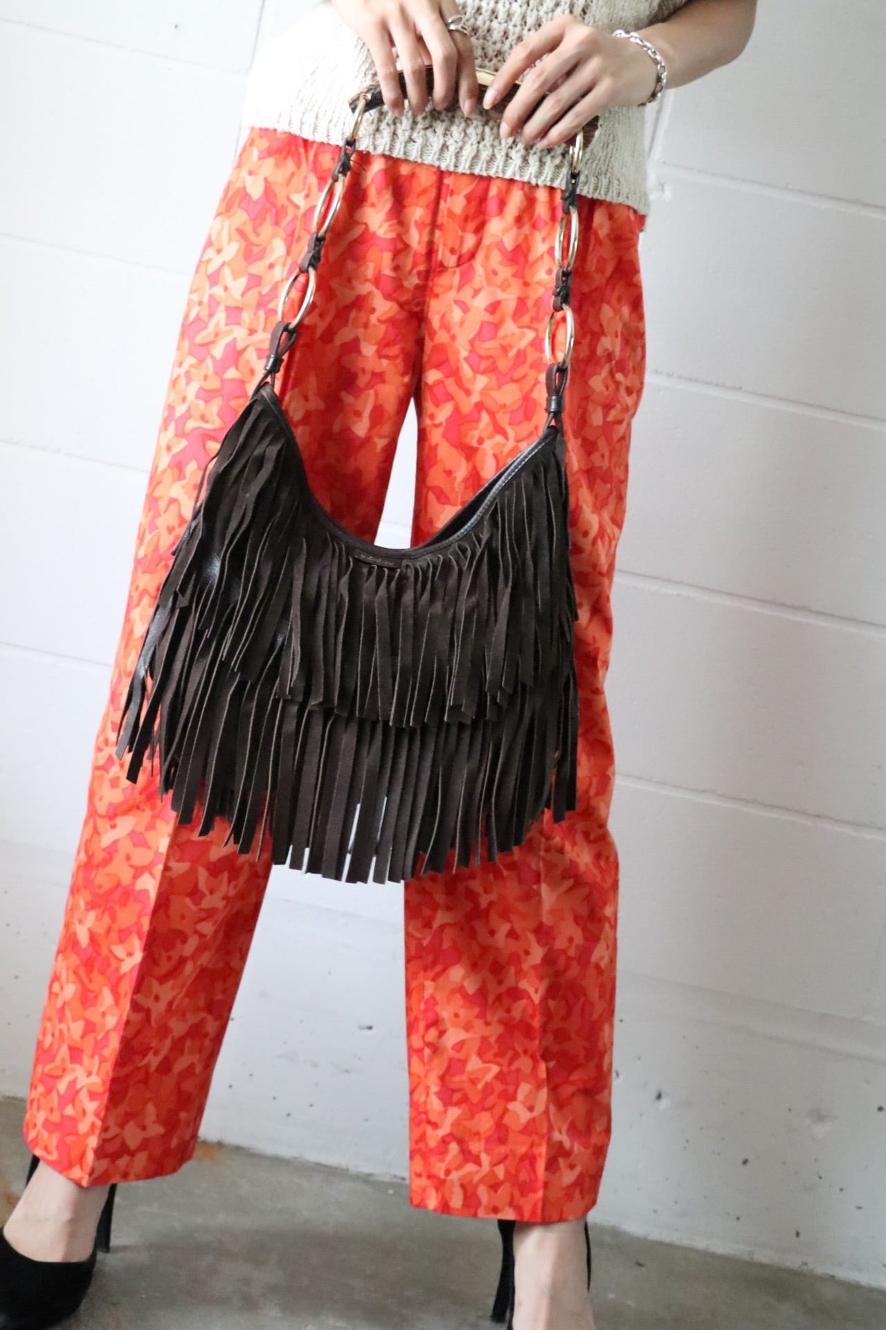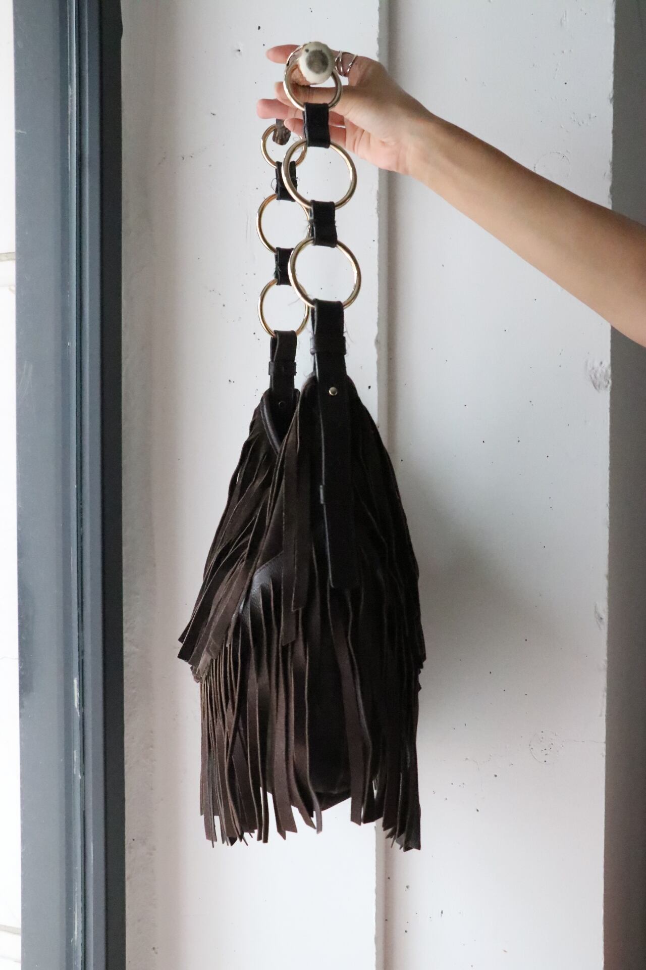 ボディーはダークブラウンのスエードフリンジはダークカラーながらも動きのあるバッグ